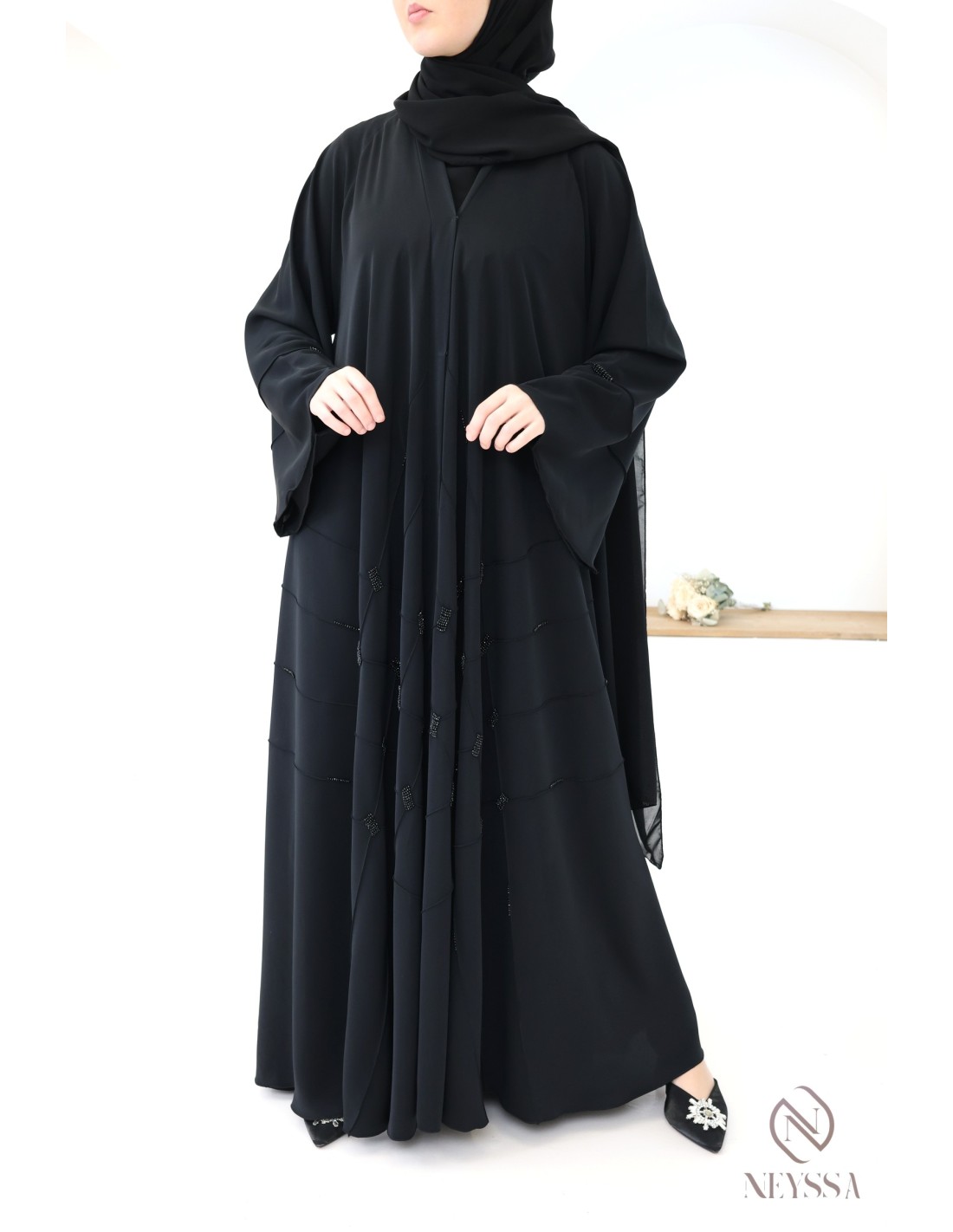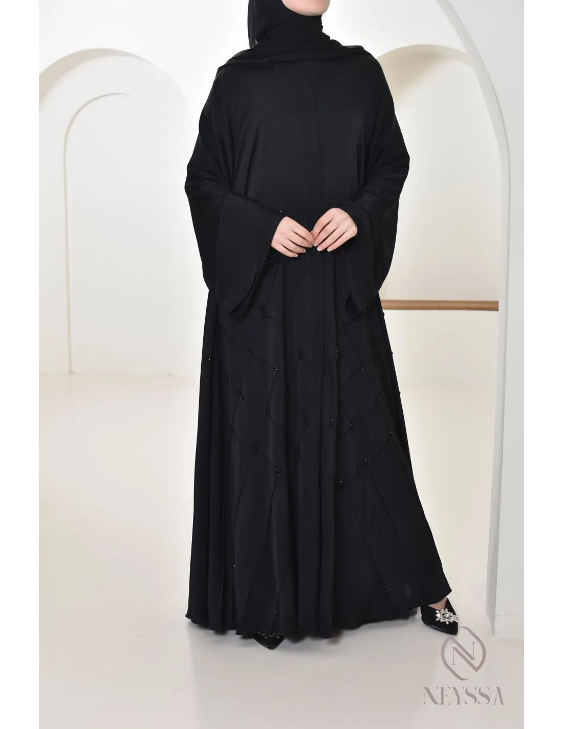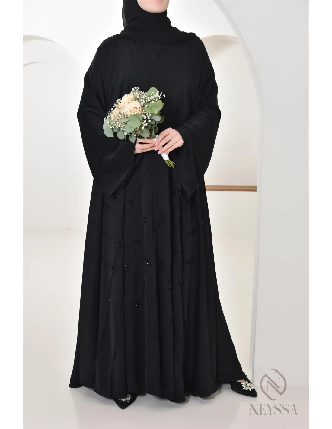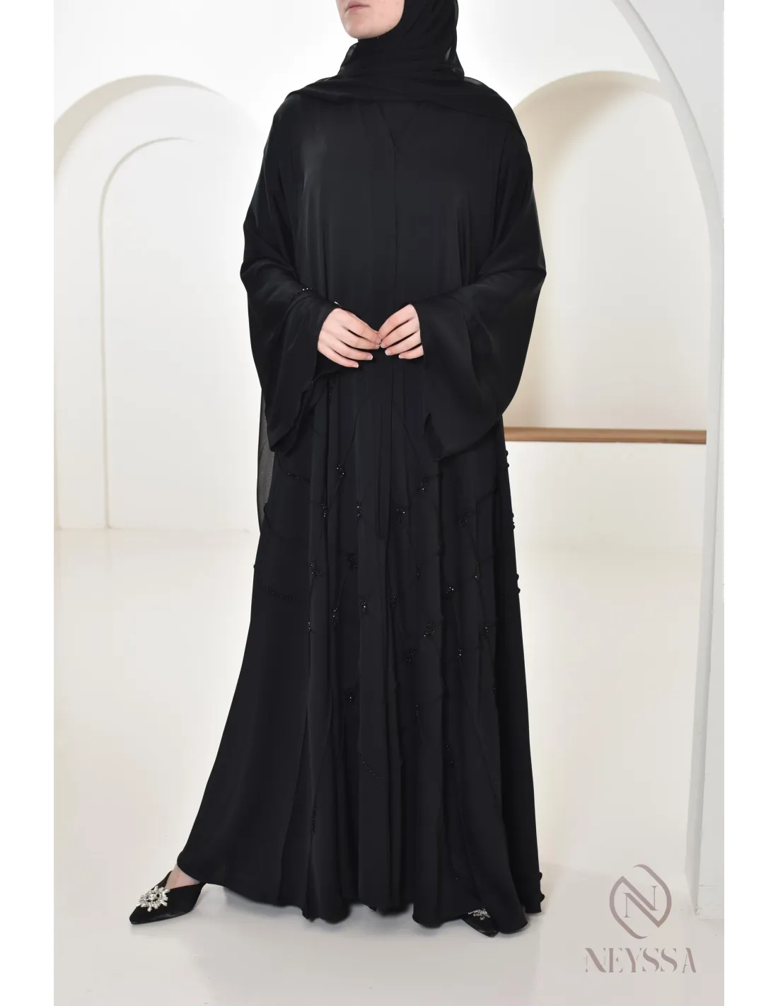 - Perfect personalized finishes: A silver Neyssa plaque is sewn onto the sleeve of the abaya.