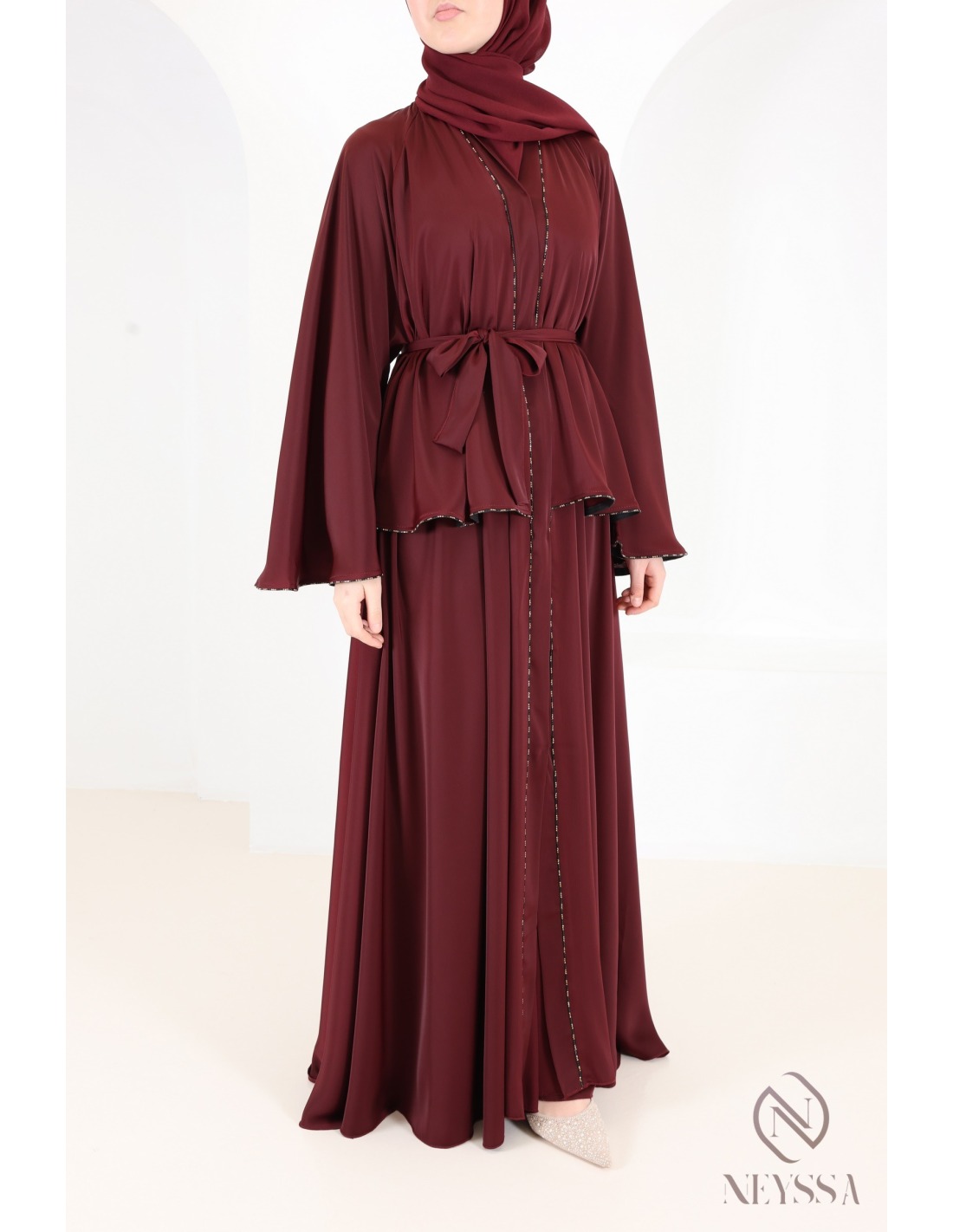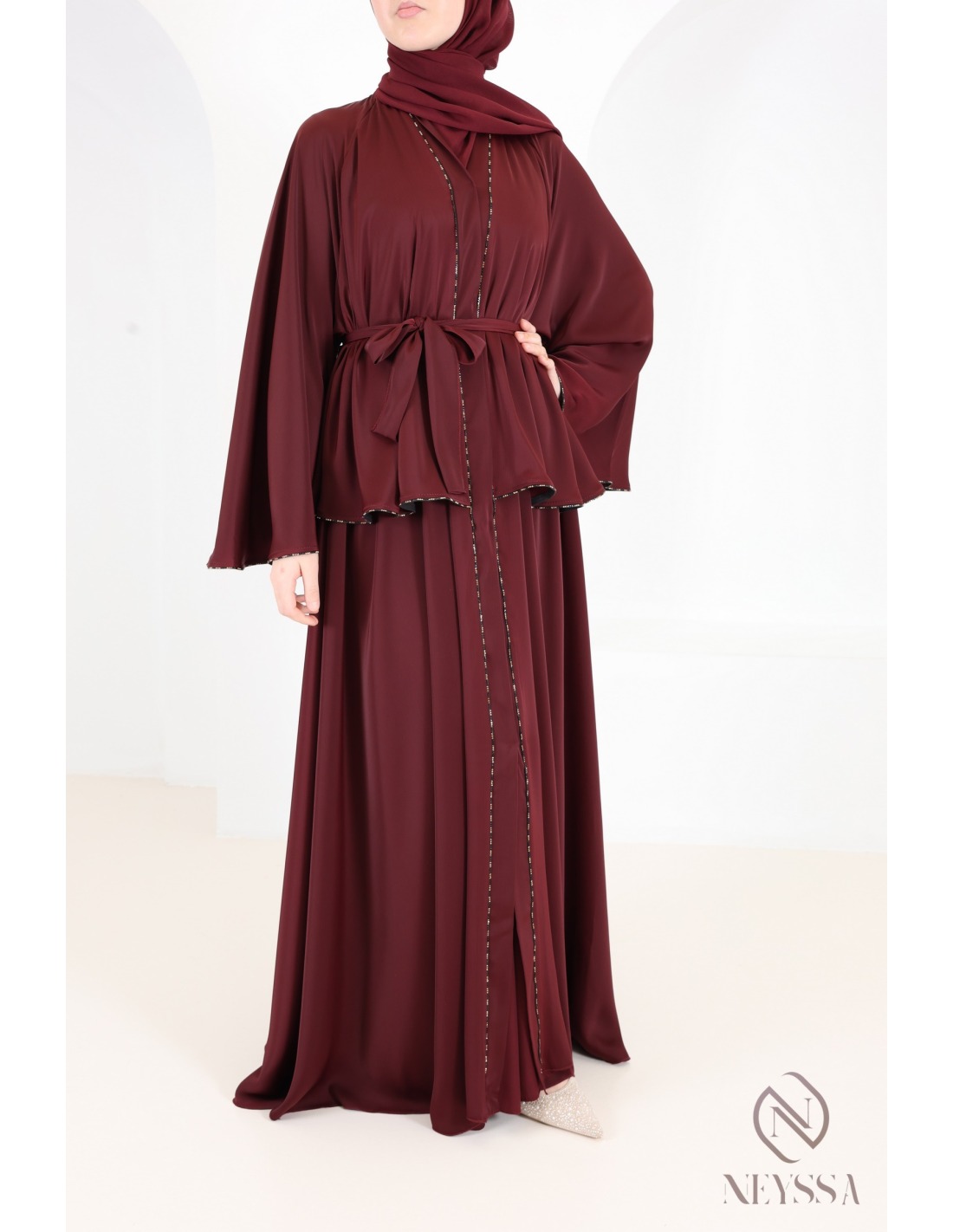 Bordeaux 3-Piece Dubai Kimono Abaya with Rhinestones and Ruffles
