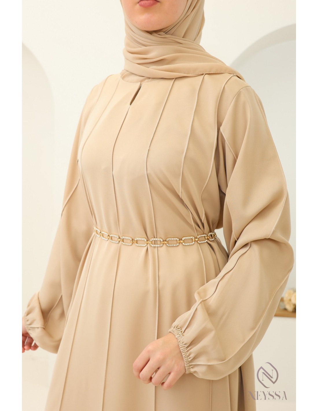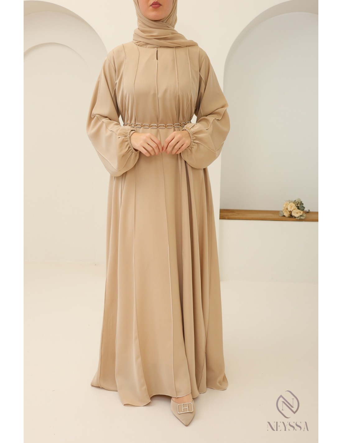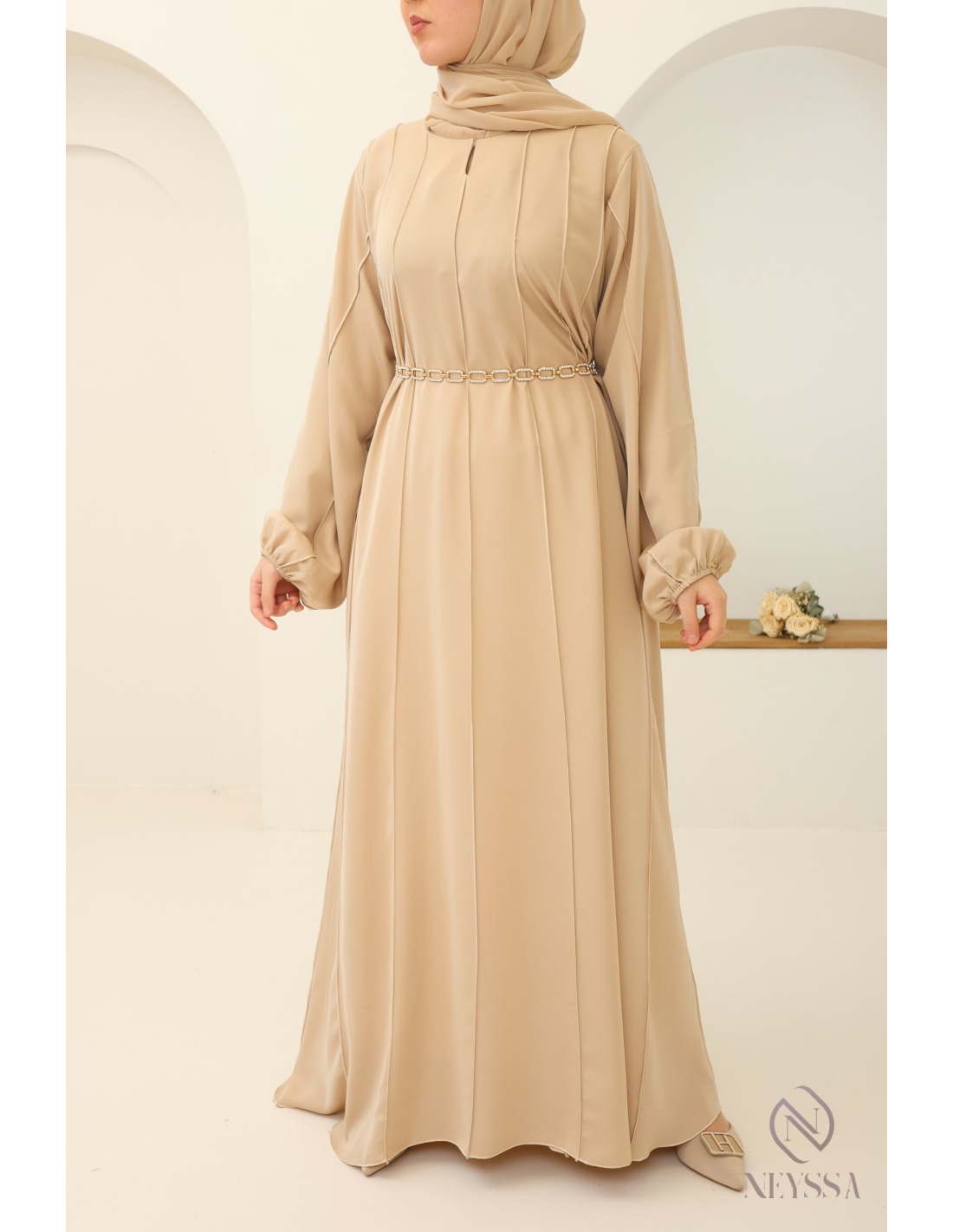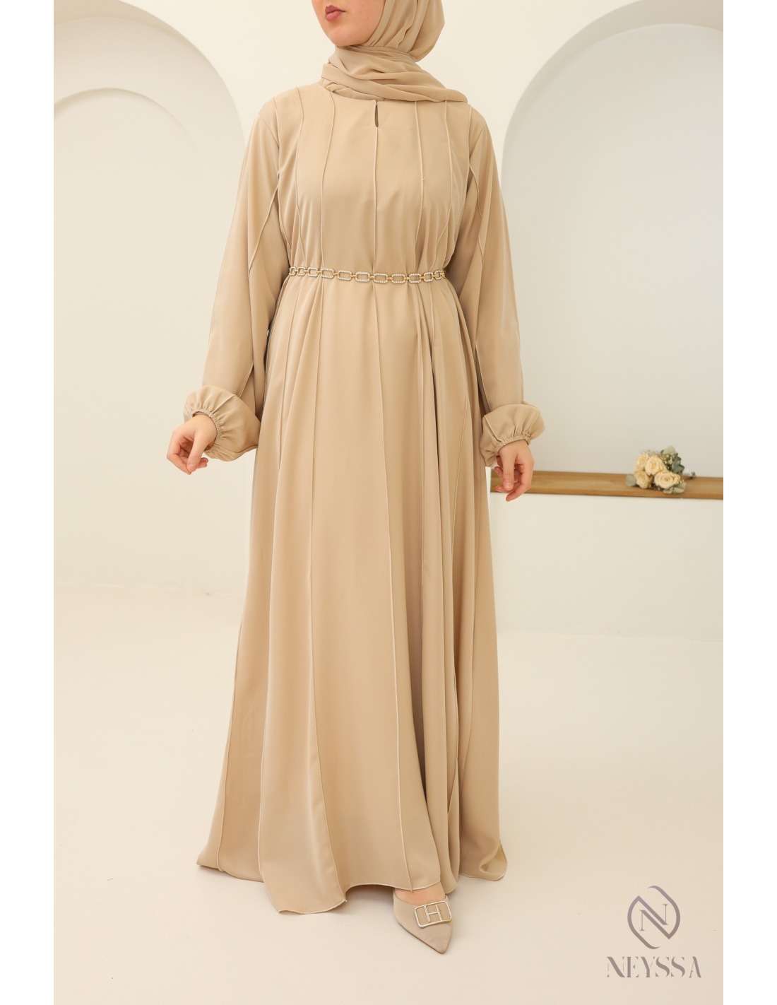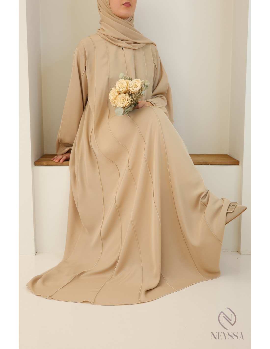 Beige Dubai umbrella-cut abaya with topstitching for veiled women