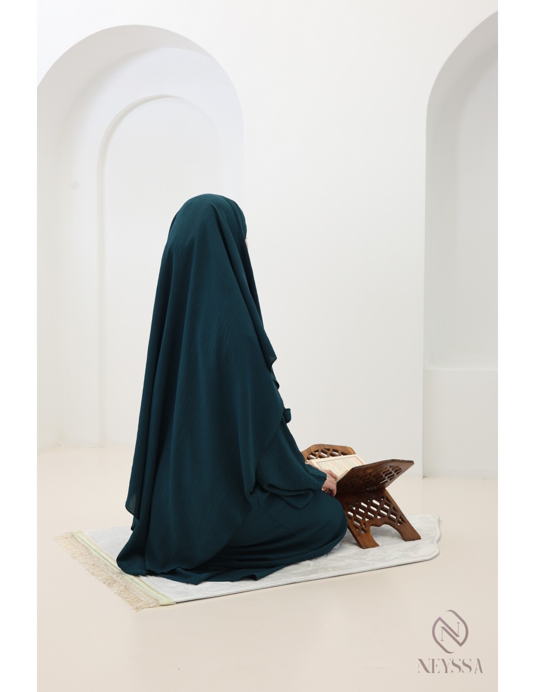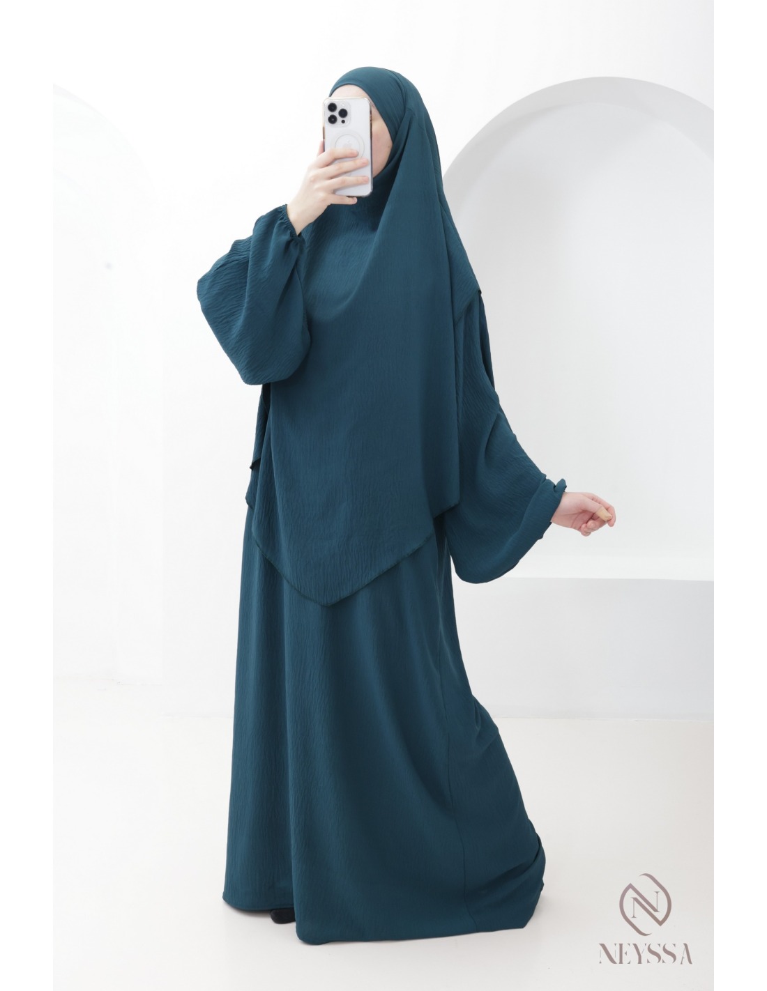 Are you looking for an elegant, comfortable, and fully covering outfit to wear every day while respecting the principles of modest attire? Discover our beautiful Ibtissam set, consisting of a long, loose-fitting abaya and matching khimar.