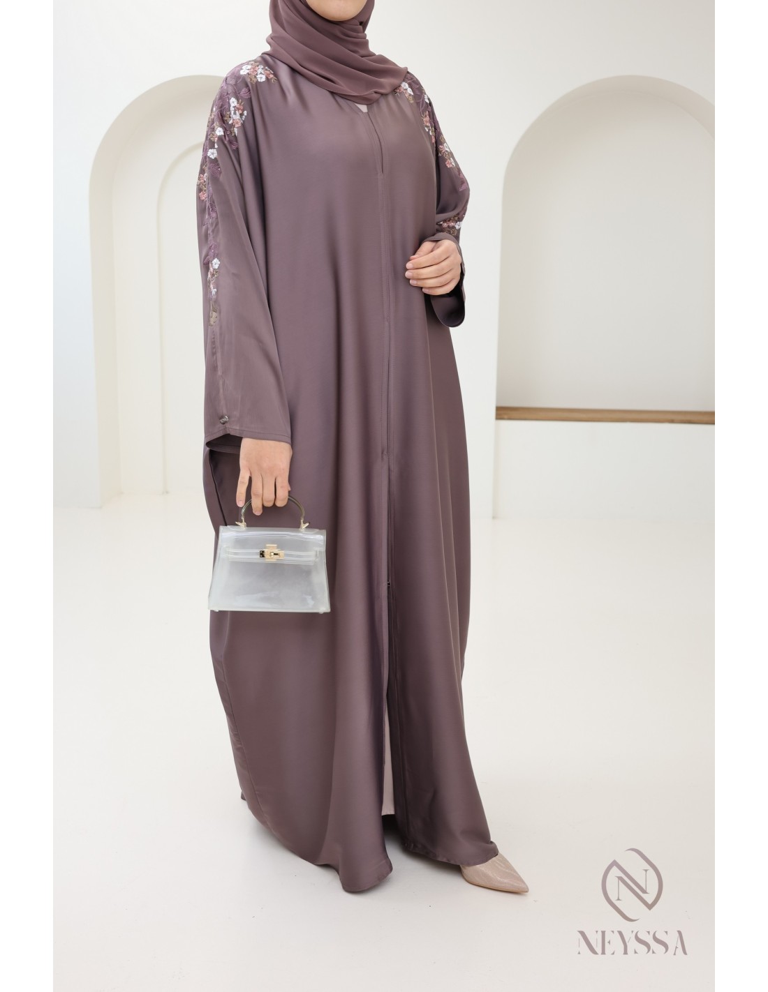 • Perfect personalized finishes: A Neyssa plaque is hand-sewn onto the sleeve of the abaya.