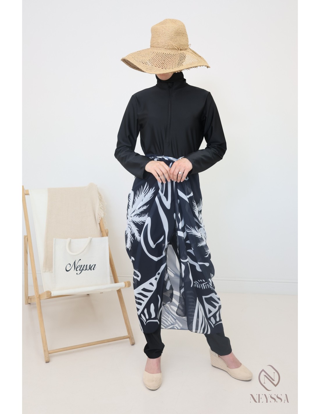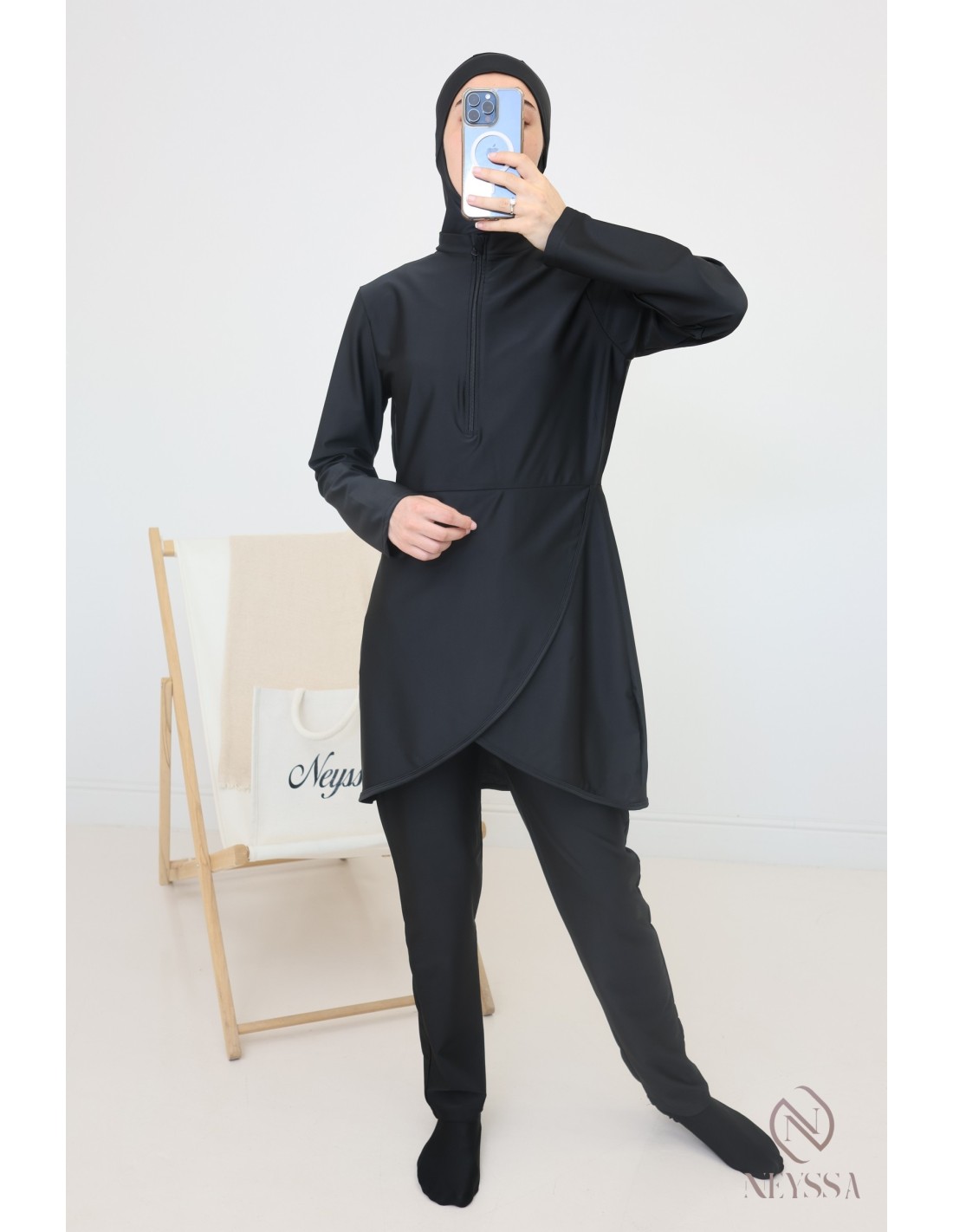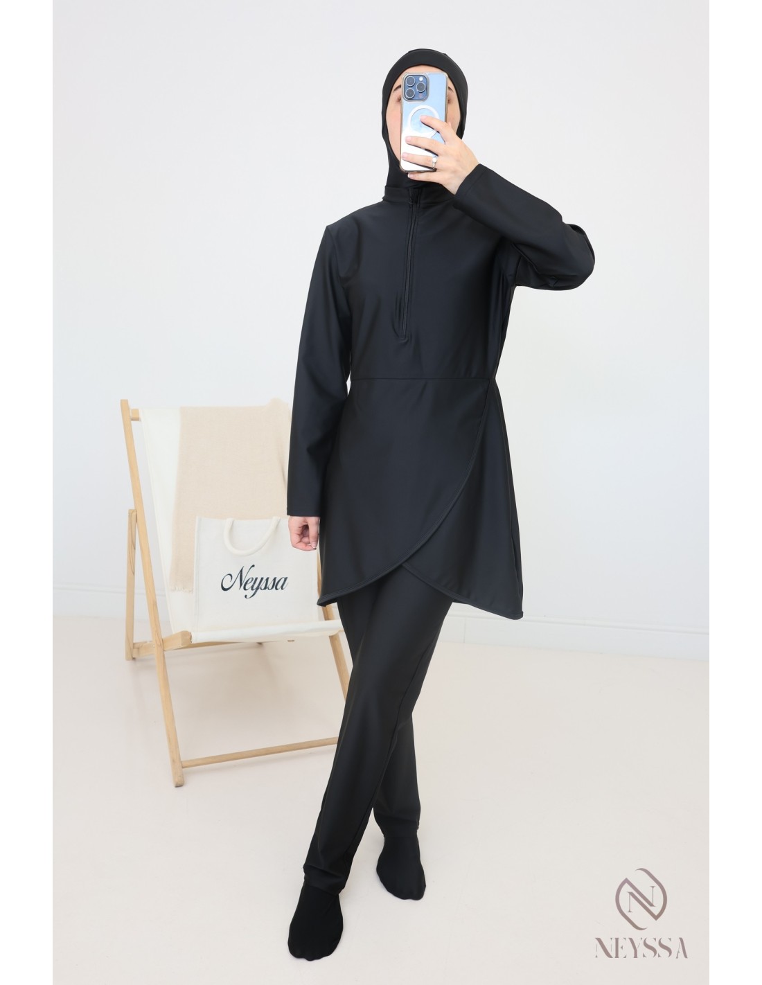 This modern black burkini for veiled women offers complete coverage and optimal comfort without compromising your style: