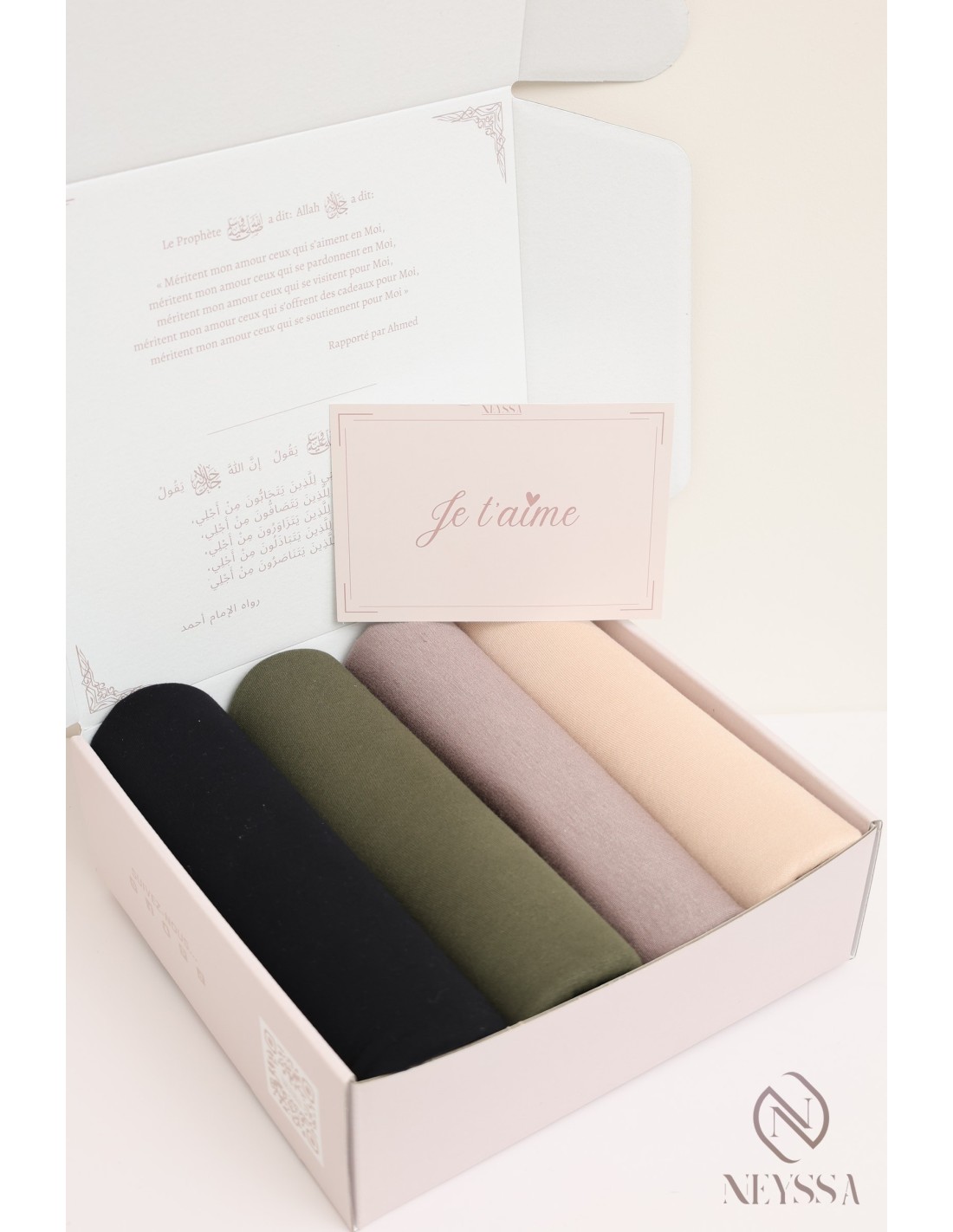 The presentation is a pretty reusable box with the effigy of your favorite brand, in which 4 hijabs are delicately wrapped in a tissue paper.