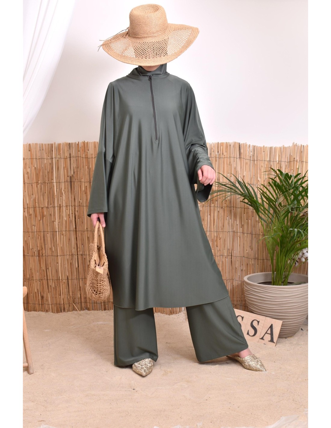 Women's khaki burkini with integrated hood, zipped tunic