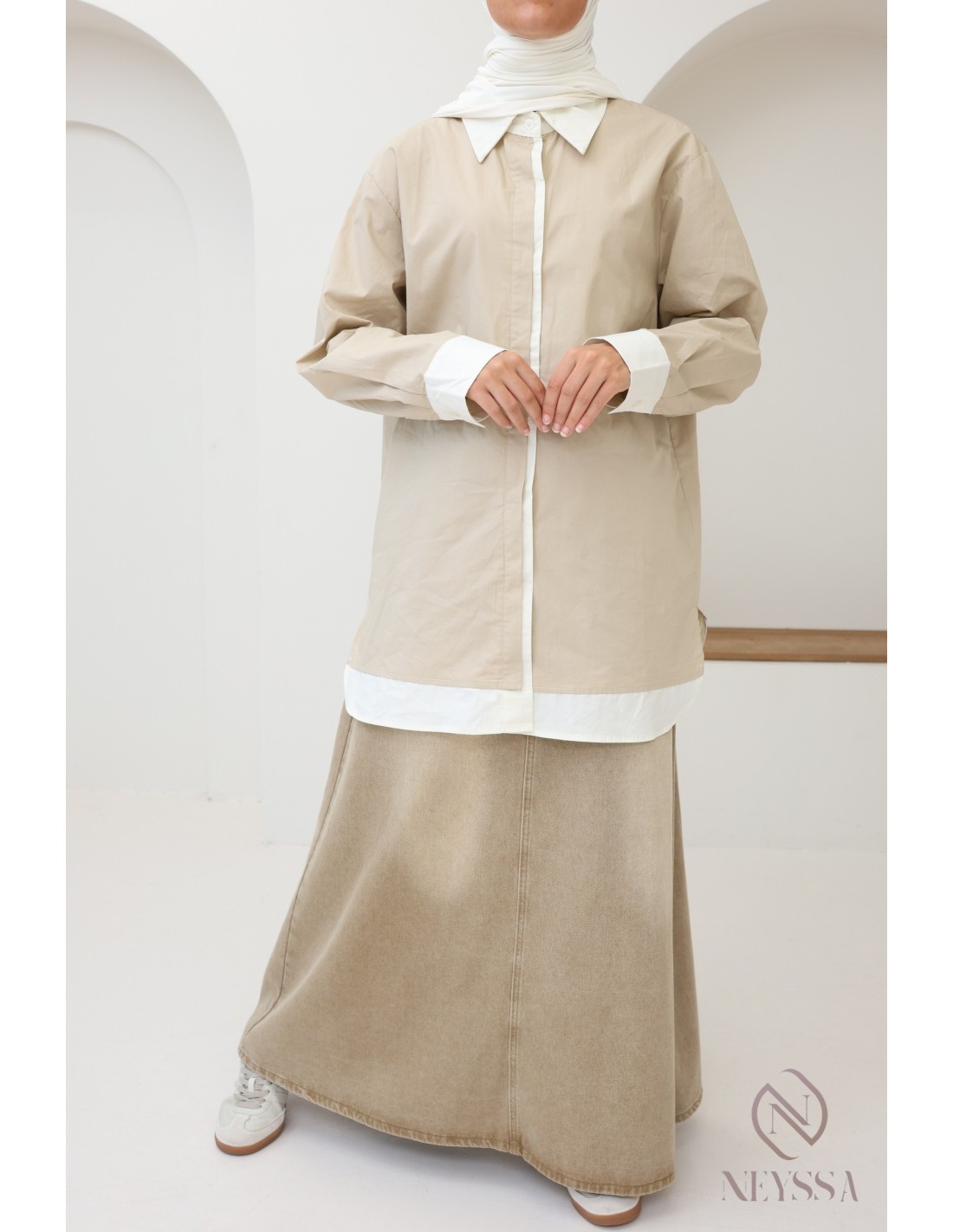 Mid-length Two-Tone Button-Down Shirt with a Loose Fit for Veiled Women : An Essential Item