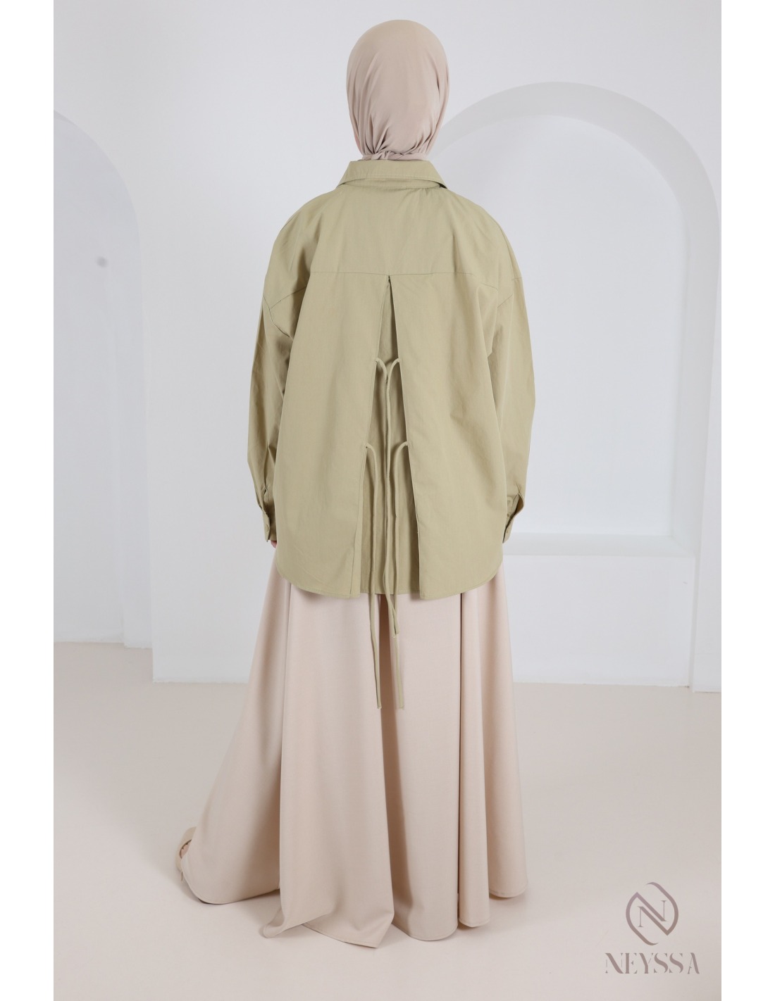 • Back yoke: Extra fabric creates a draped and structured effect, adding volume and a unique touch to the design.