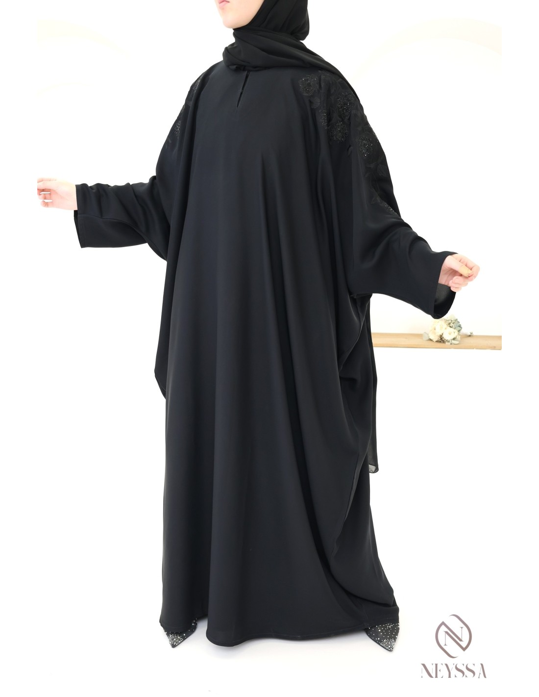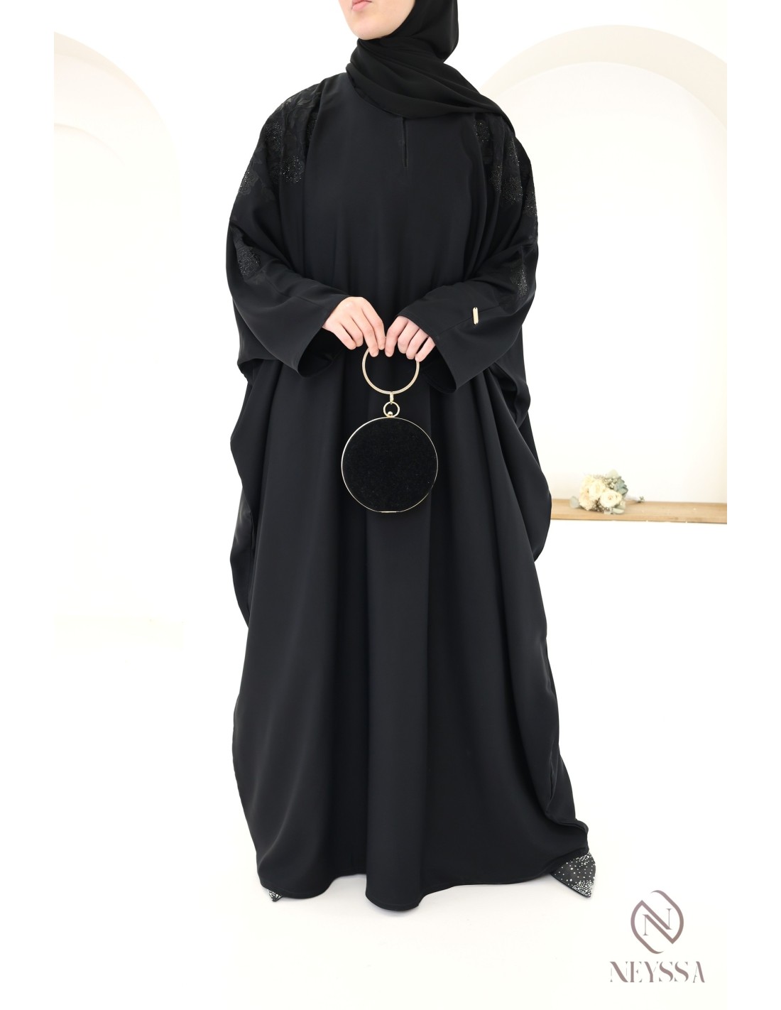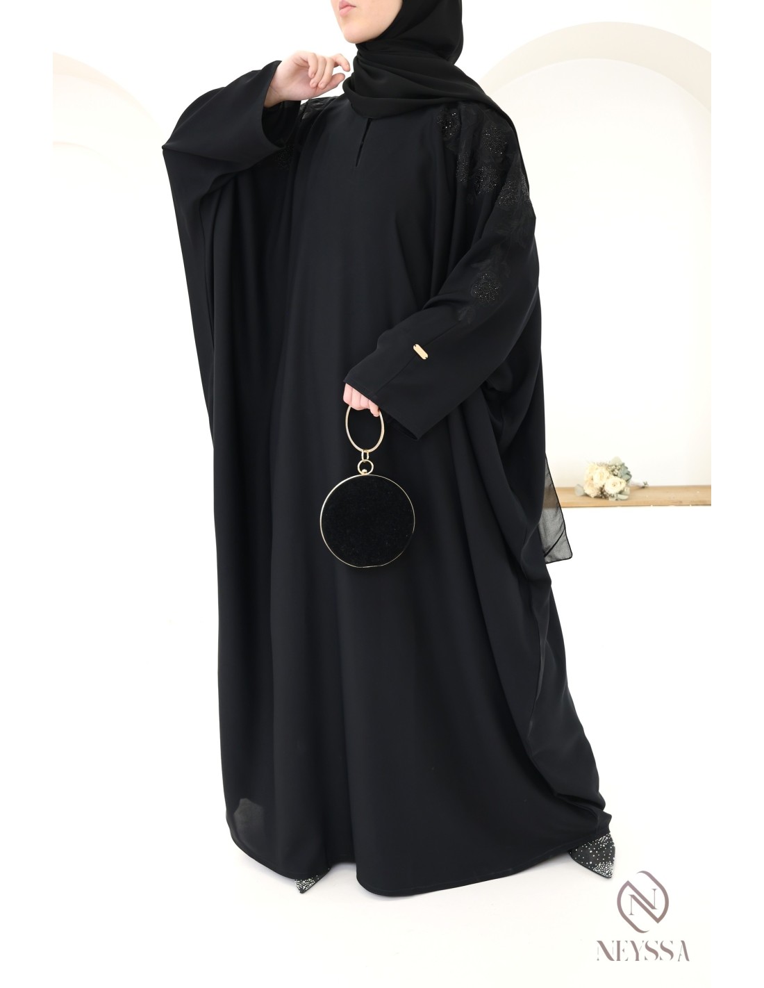 Long black butterfly-cut Dubai abaya for women with rhinestones and embroidery