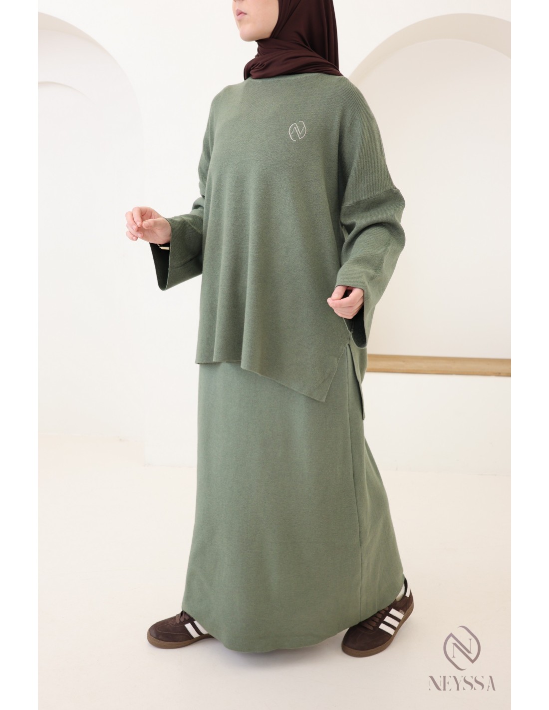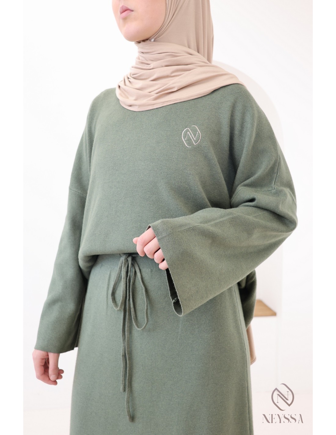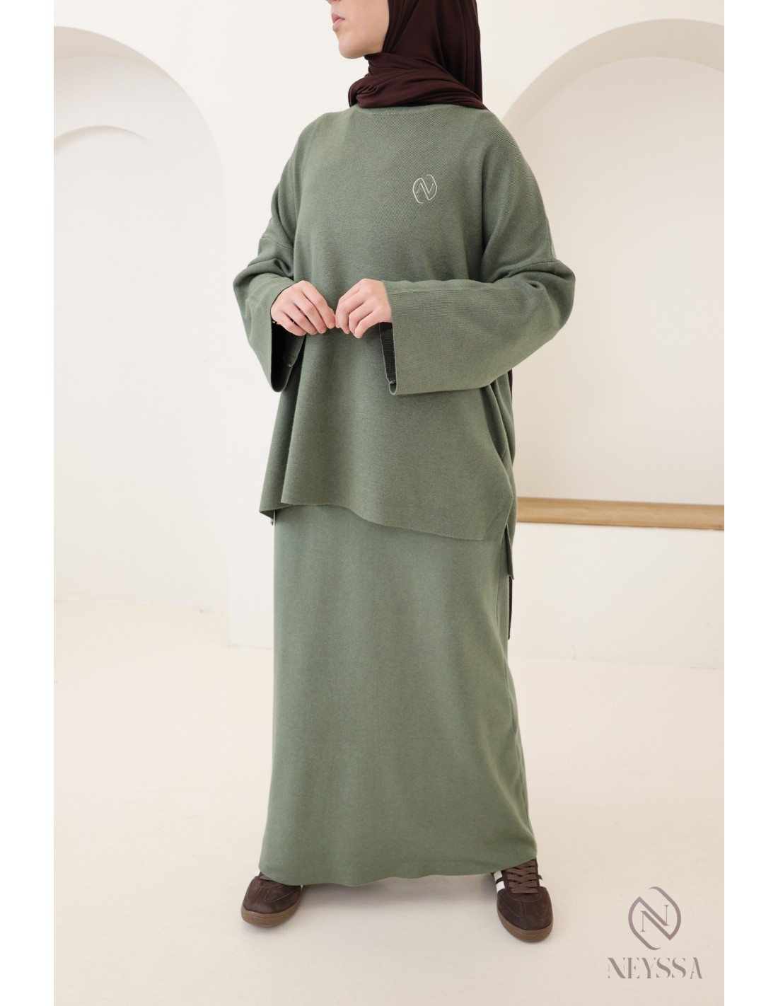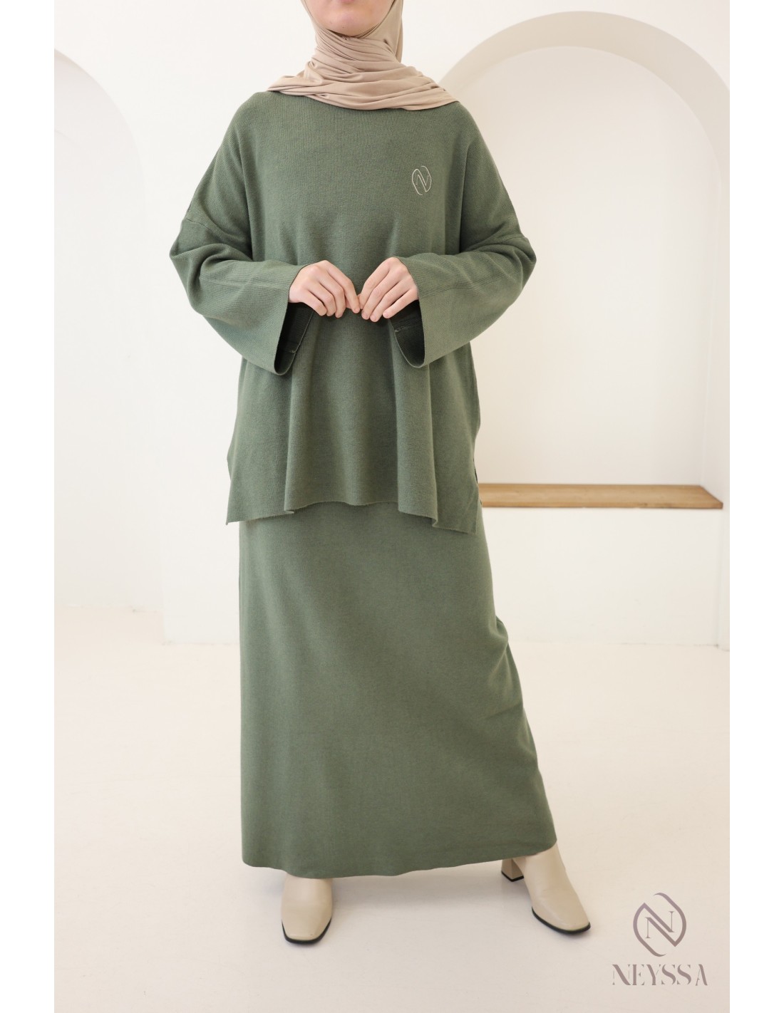 Women's khaki woven knit skirt set, modest hijabi outfit