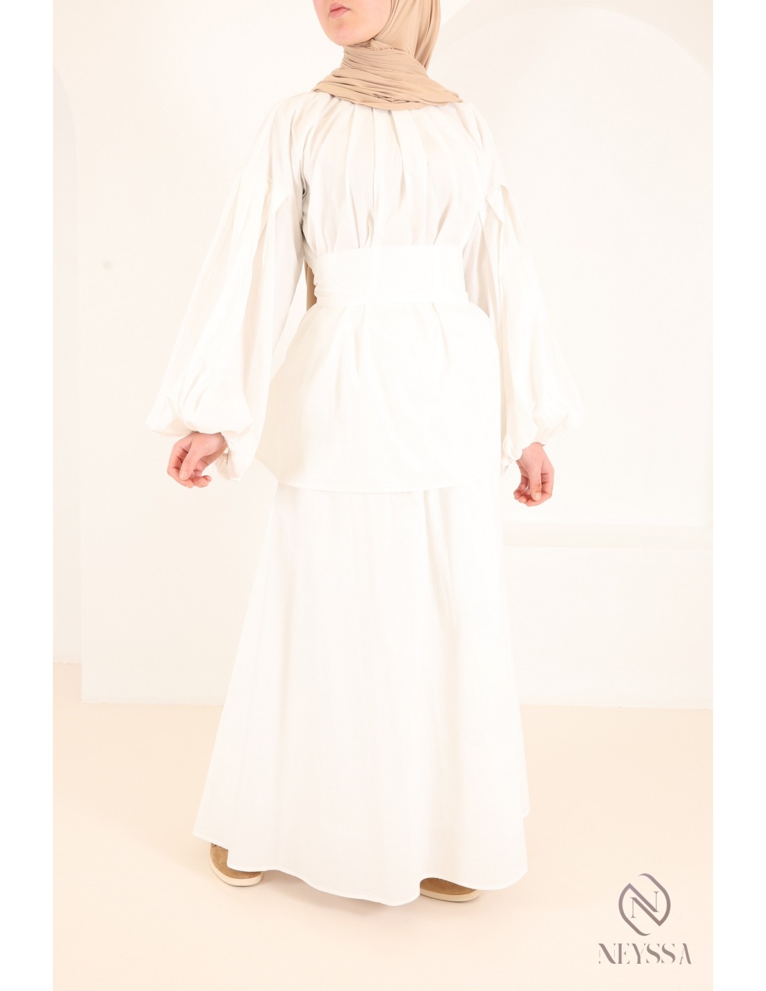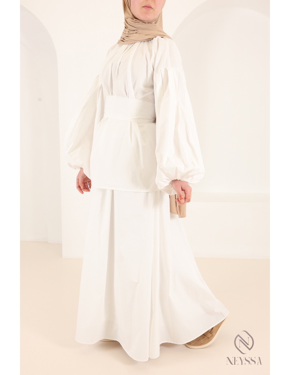 White Set: Puff-Sleeve Blouse + Long Skirt, 100% Cotton