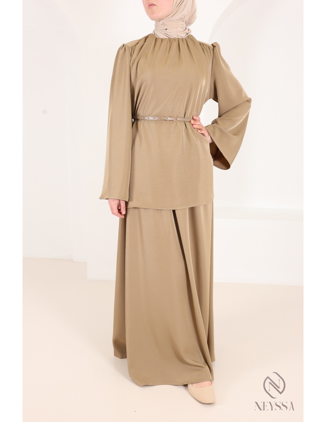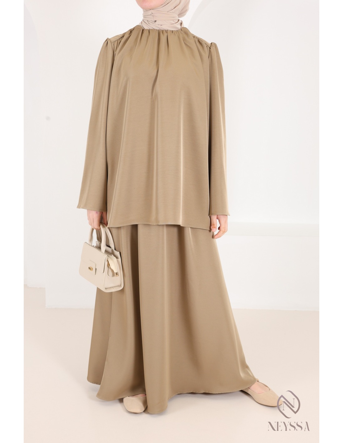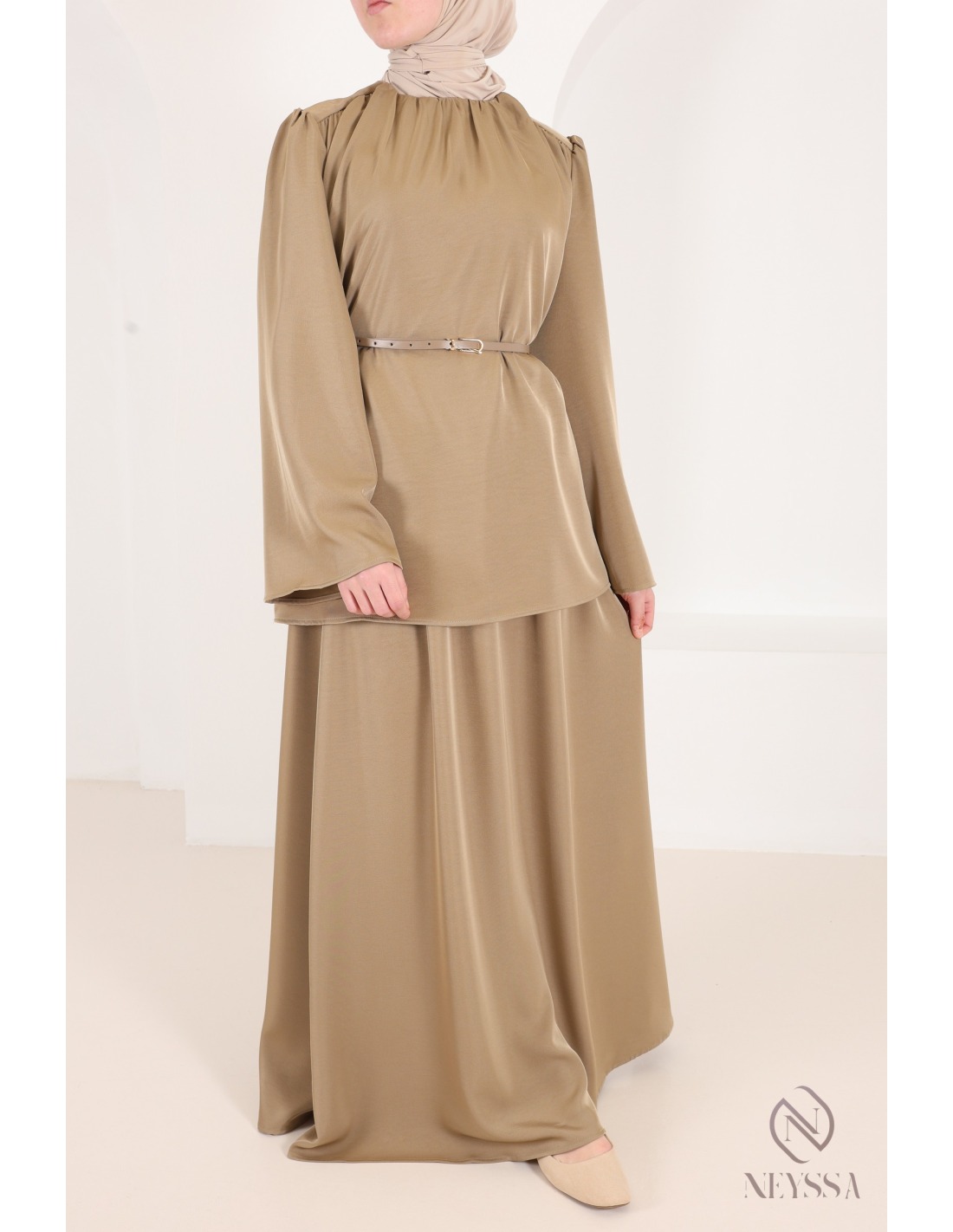 This taupe skirt and blouse set, with its modern and modest cut, is sure to please: