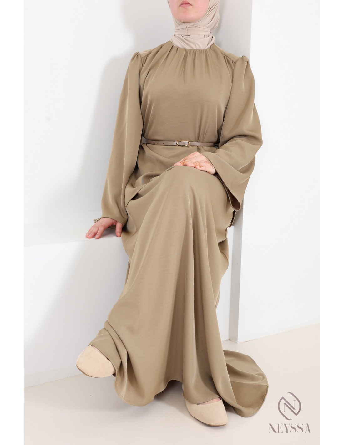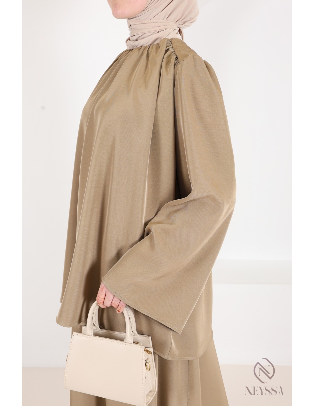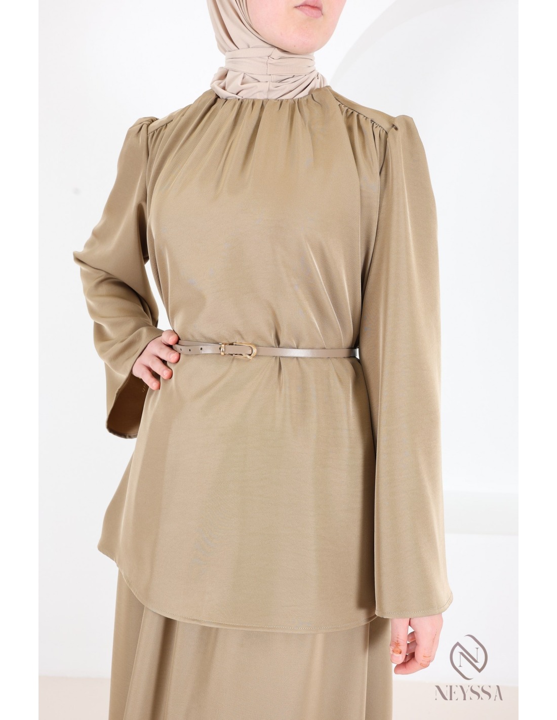 This taupe skirt and blouse set, with its modern and modest cut, is sure to please: