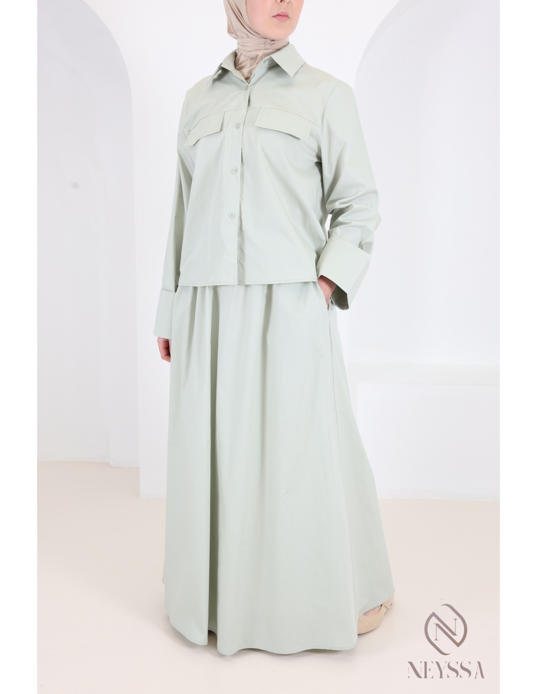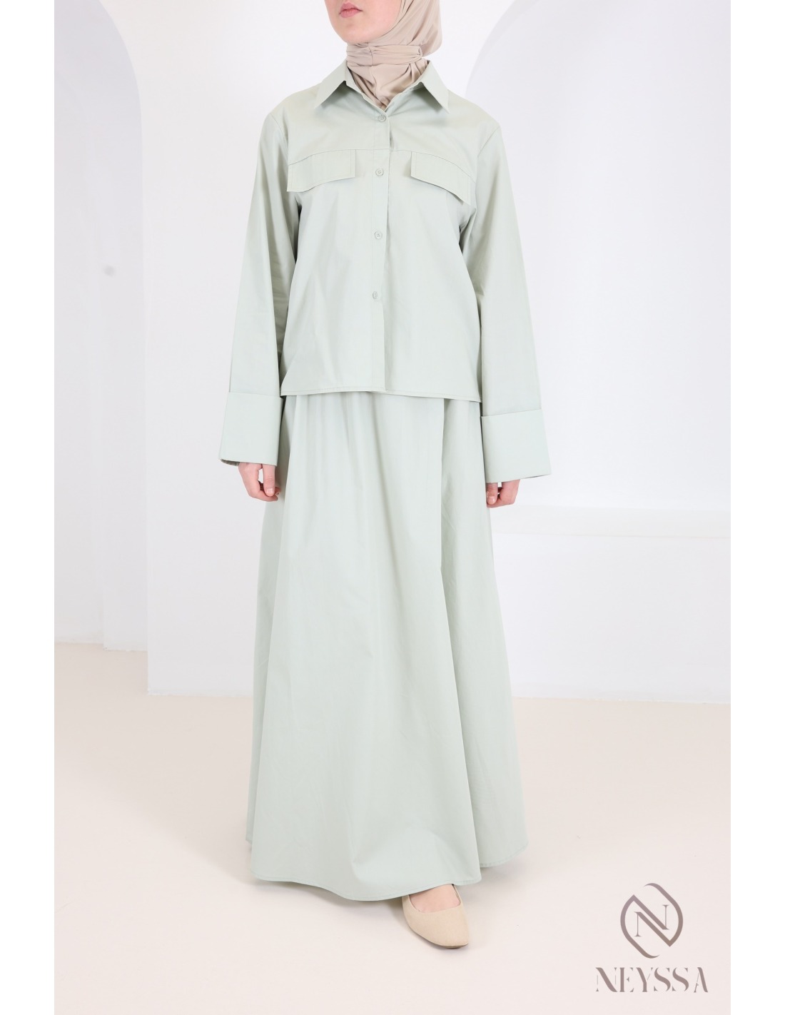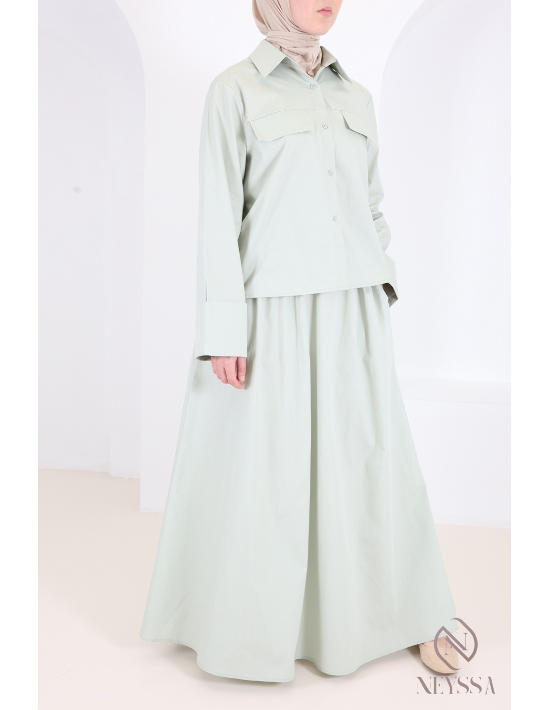 Two-piece green set: straight shirt with long cotton skirt