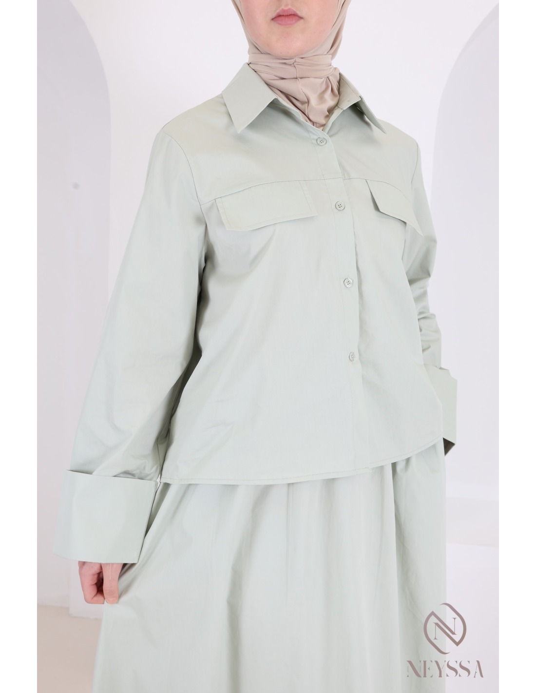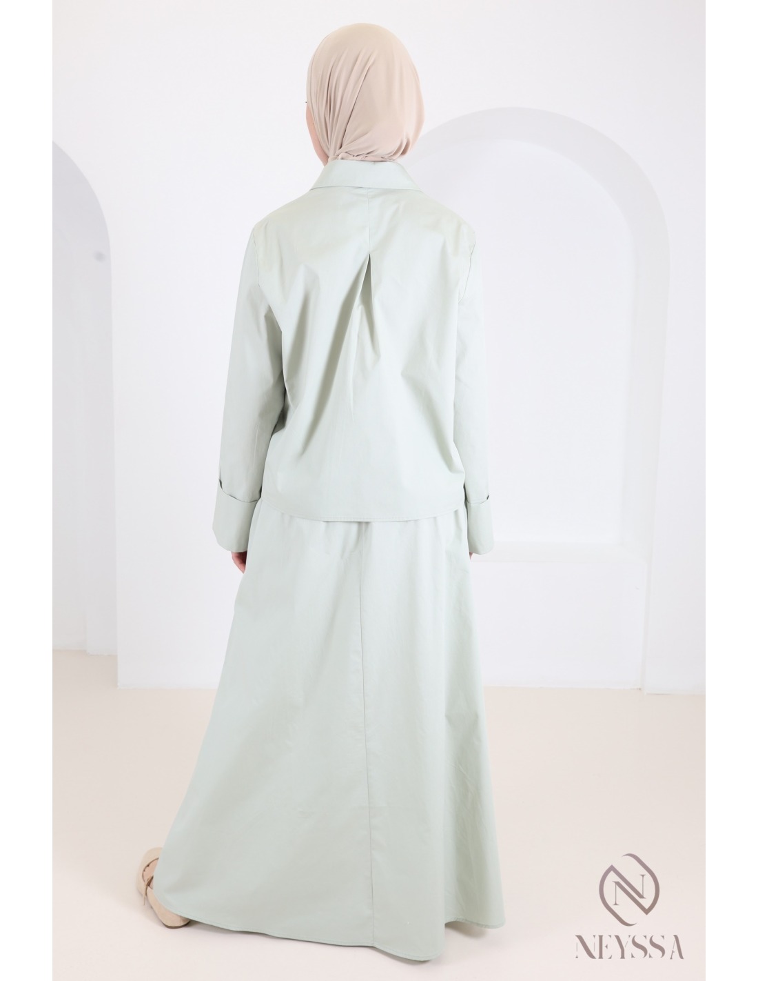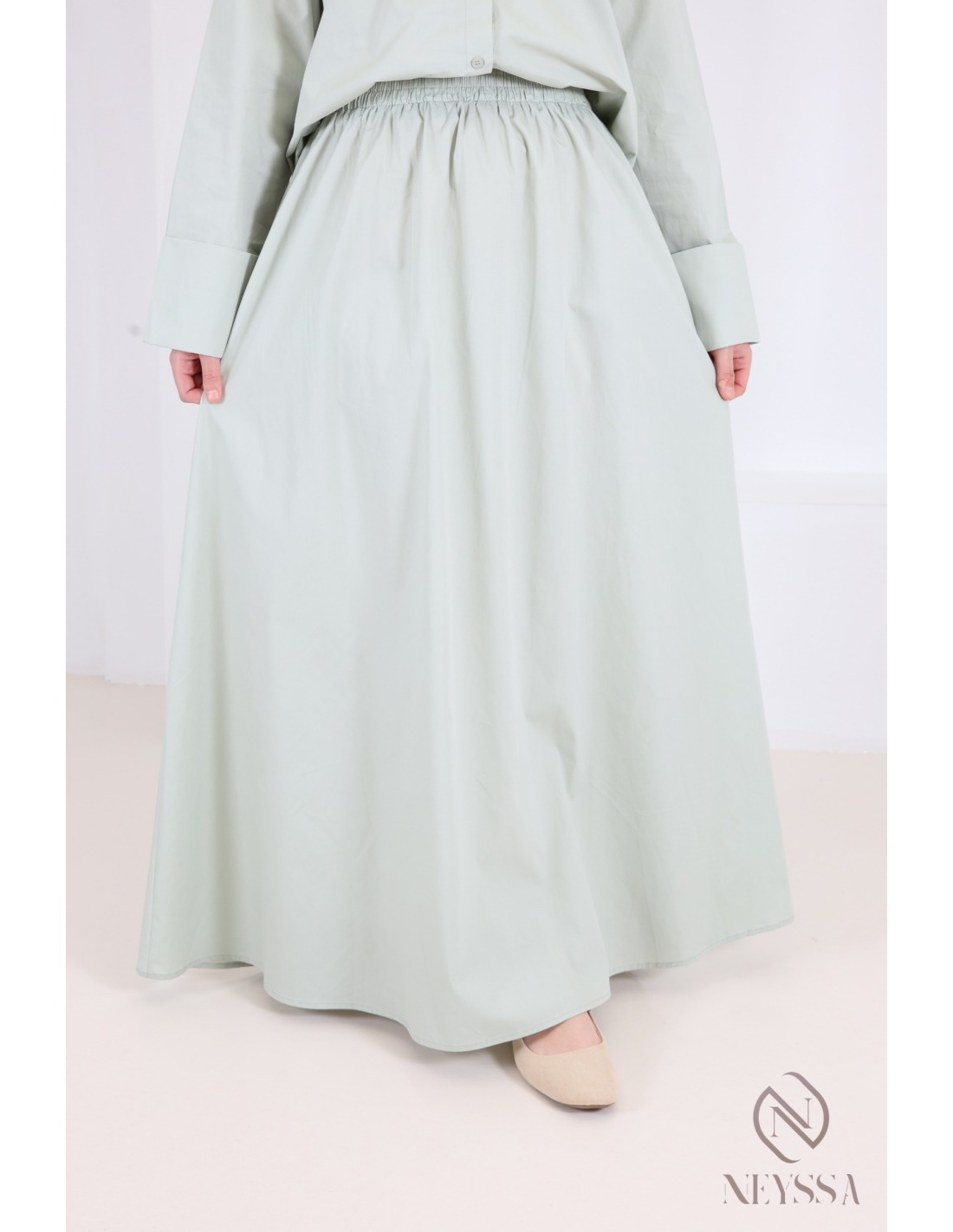 Two-piece green set: straight shirt with long cotton skirt