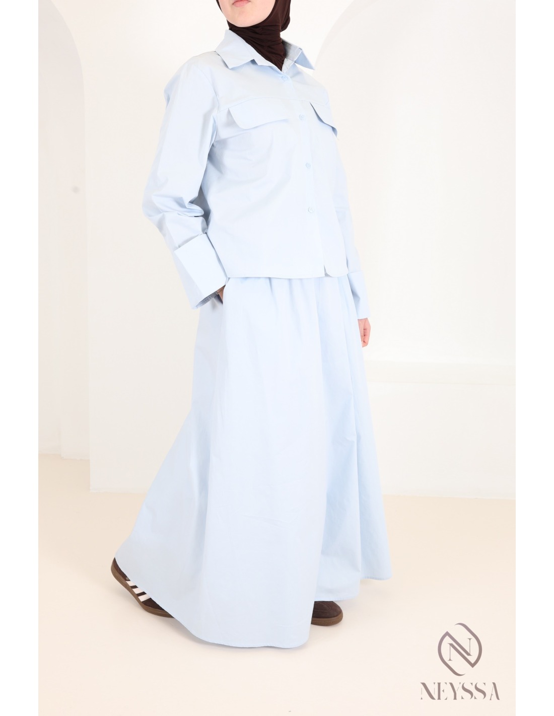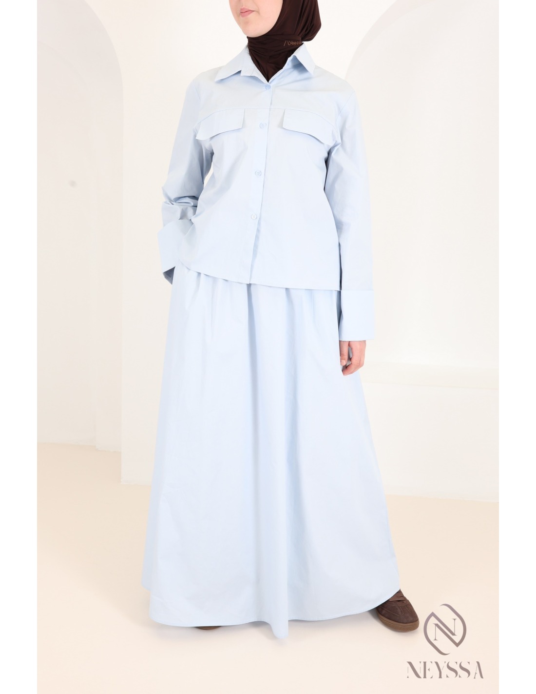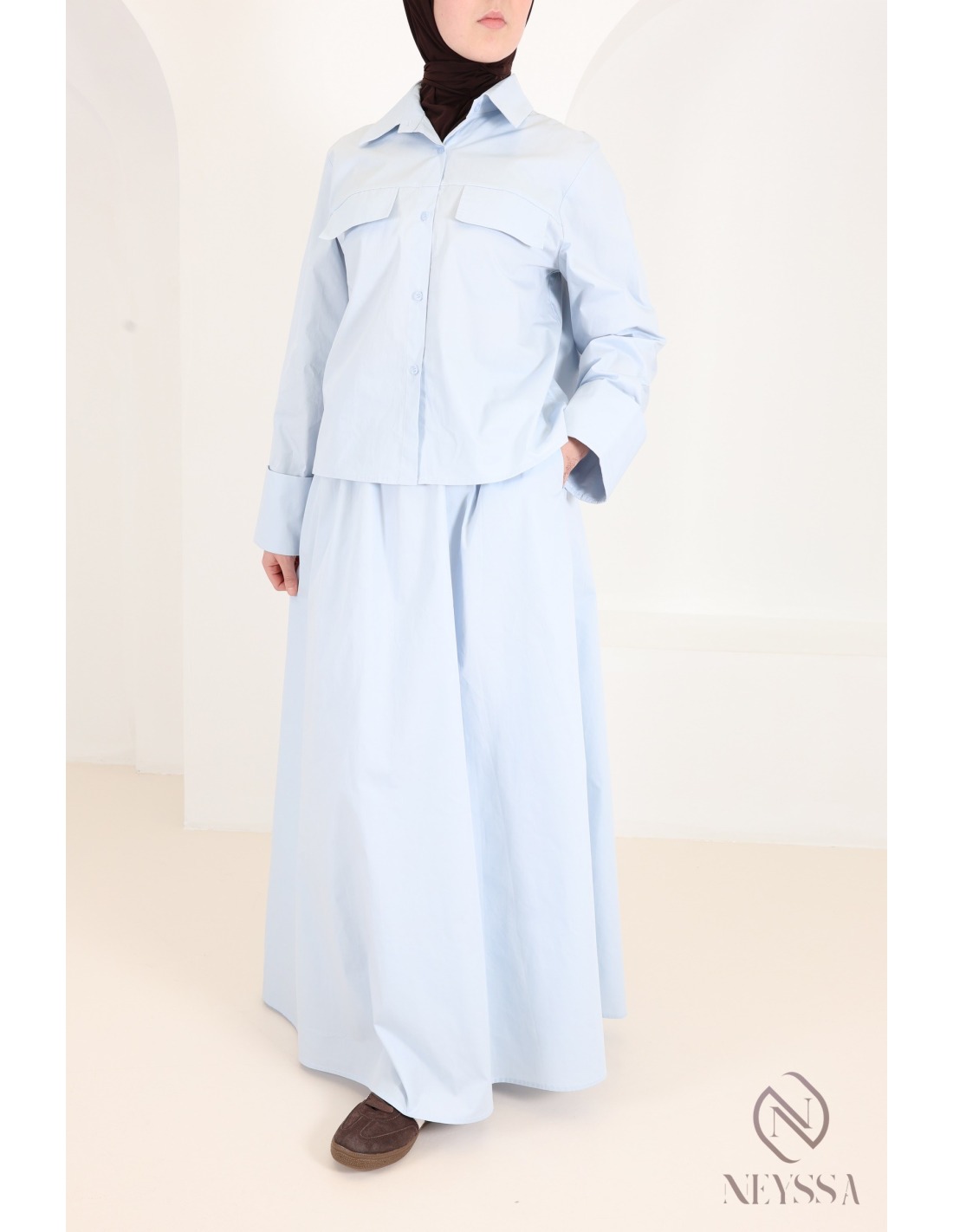 Two-piece set: flared skirt and long-sleeved baby blue shirt
