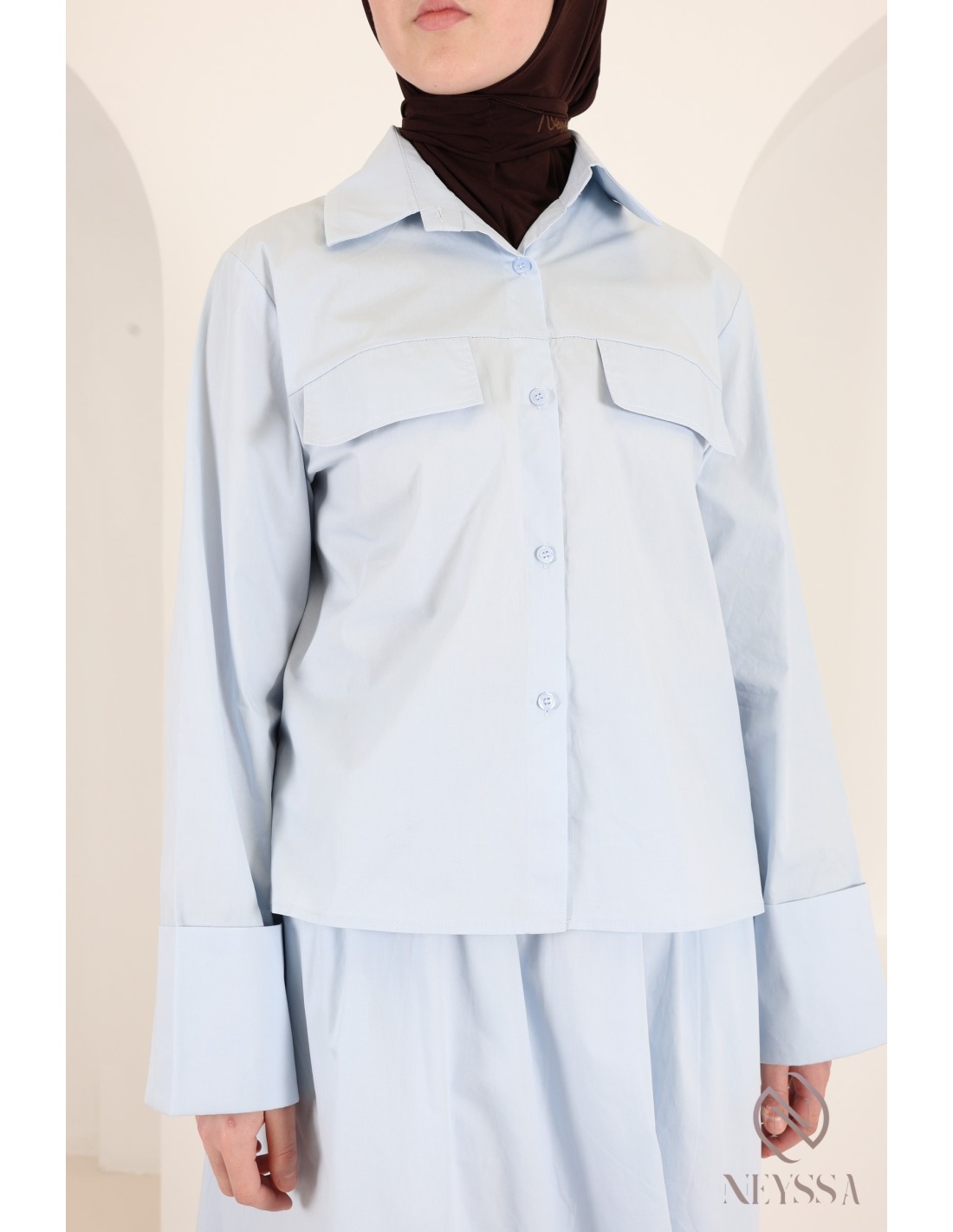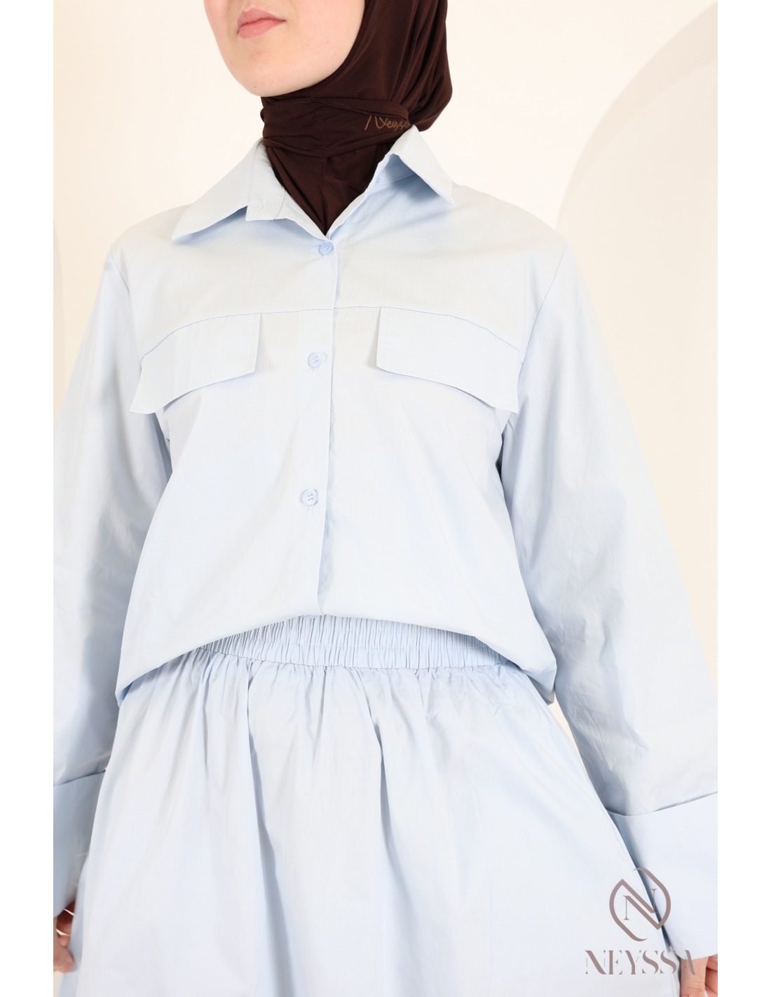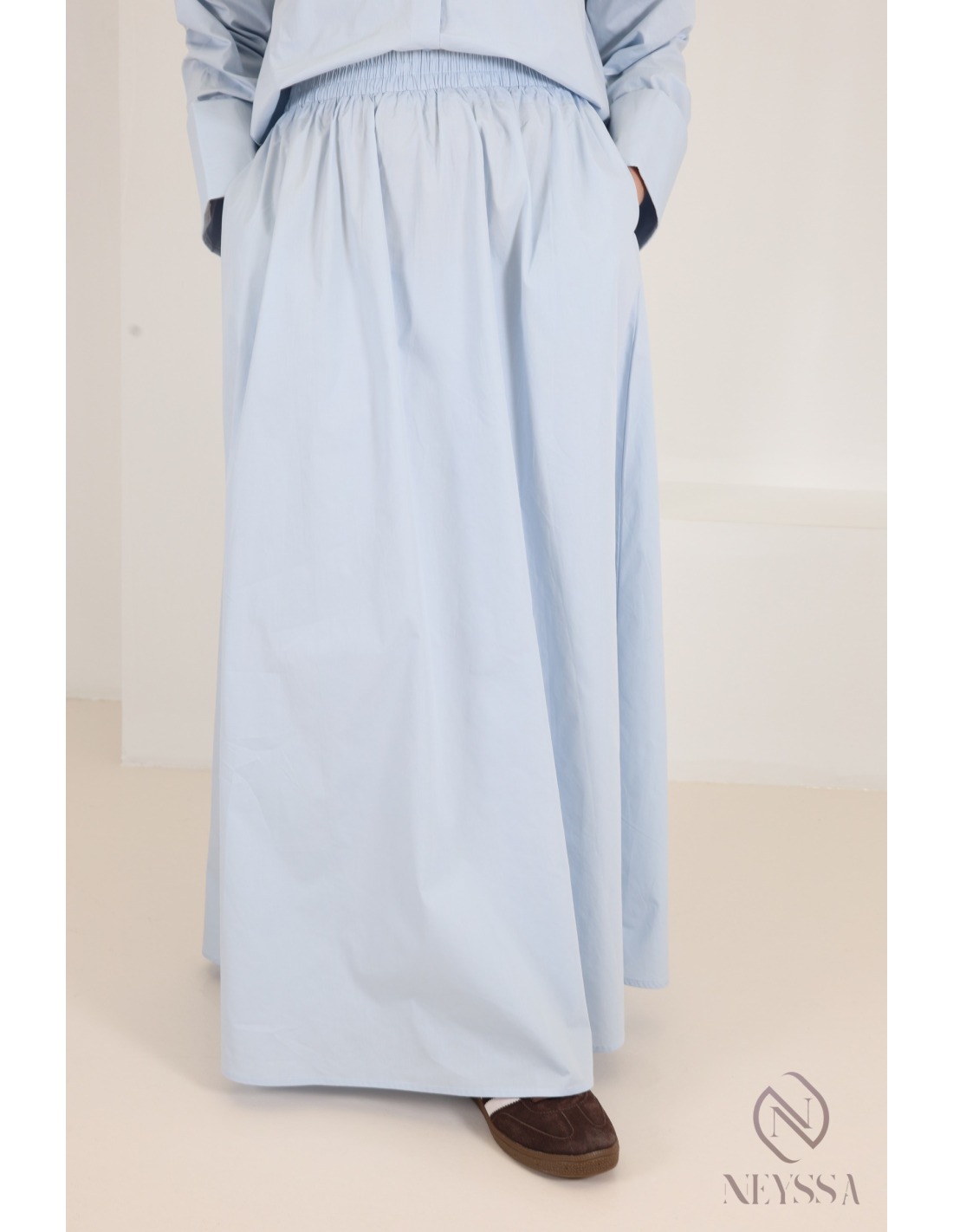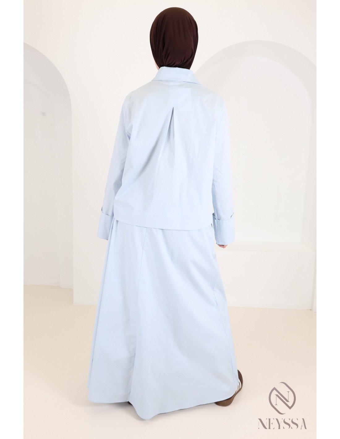 Two-piece set: flared skirt and long-sleeved baby blue shirt