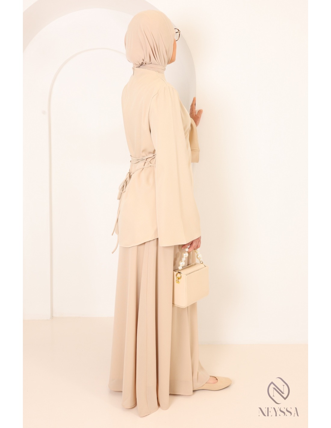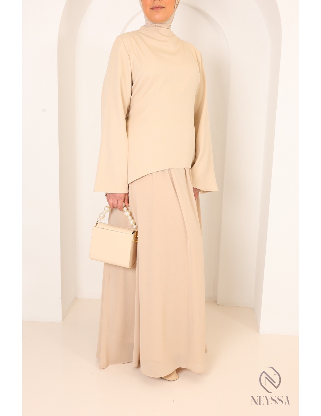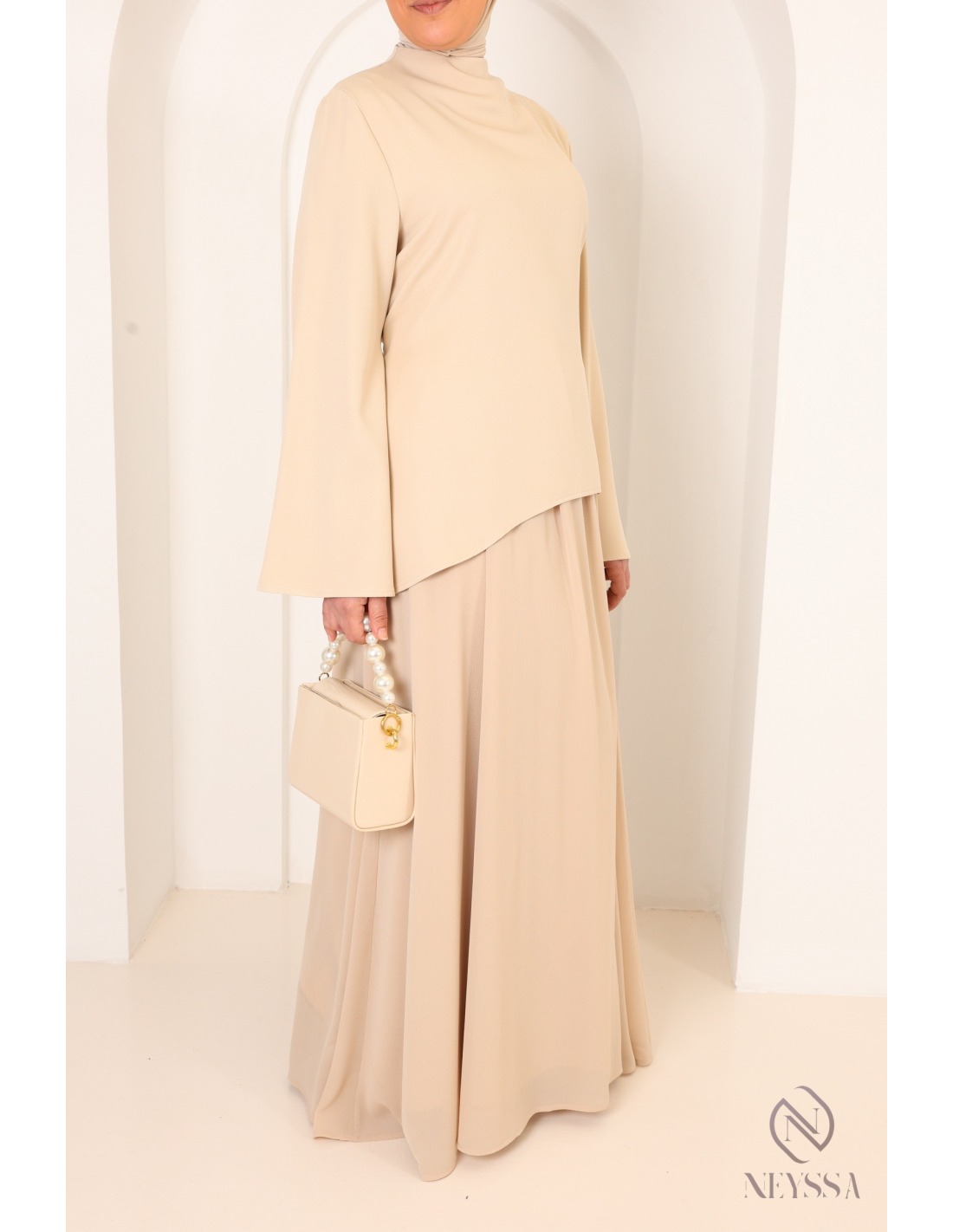 This asymmetrical skirt and blouse set with a modern, modest cut is sure to win you over: