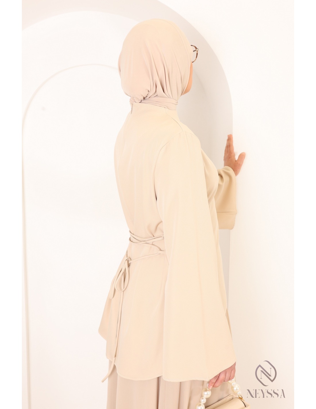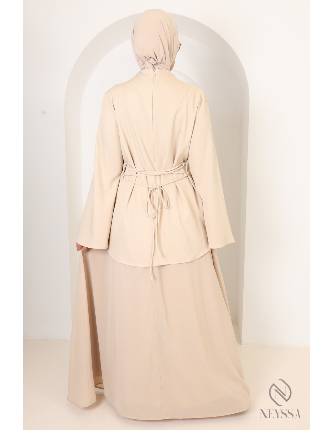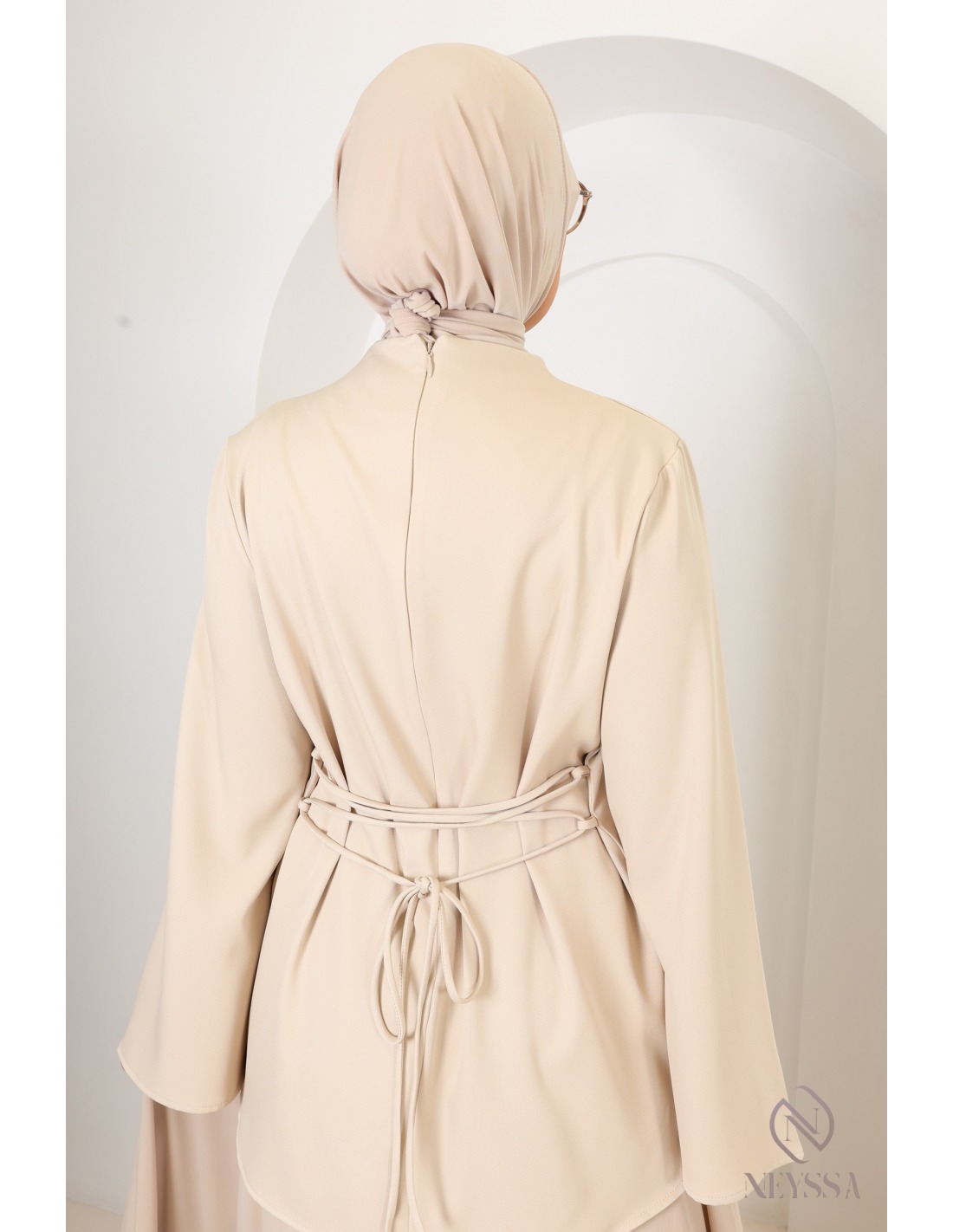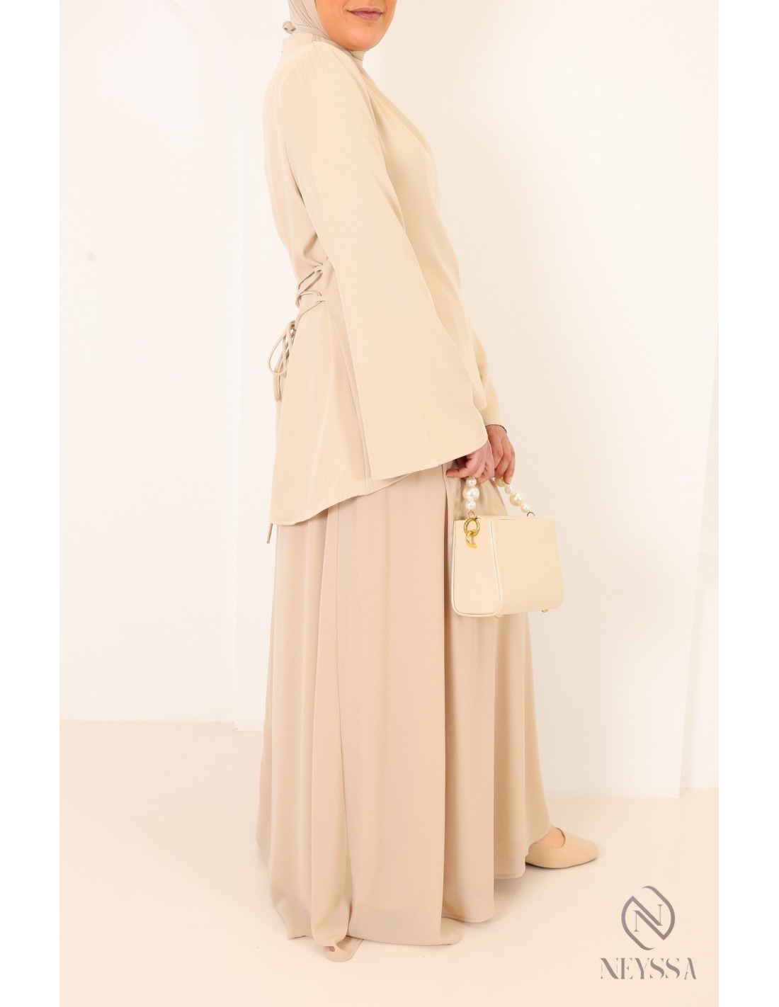 This asymmetrical skirt and blouse set with a modern, modest cut is sure to win you over: