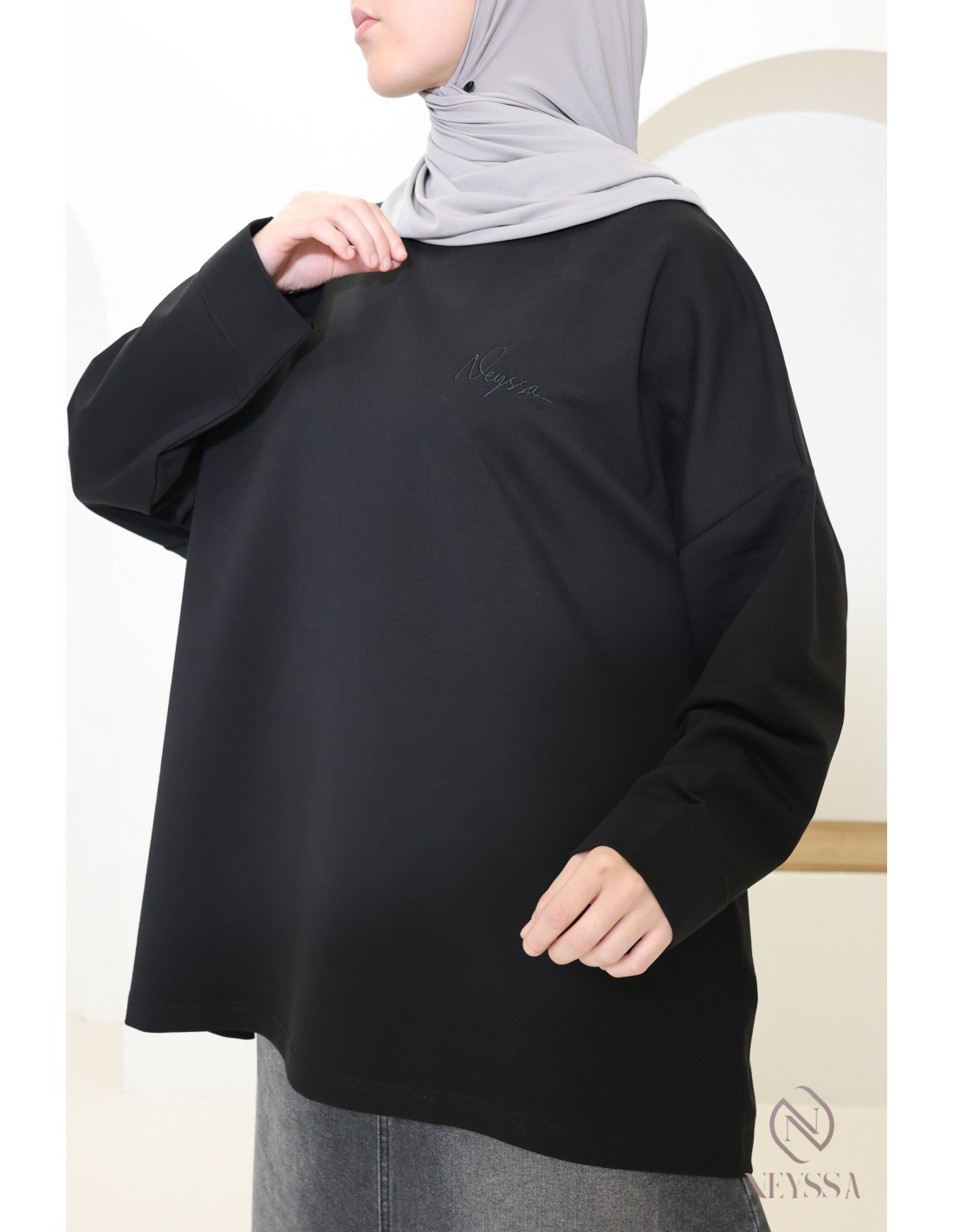 Neyssa oversized mid-length long-sleeved black embroidered T-shirt : a must-have