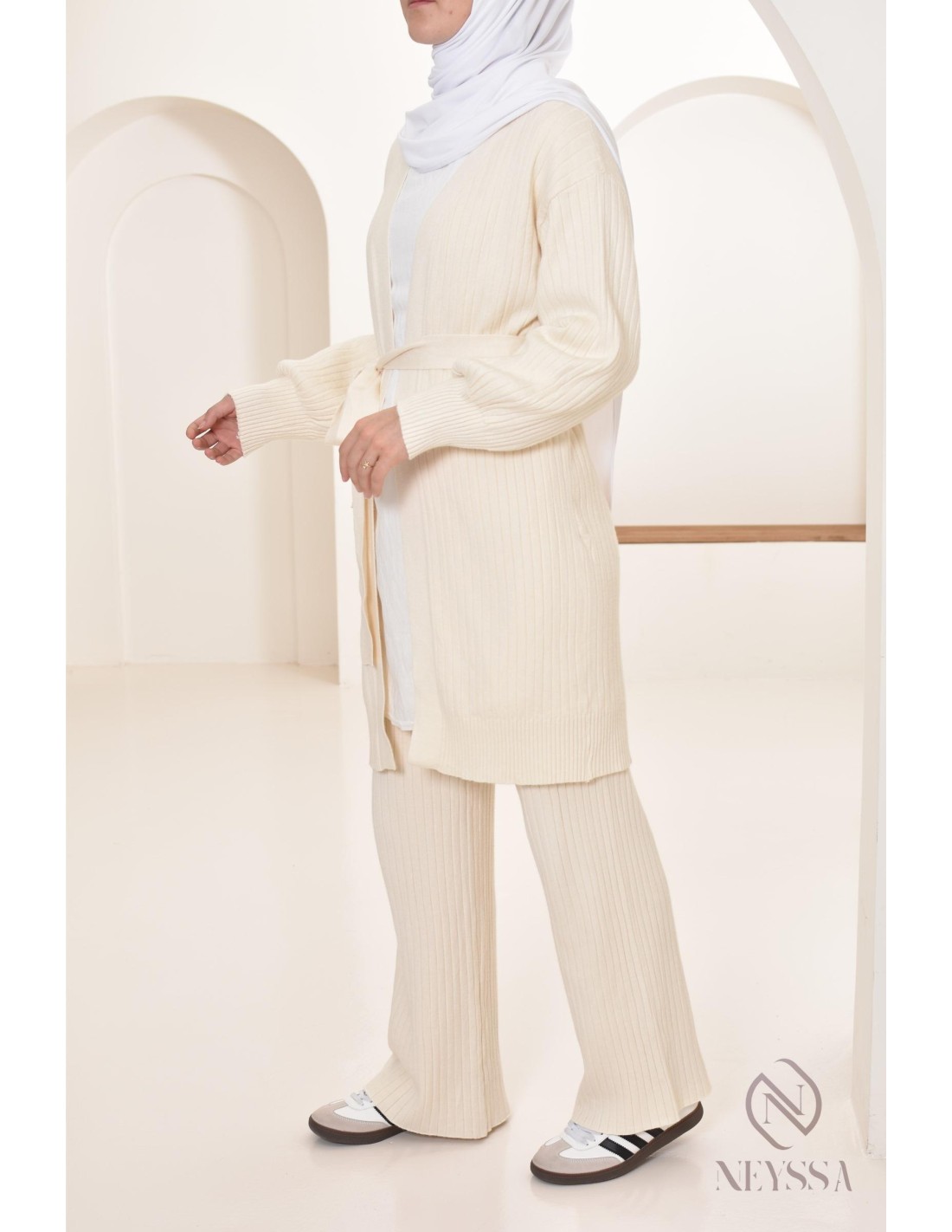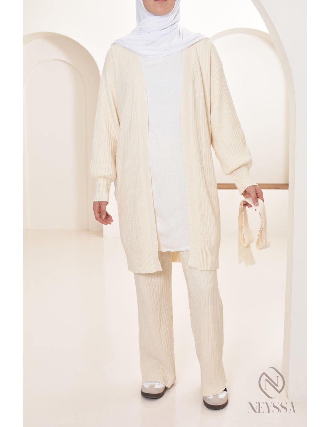 Modest women's long vest and knit pants set by Neyssa