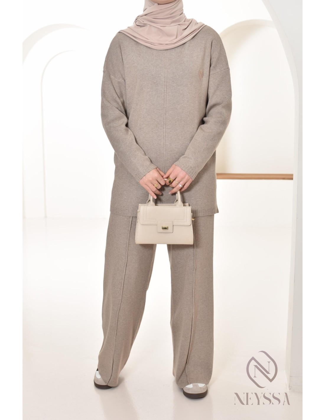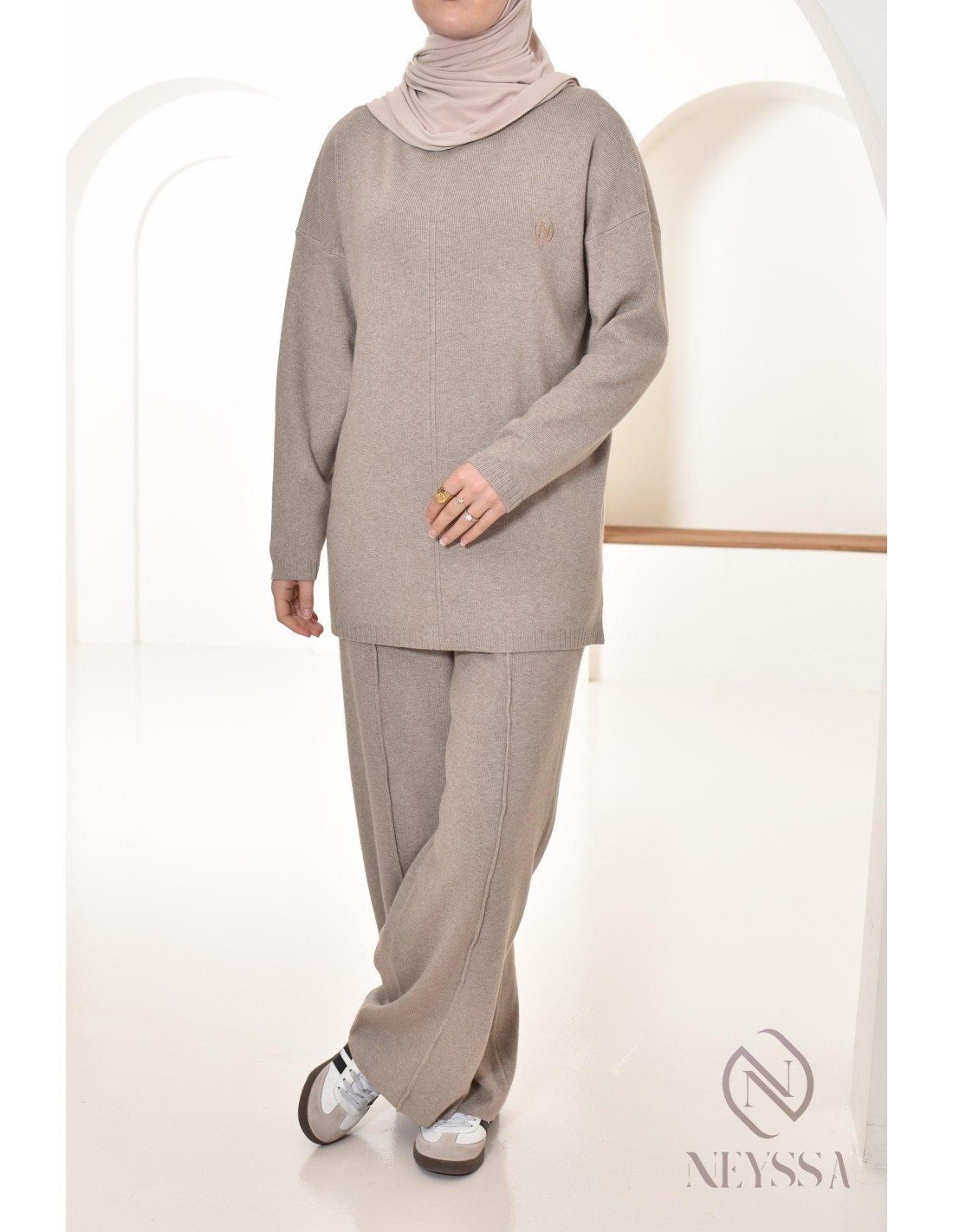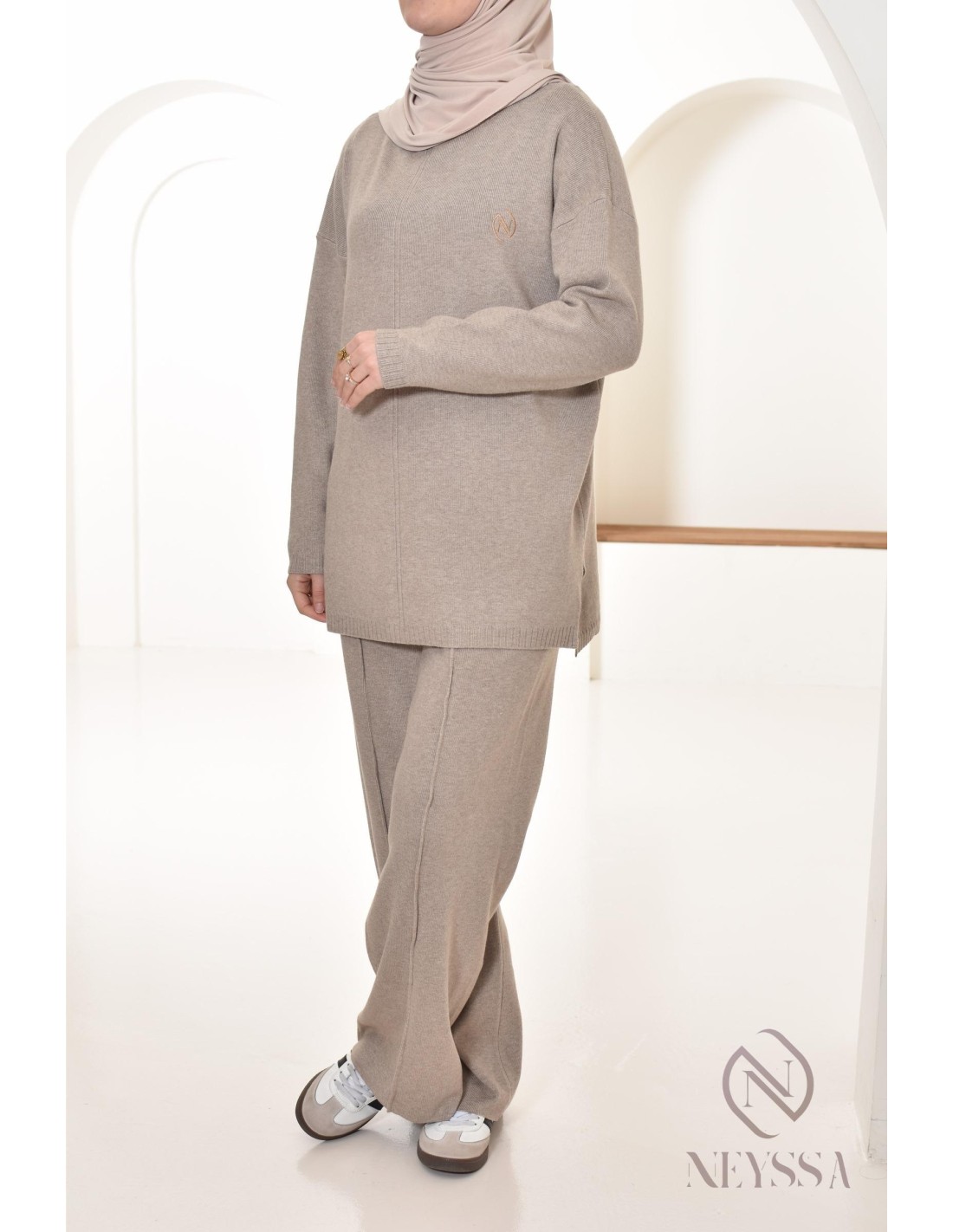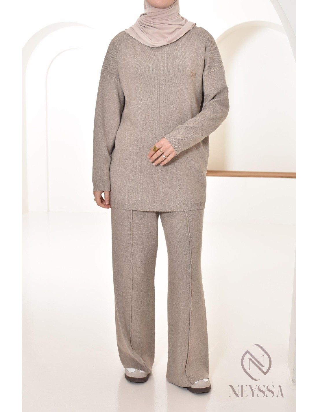 Here's this Neyssa Confection sweater and loose-fitting pants combo, designed specifically to meet the needs of hijabi women. It offers modest elegance without compromising chic and comfort.
