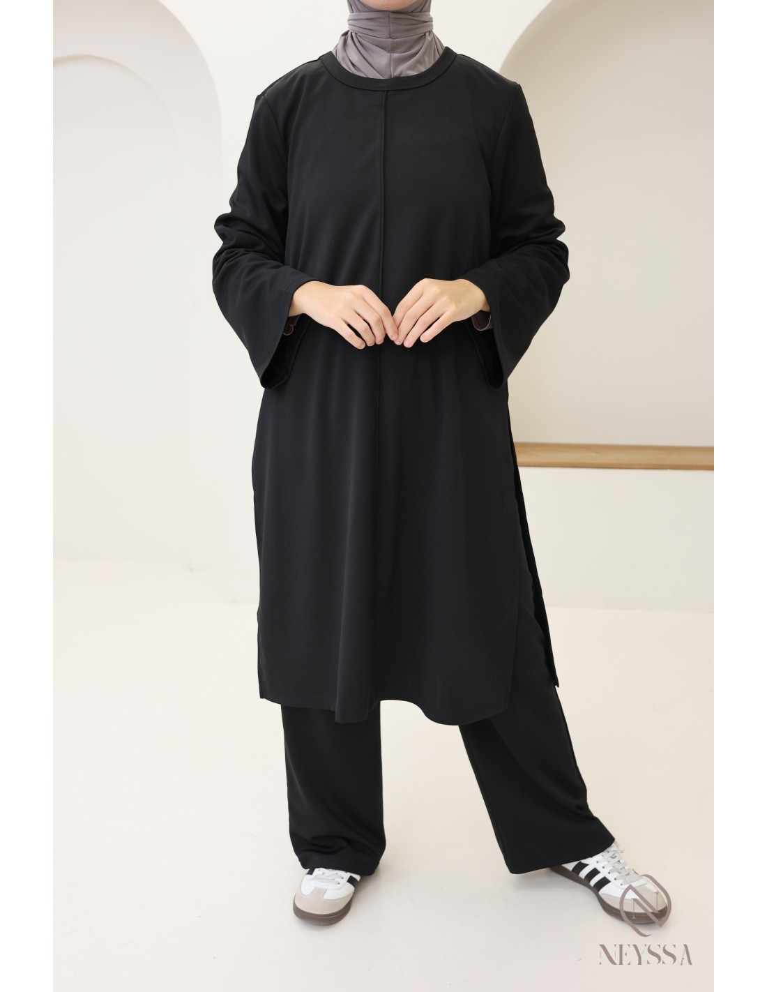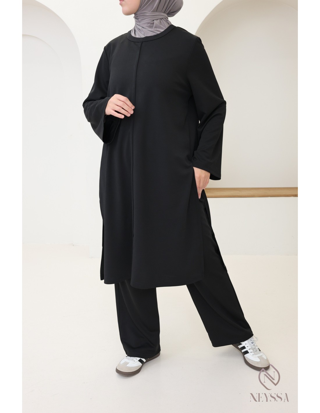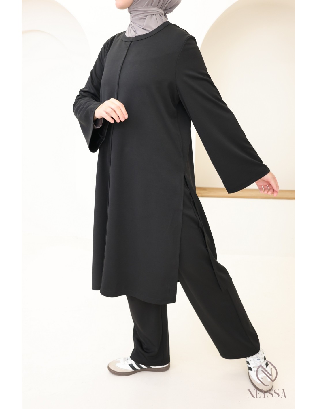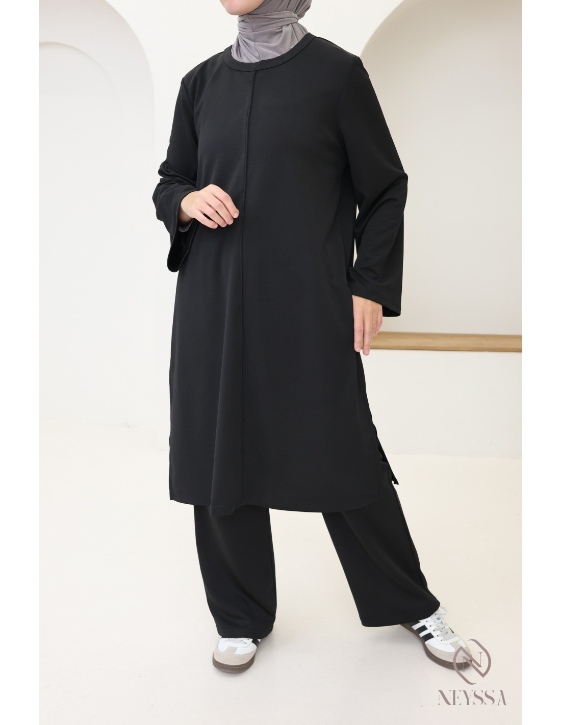 Here is a 2-piece set with a long tunic that has been specially designed to meet the needs of hijabis. It offers modest elegance without compromising on style and comfort.