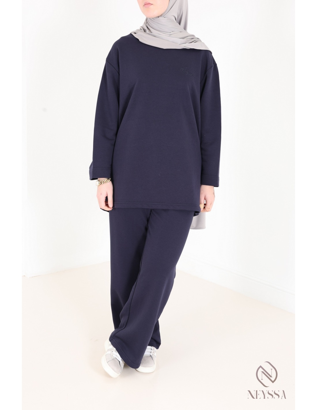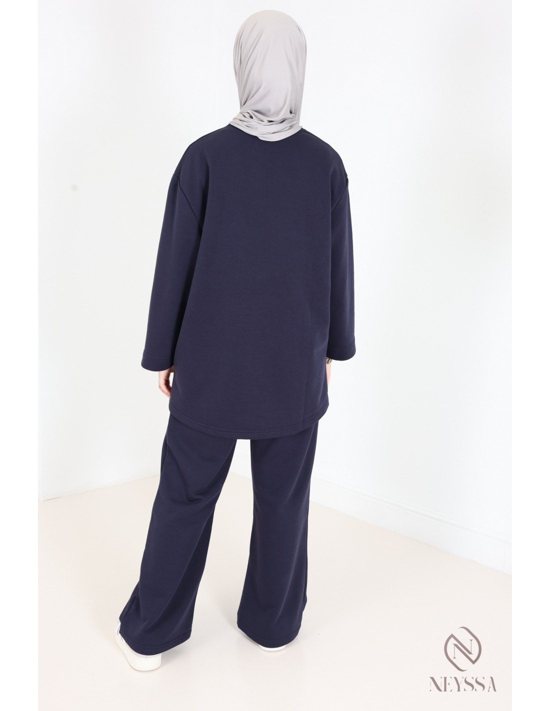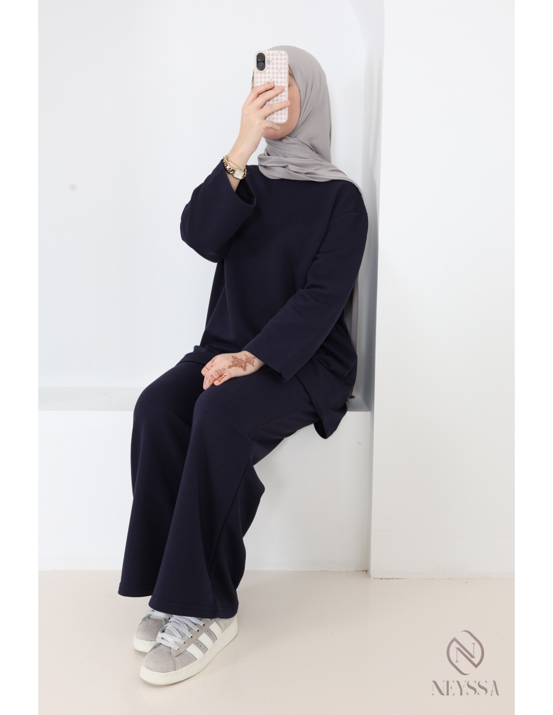Midnight blue cotton set featuring a long-sleeve top and pants: A stylish hijab-friendly sportswear outfit