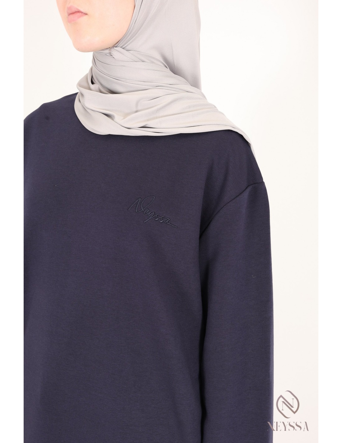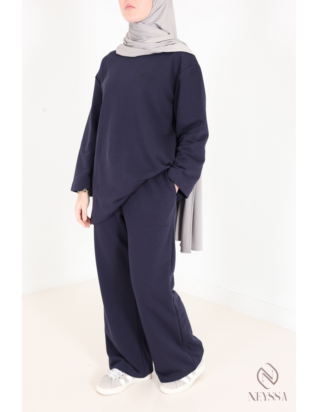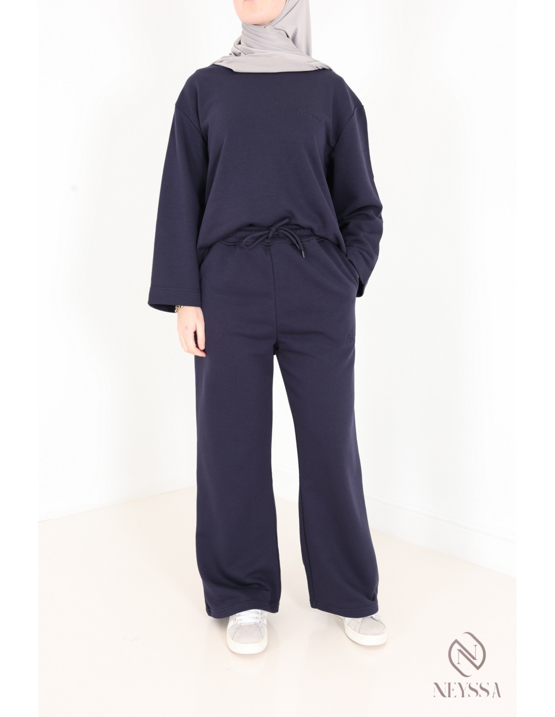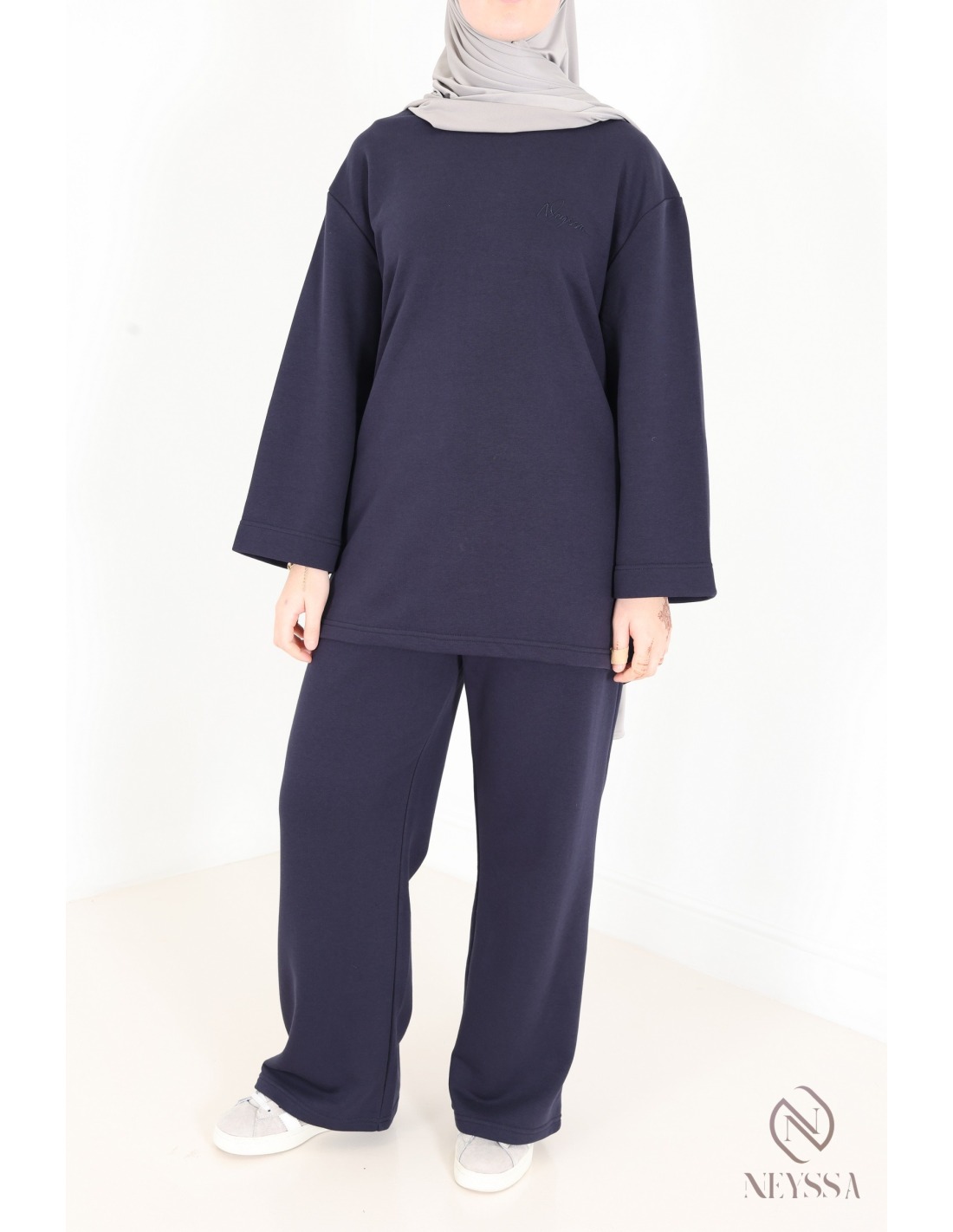 Midnight blue cotton set featuring a long-sleeve top and pants: A stylish hijab-friendly sportswear outfit