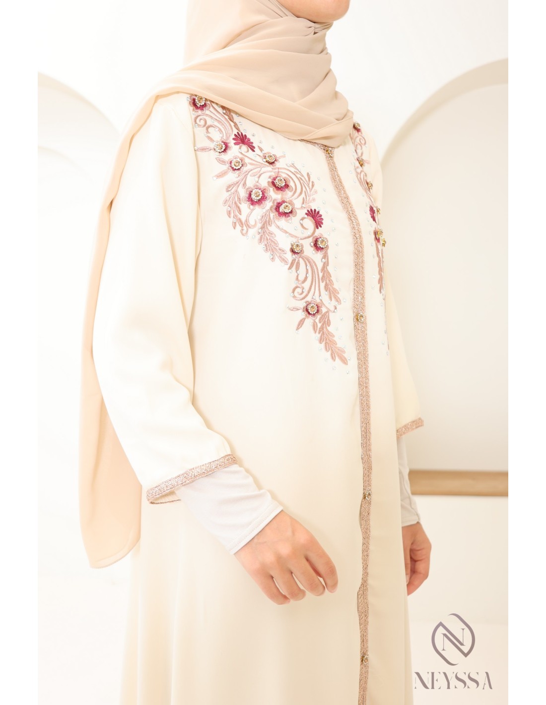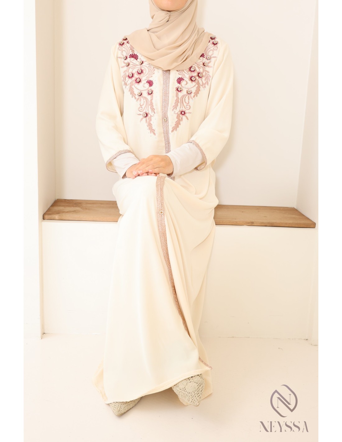 • Delicate V-neck: a modern and feminine touch suitable for all body types Sfifa embroidery: running the entire length of the dress, a symbol of oriental elegance