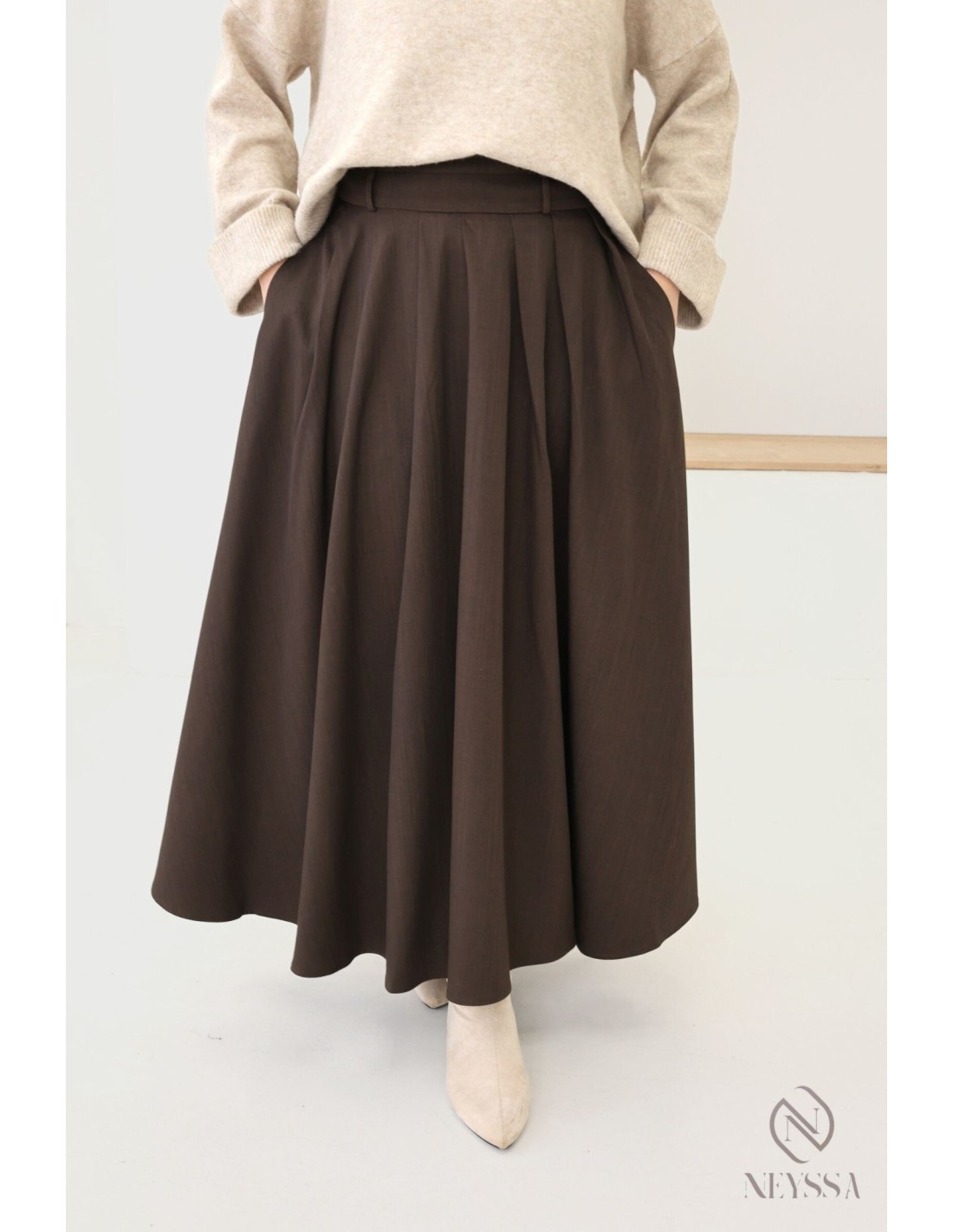 Long tailored skirt with pleats and pockets, flared cut
