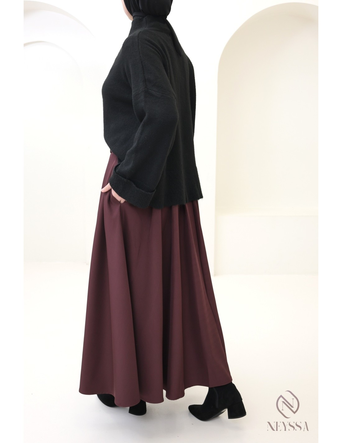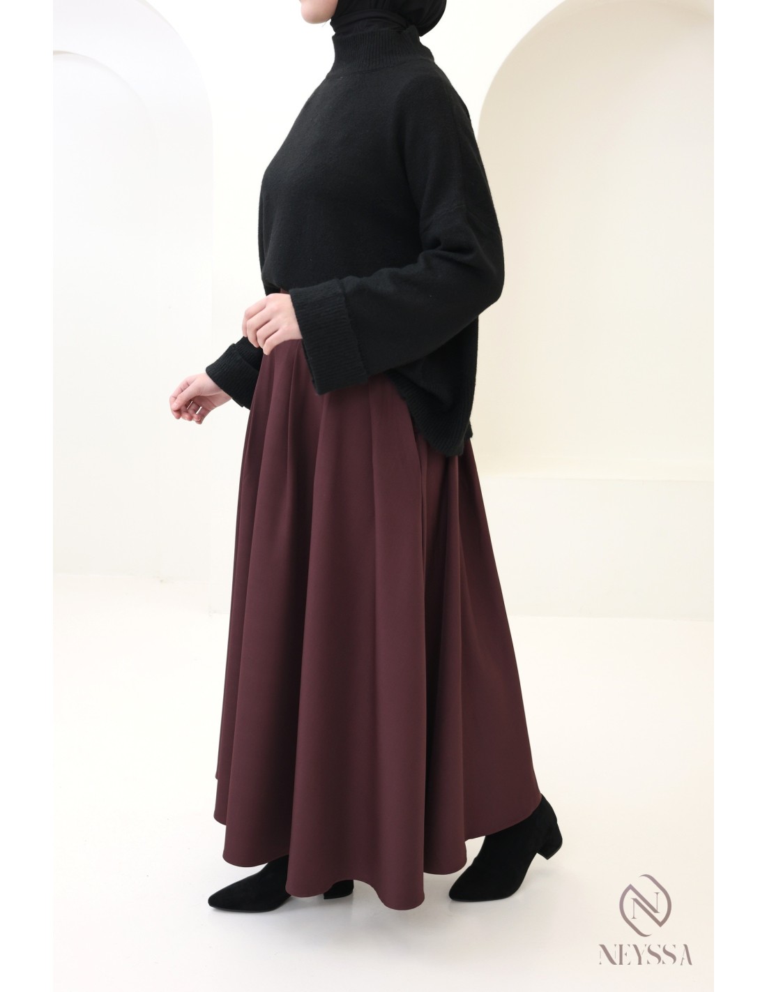 Go for the long flared skirt for a modest, on-trend look.