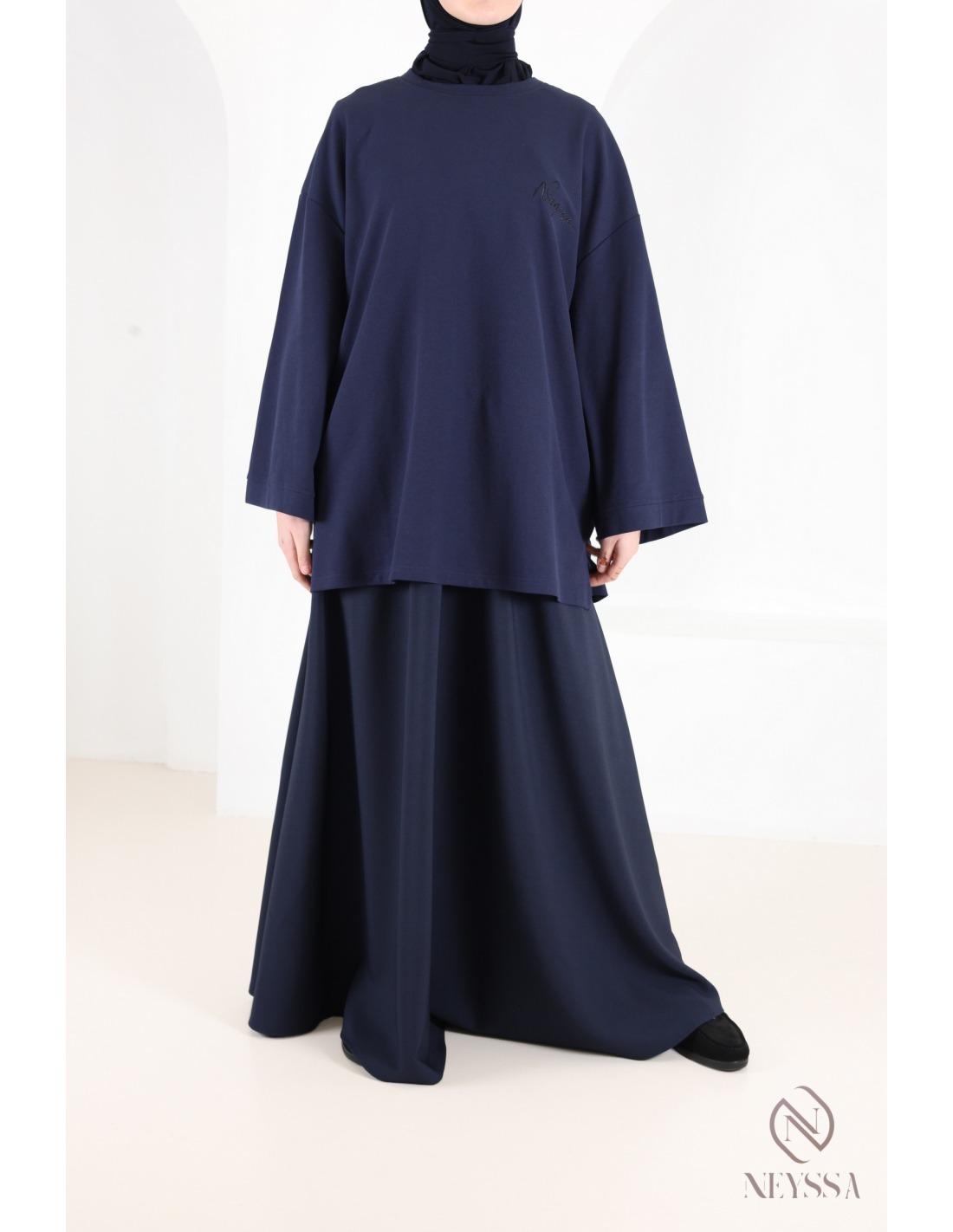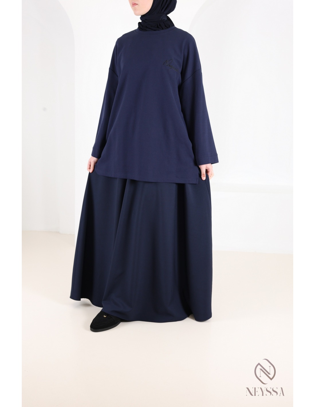 This modest long flared skirt is also available with its top in the top and skirt category under the name TAMARA.