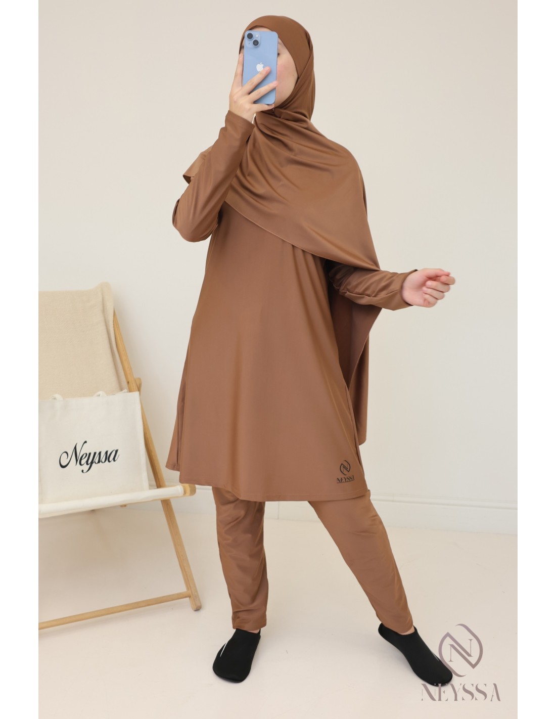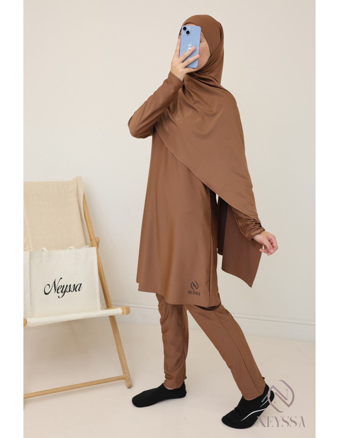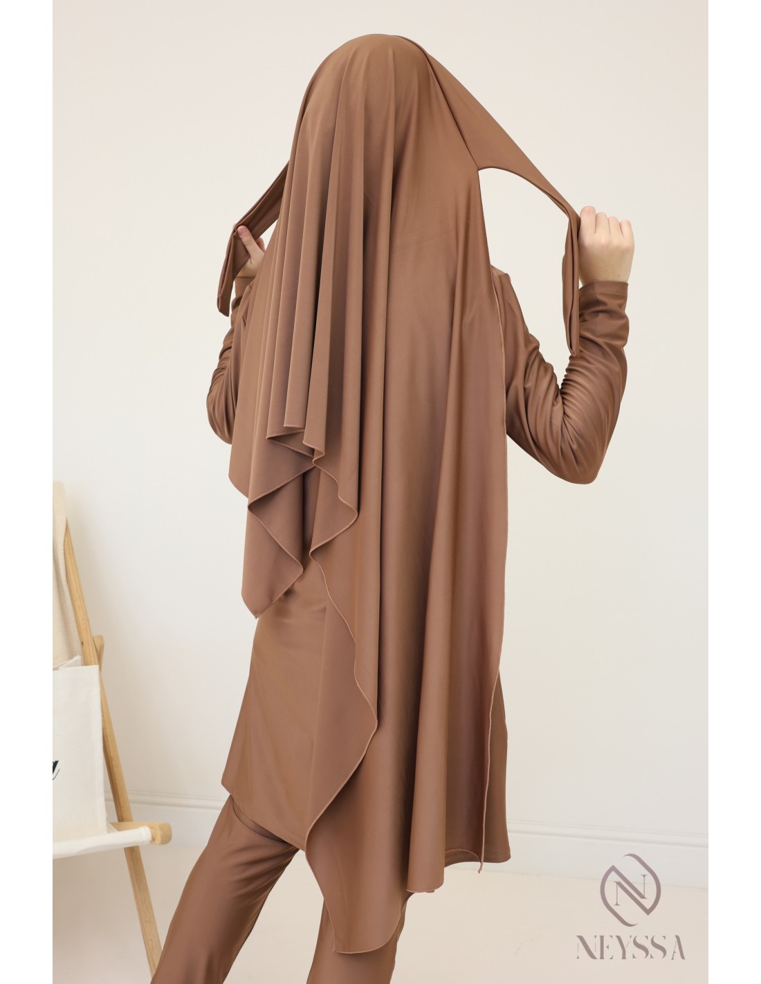Loose, wide hazelnut burkini with tie-on hijab