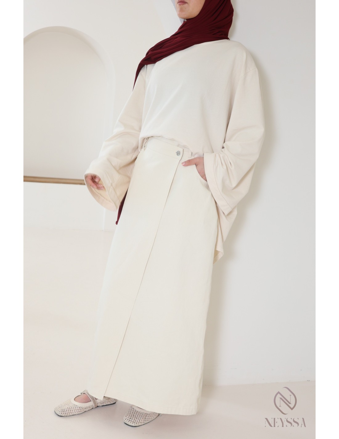 We have just the thing for you! Choose this long straight wrap skirt in raw denim from our trendy hijabi clothing category.