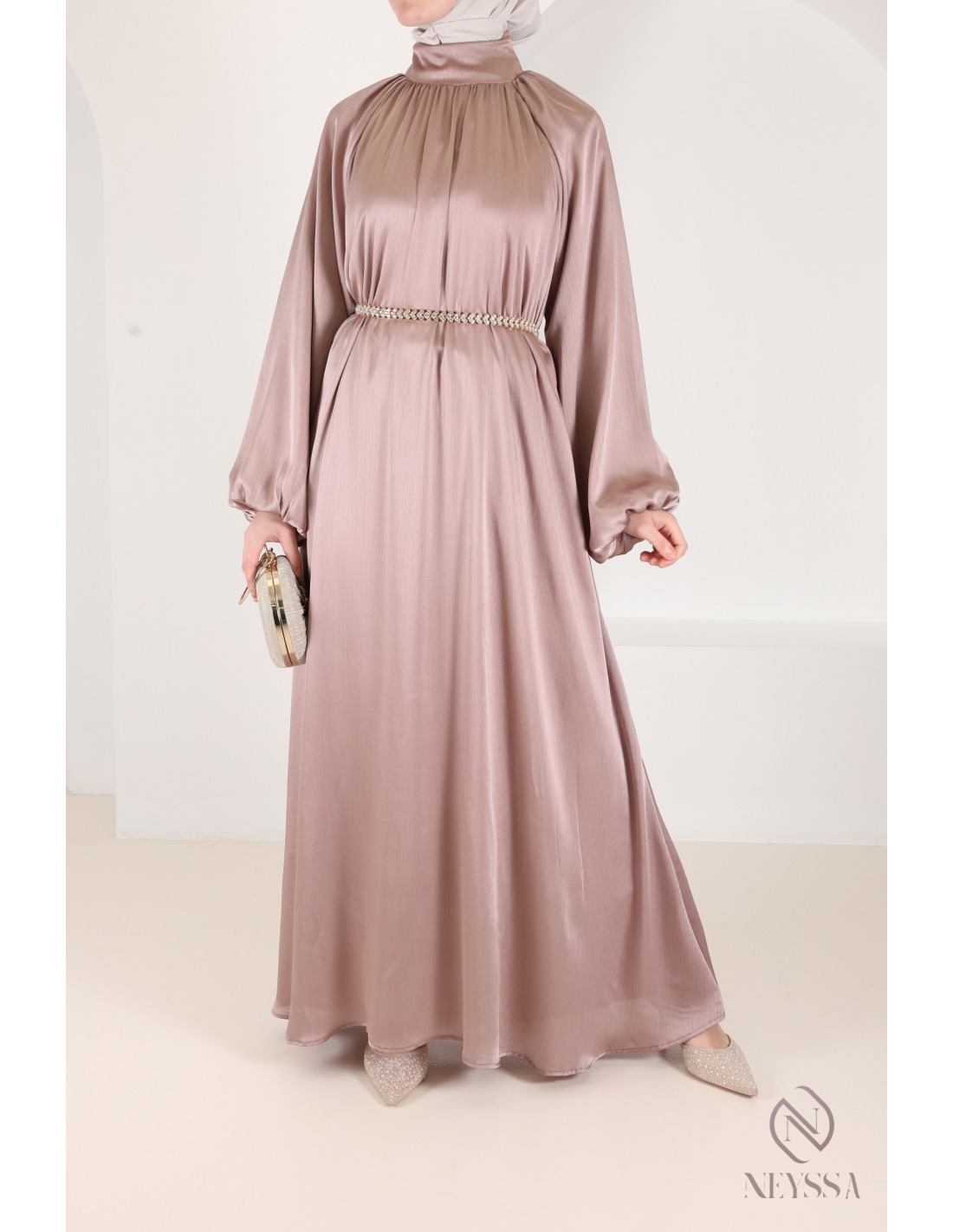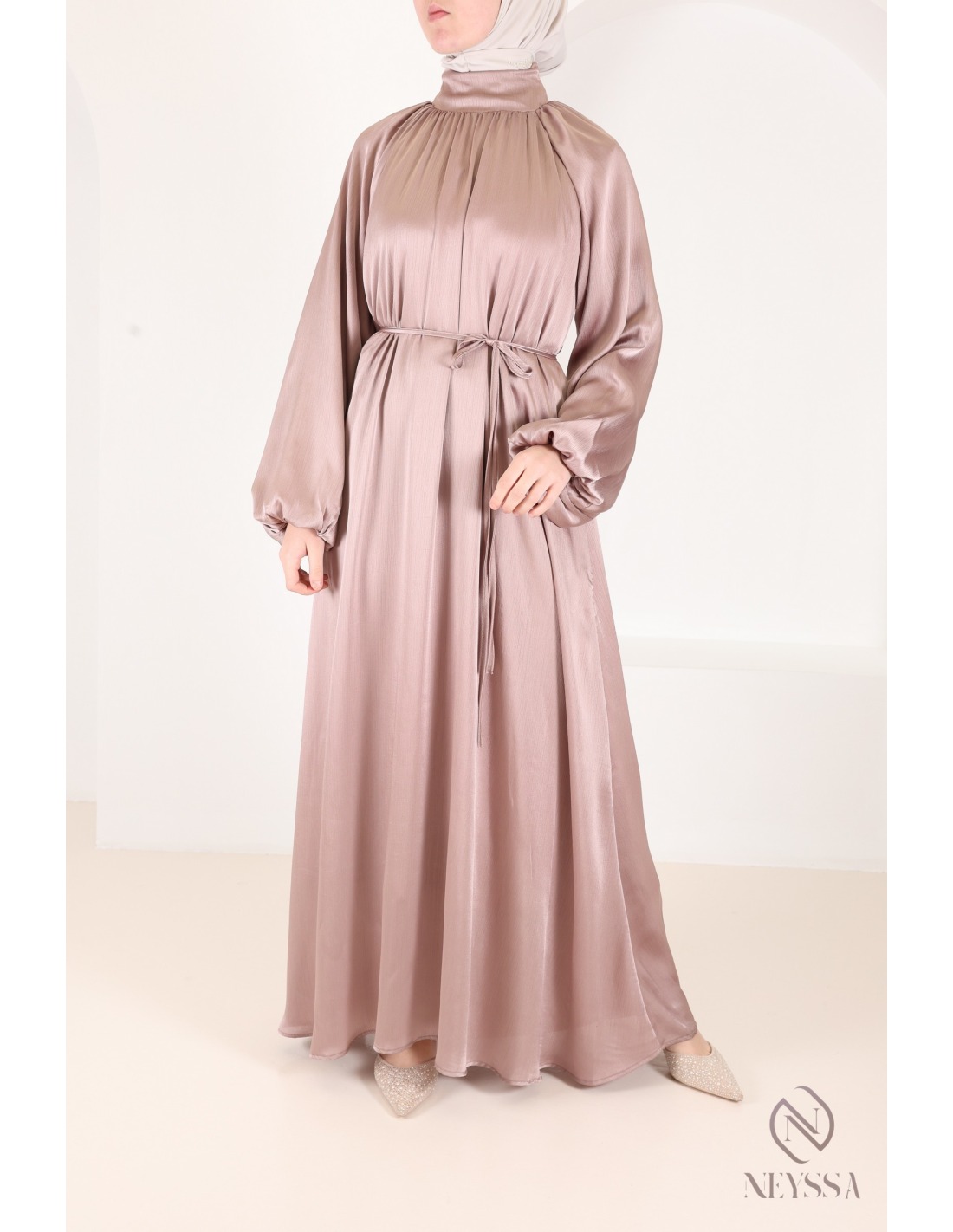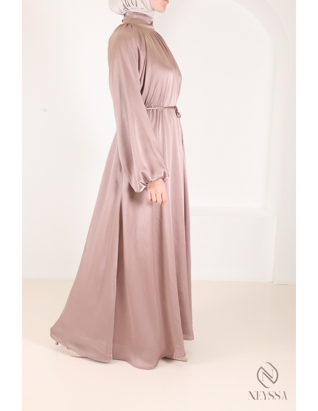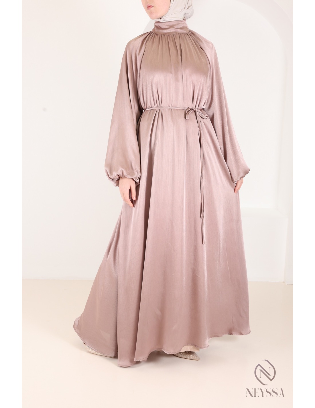 Abaya satin flared dress for women hijabi puffed sleeves