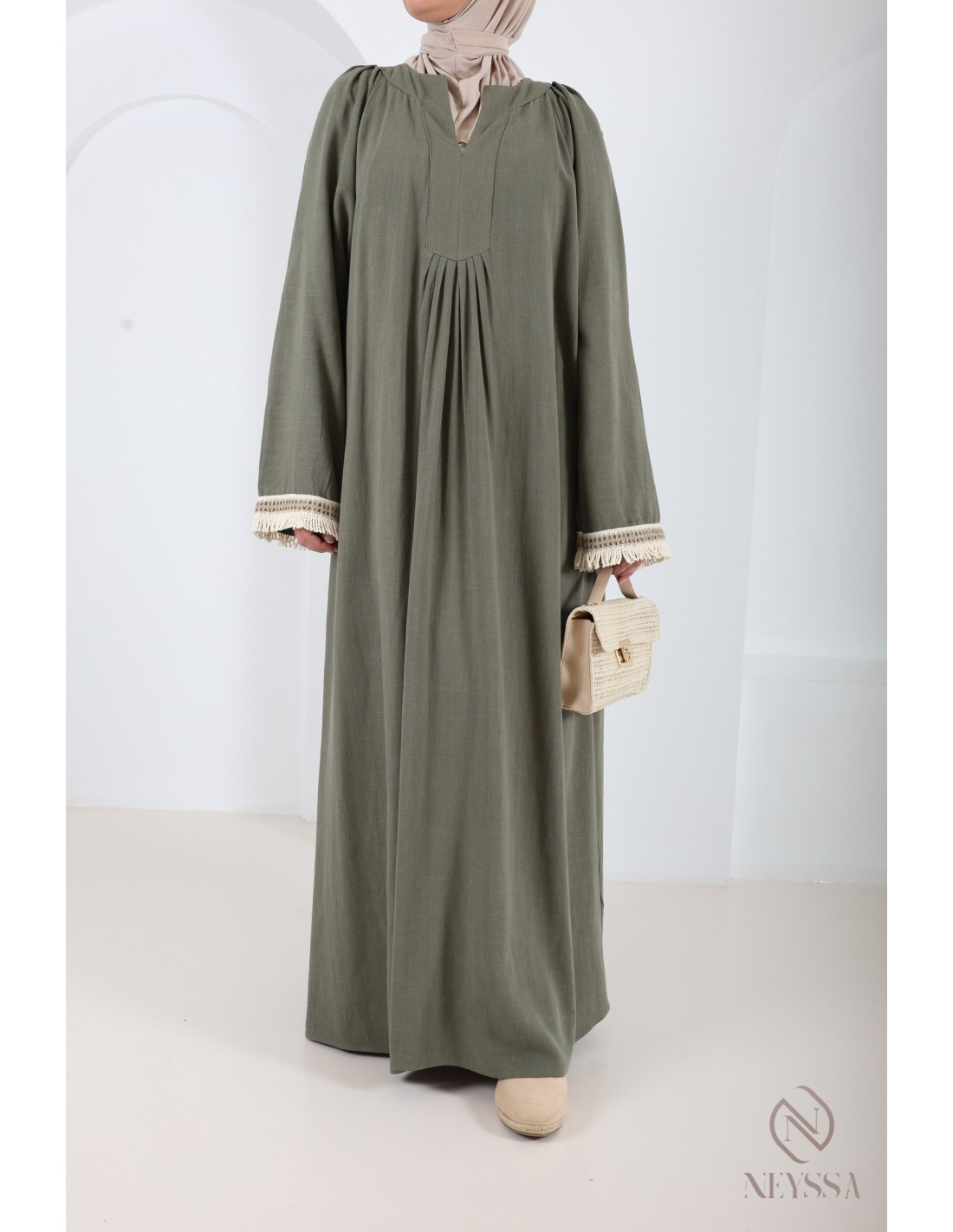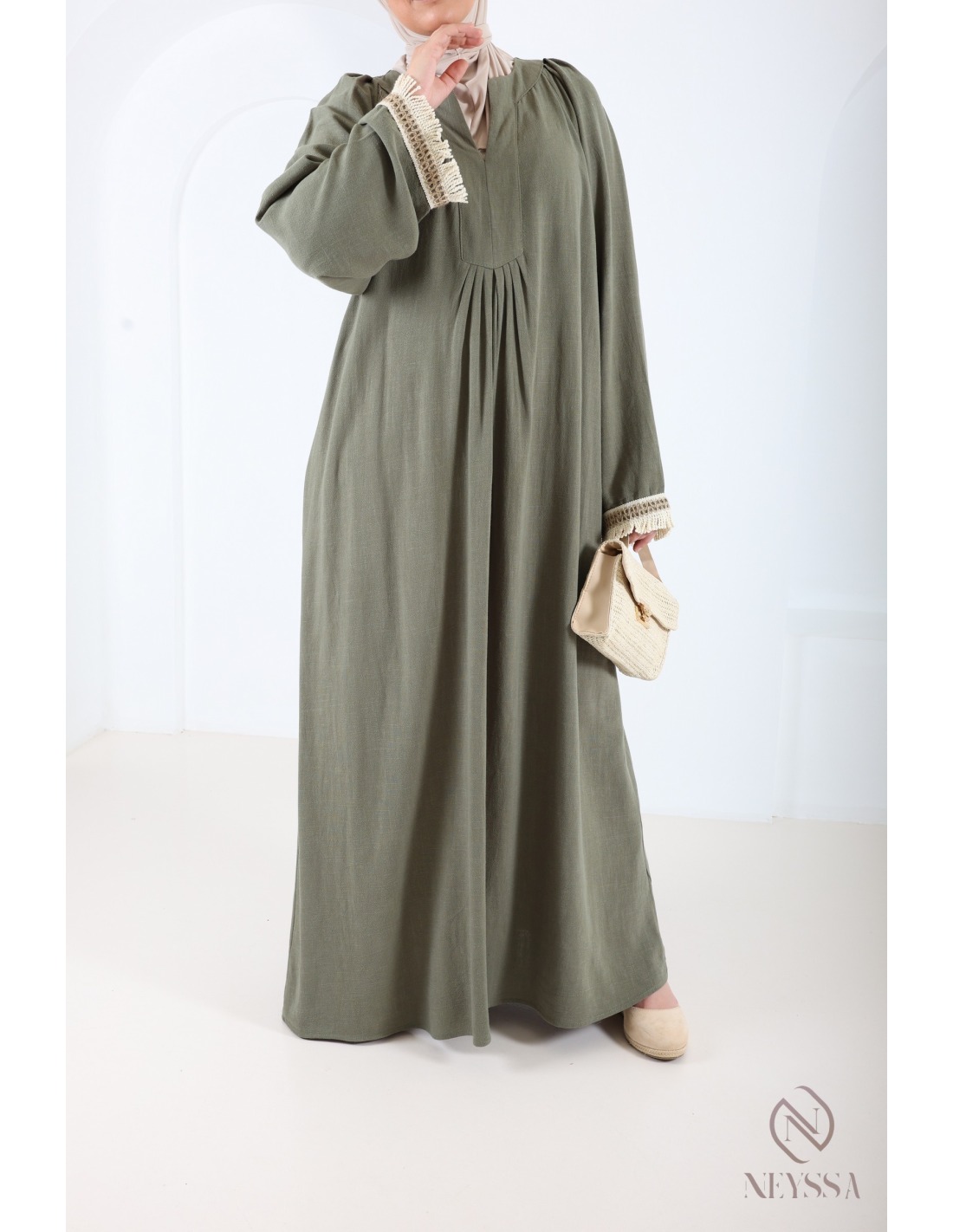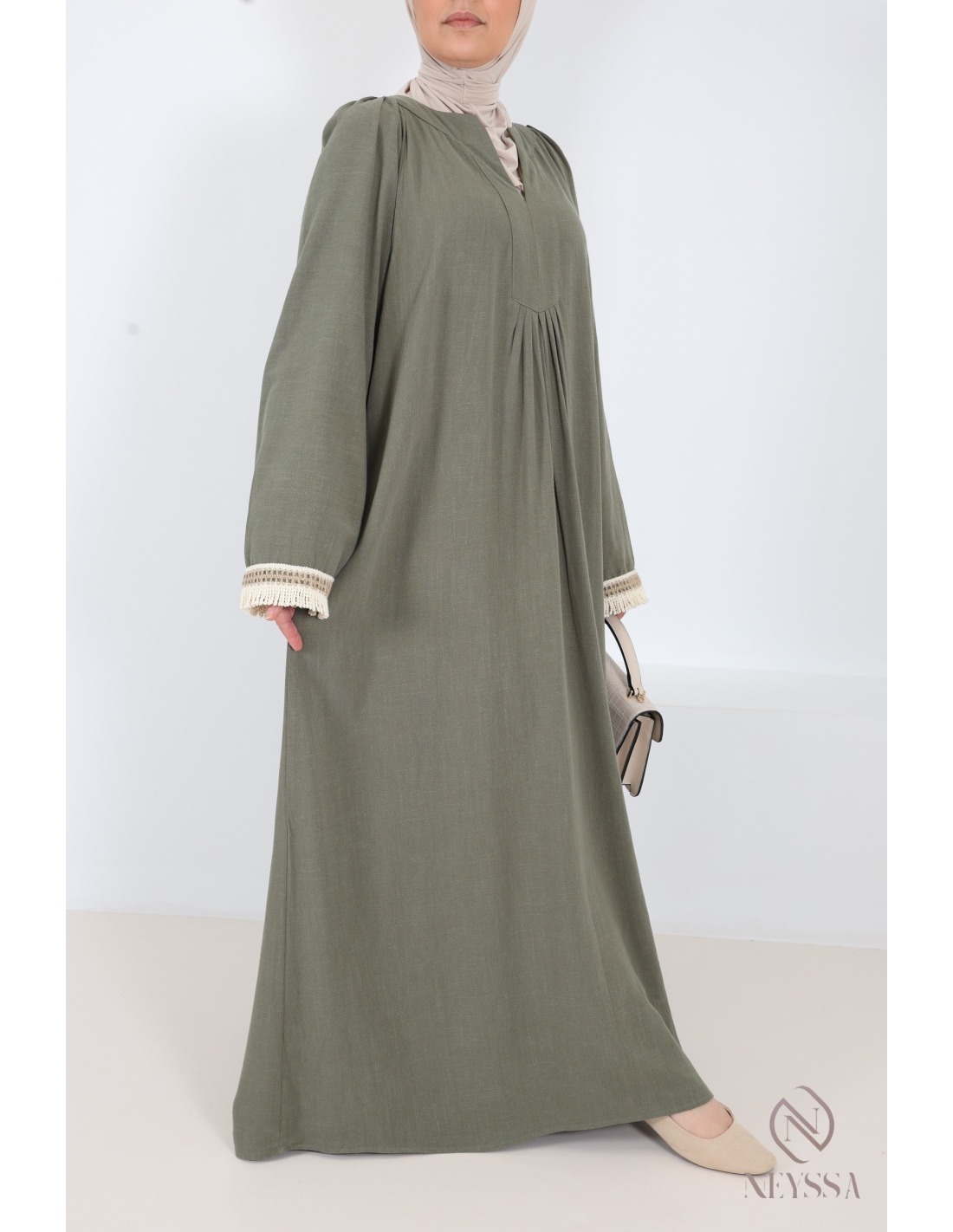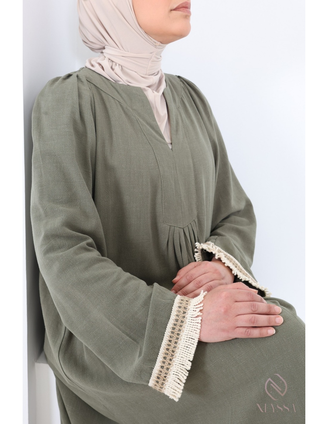Khaki linen-blend maxi dress with trendy fringe sleeves