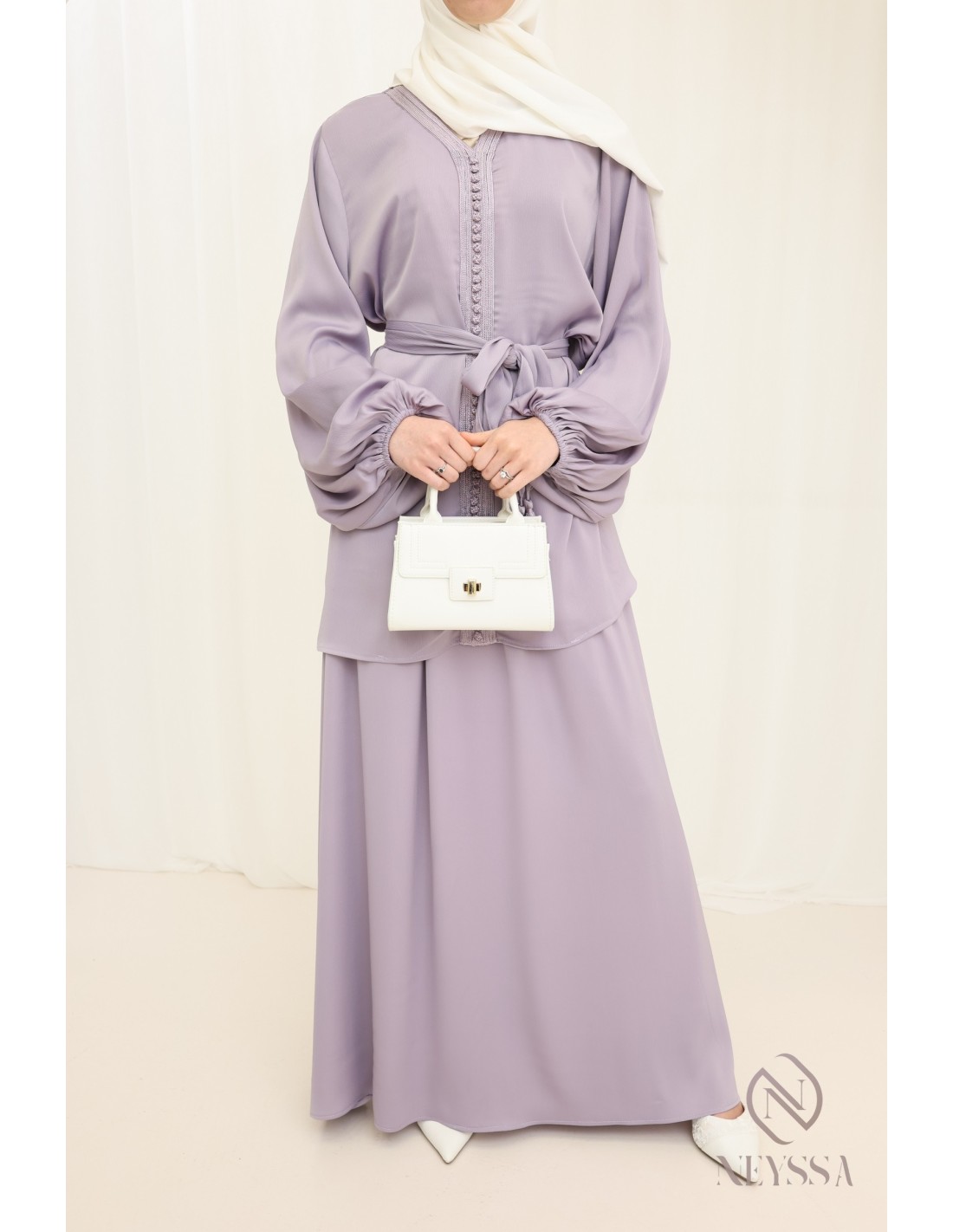 This short caftan and skirt set embodies the elegance and refinement of Oriental fashion. The caftan features a light, flowing fabric, perfect for special occasions.