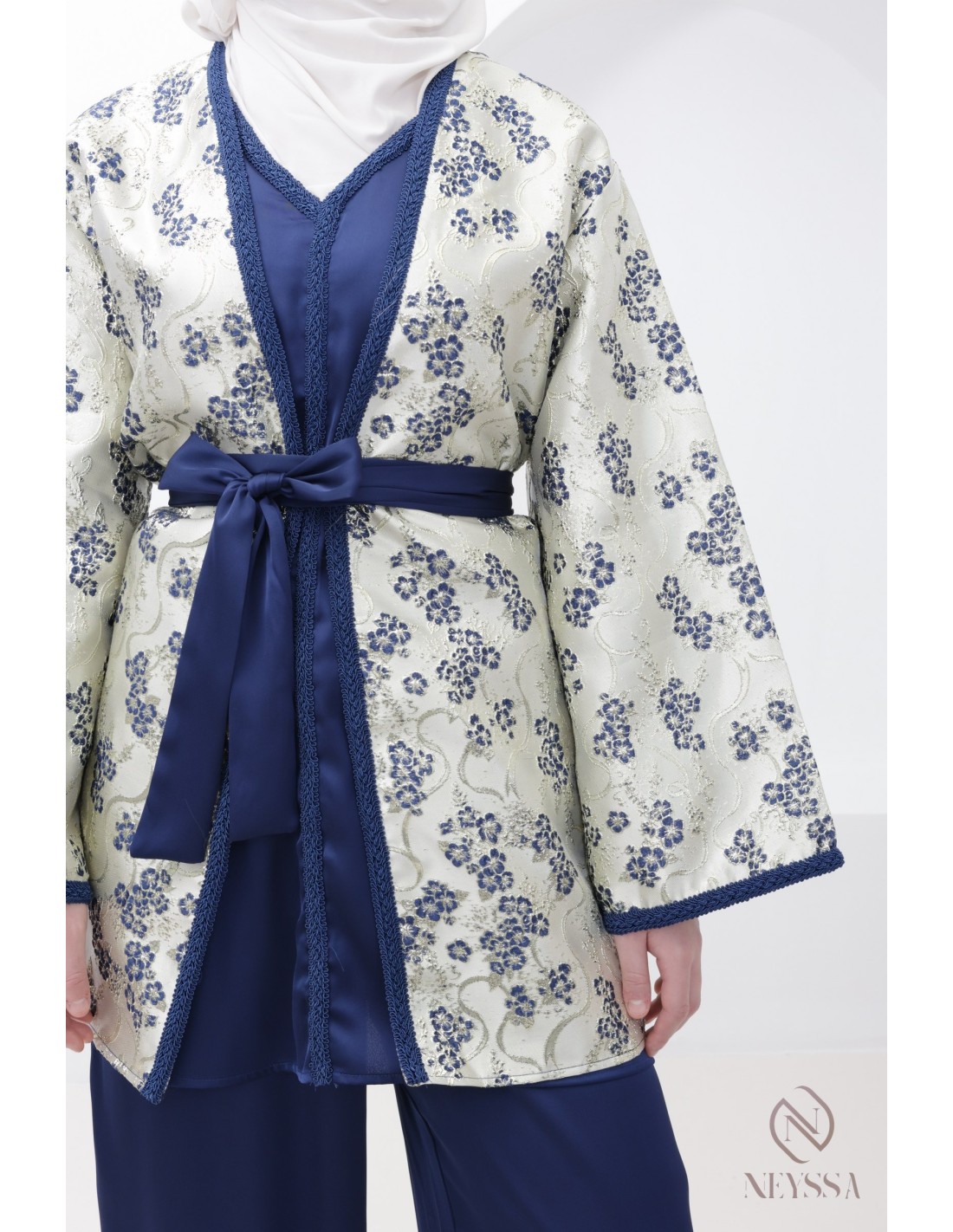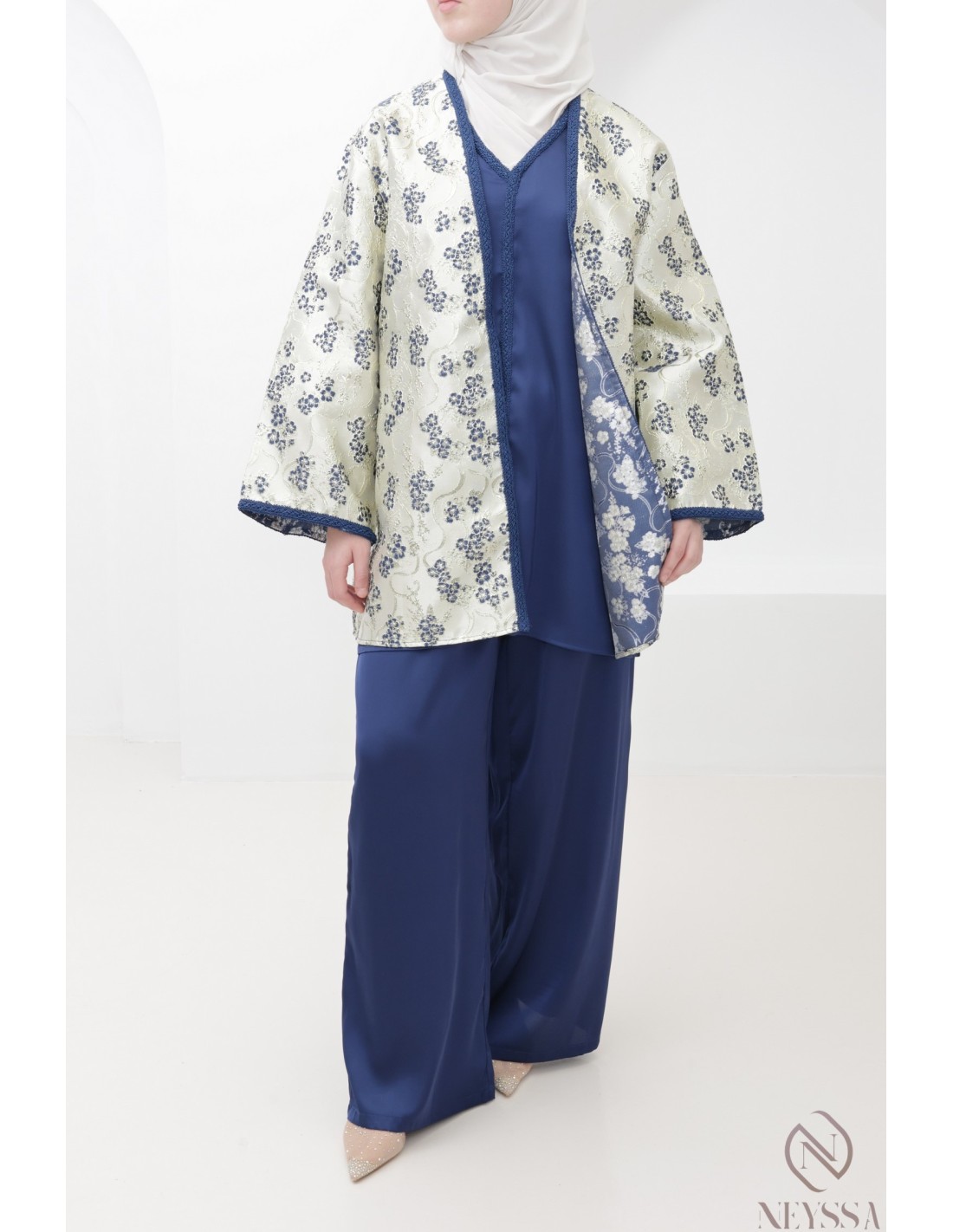 Fall in love with this 4-piece blue brocade kimono set with modest women's palazzo pants: