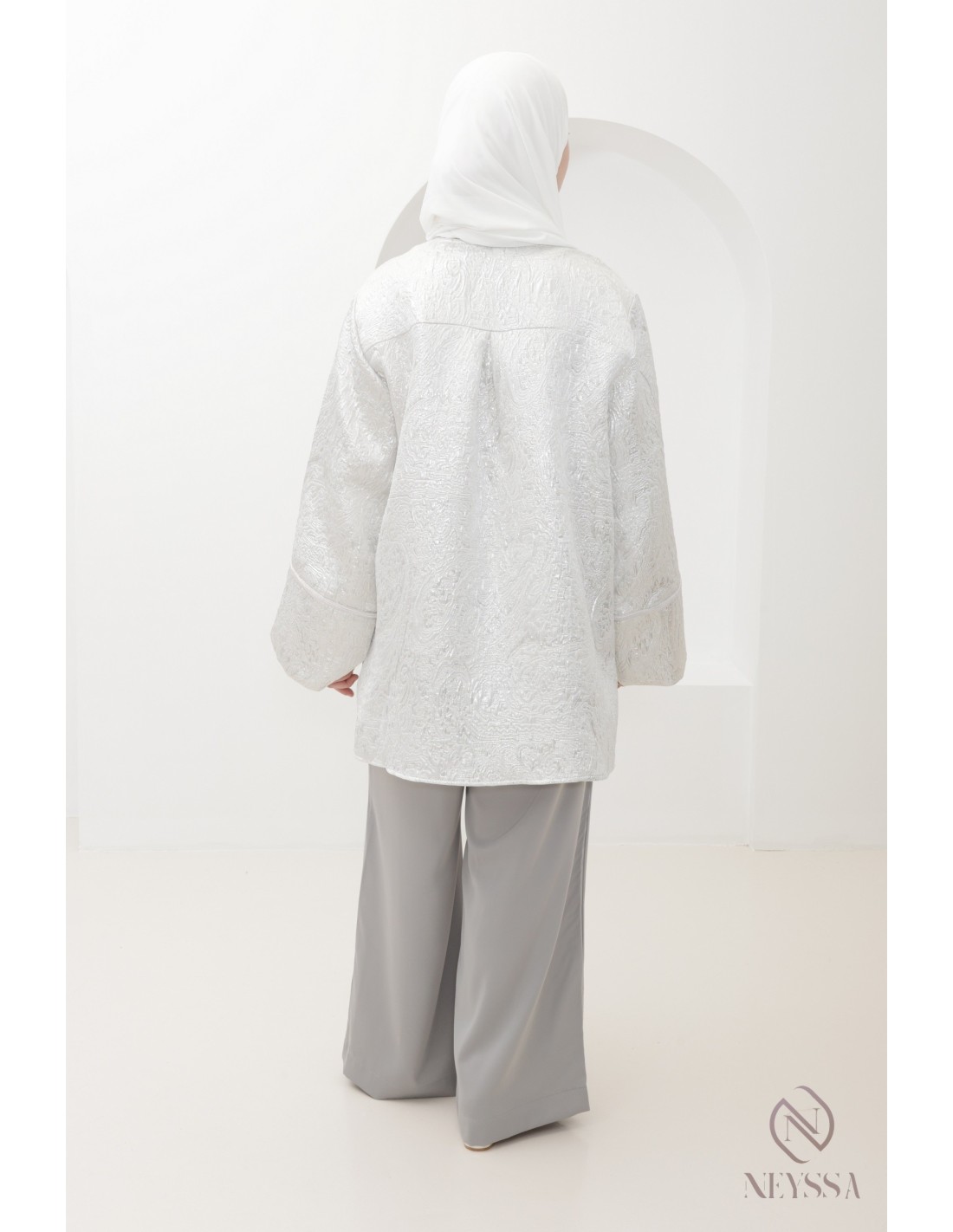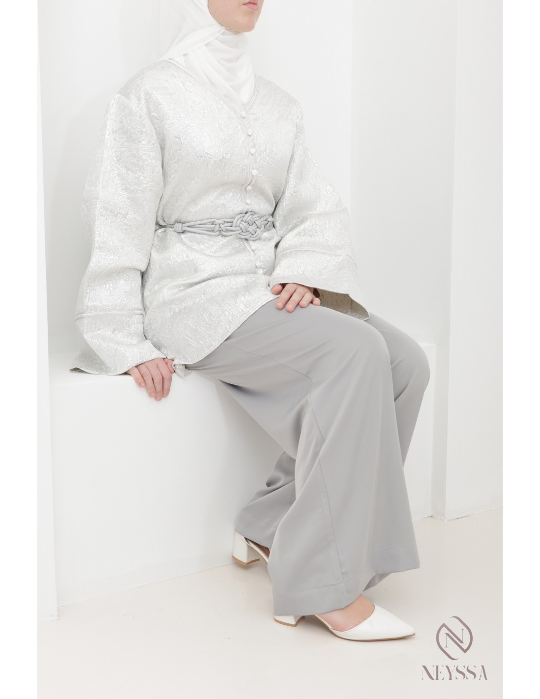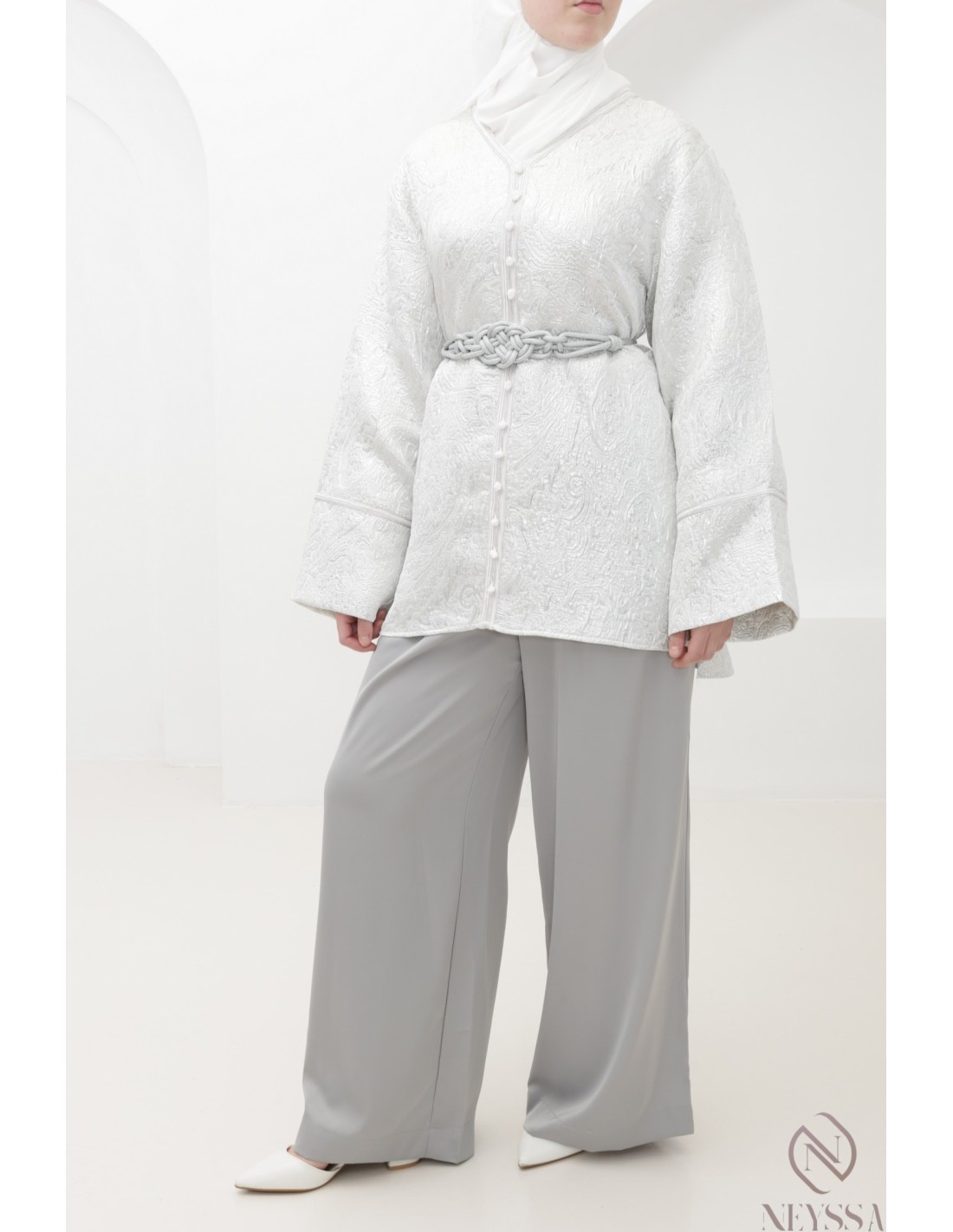 • Embroidered brocade tunic: elegant and refined, it is enhanced by delicate embroidery. Its loose sleeves add a beautiful fluidity and sophisticated look to the ensemble.