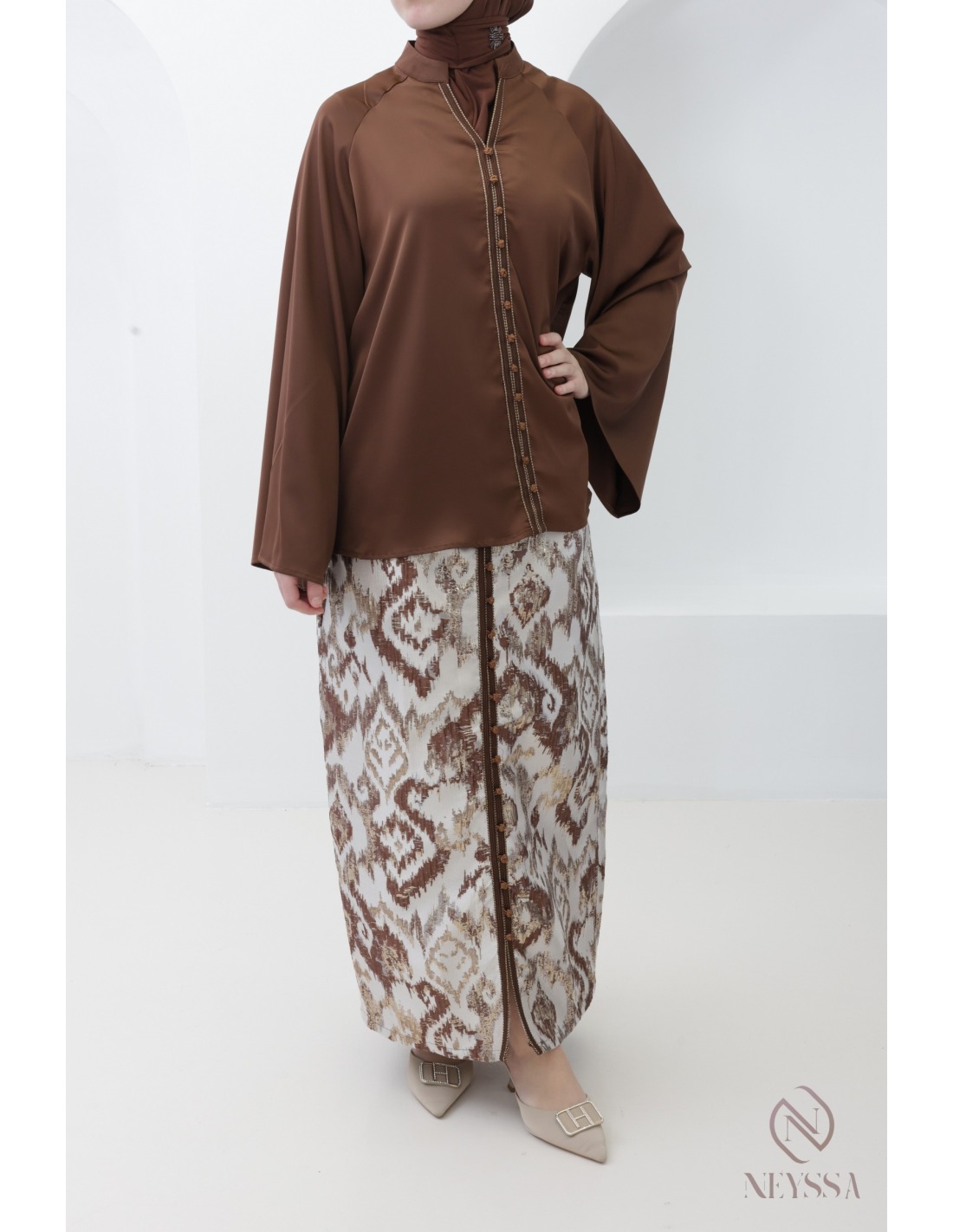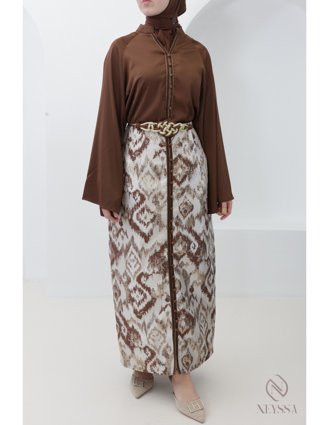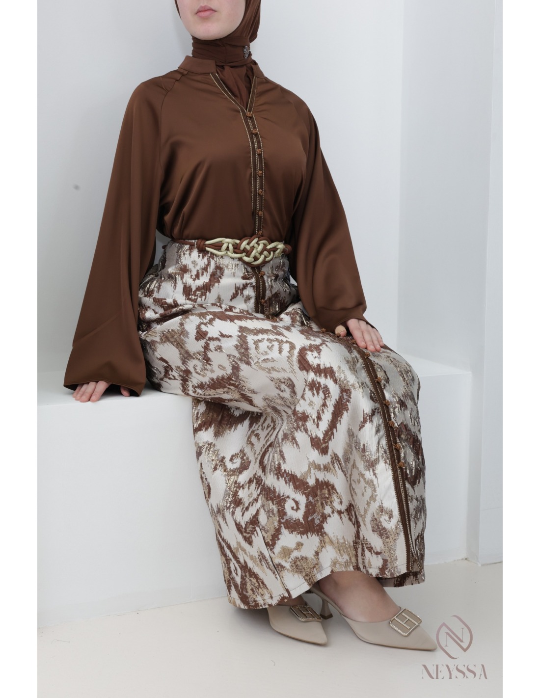 - Straight brocade skirt with sfifa: made from high-quality brocade, its straight cut slims the silhouette while the sfifa adds a refined traditional Moroccan touch.