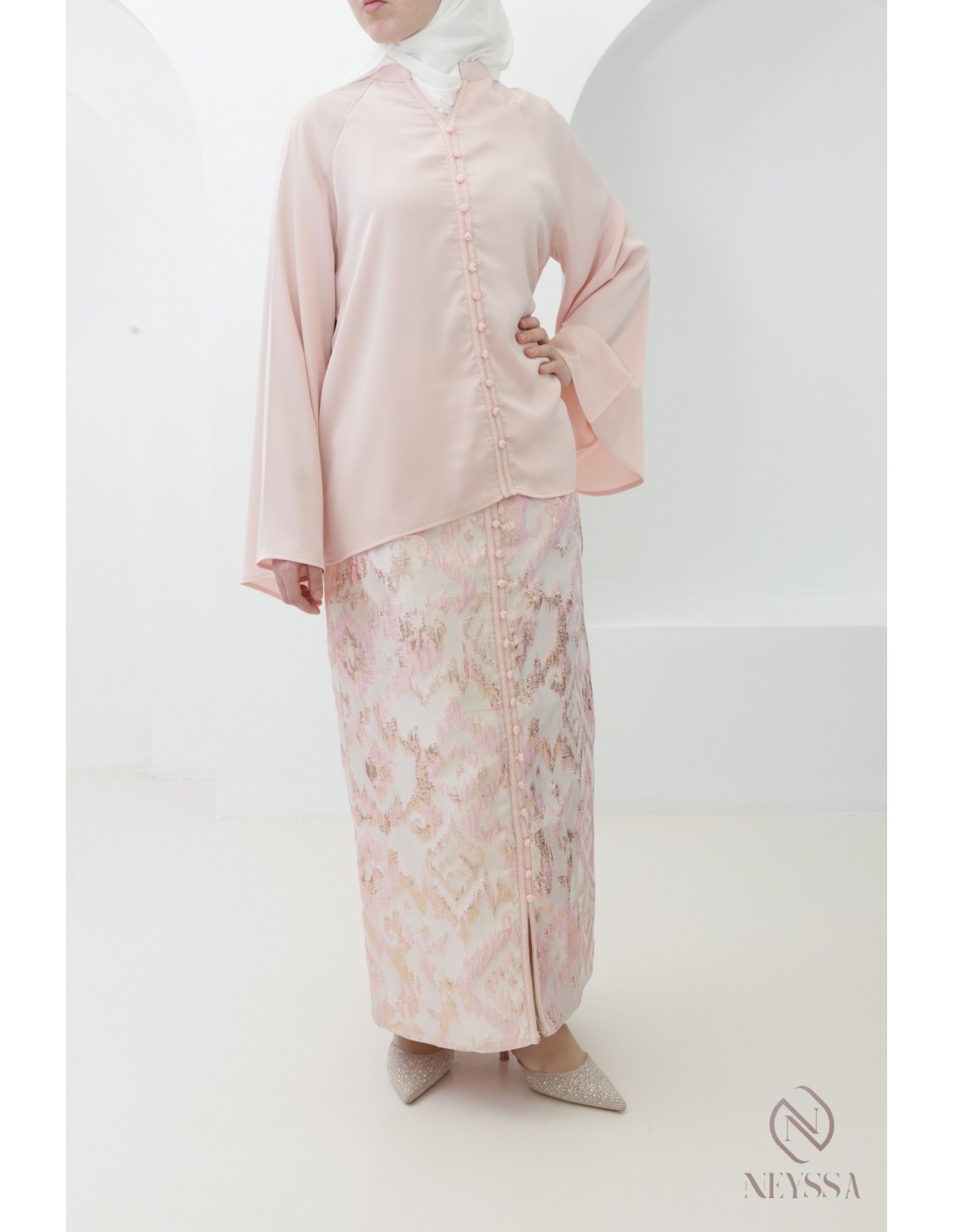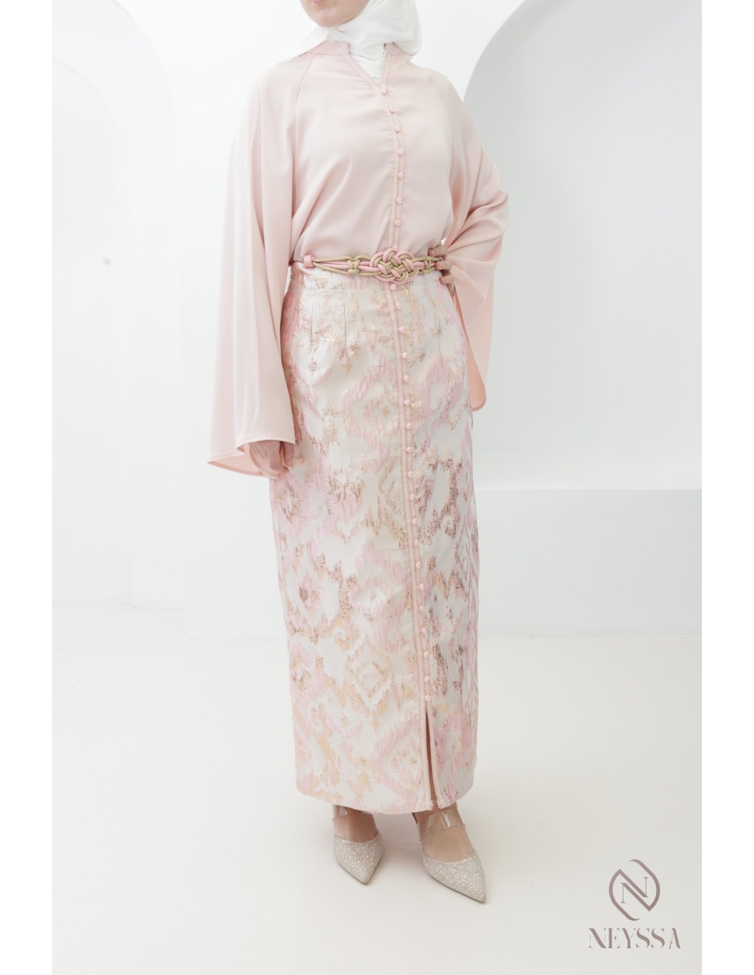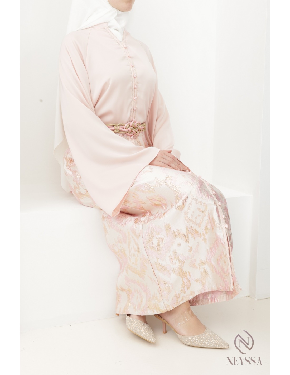 You'll fall in love with this 3-piece powder pink brocade set for veiled women: