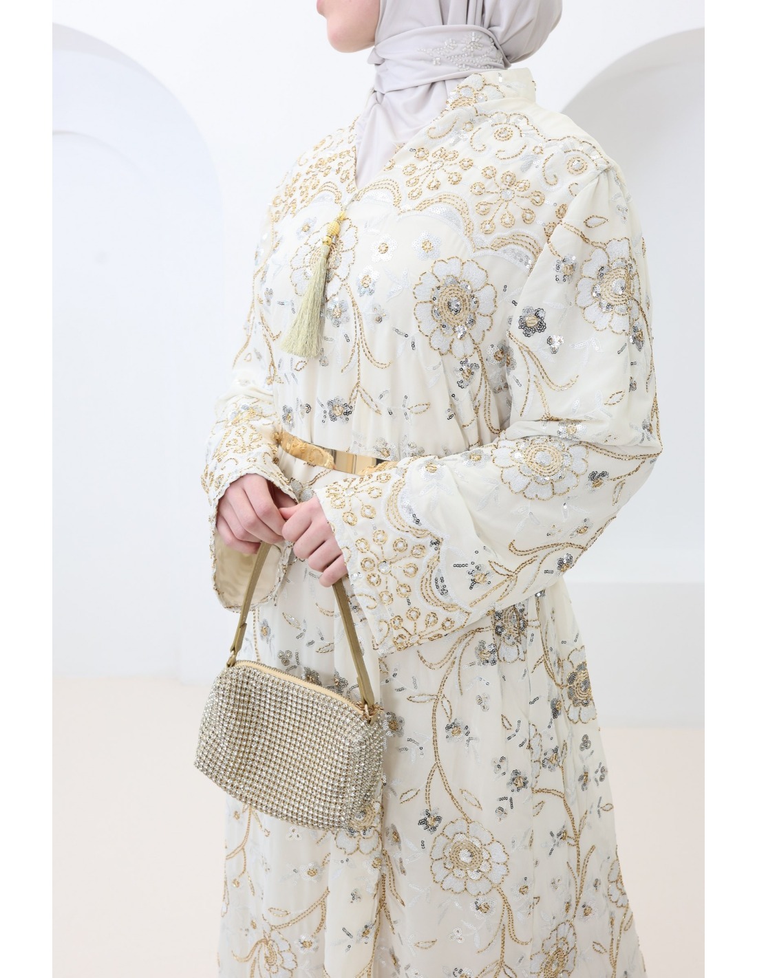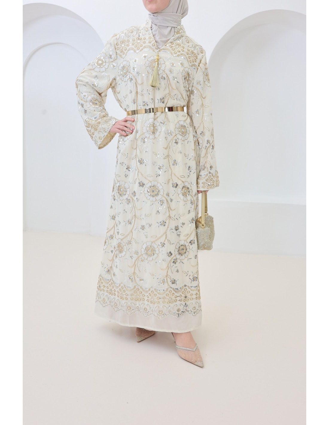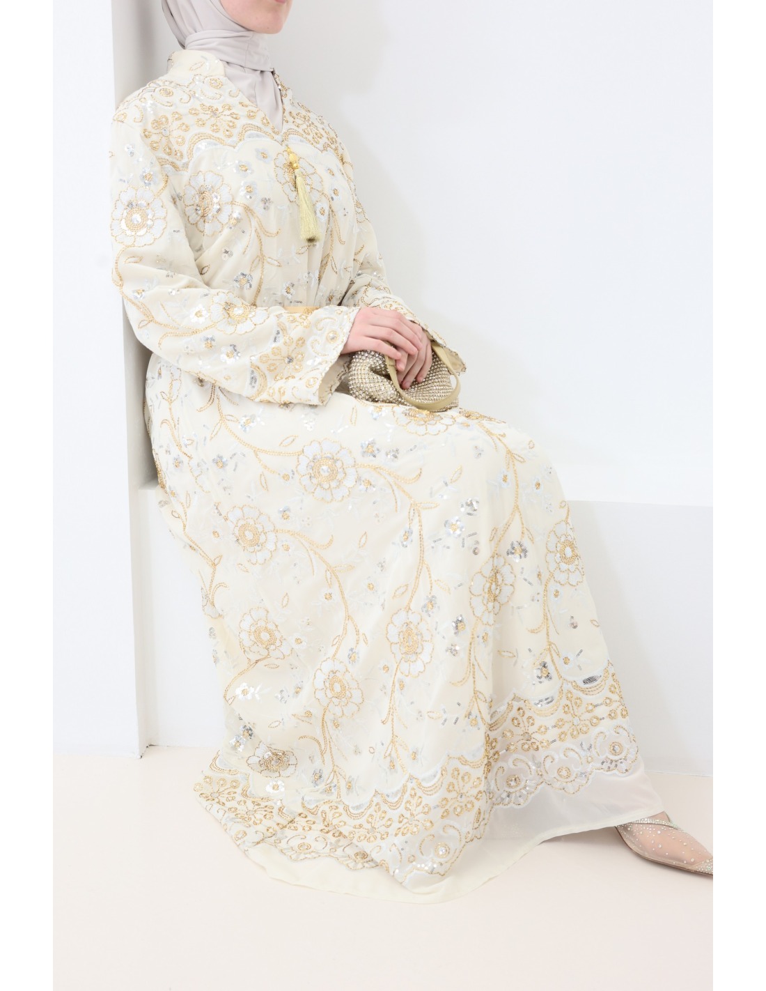 - Beaded caftan: floral embroidery and rhinestones delicately applied for a luxurious look.