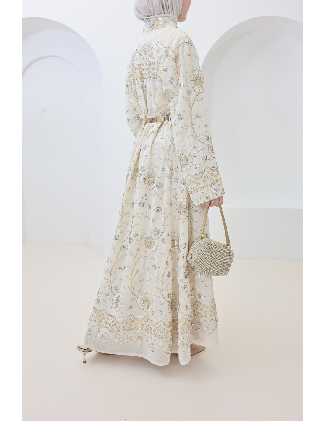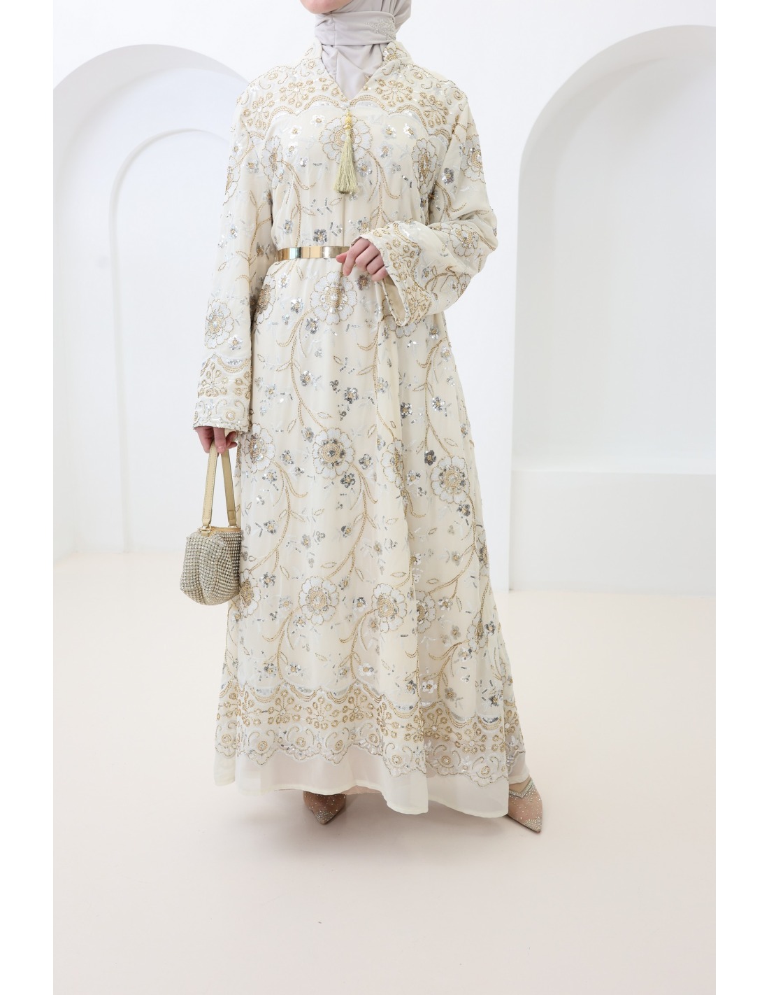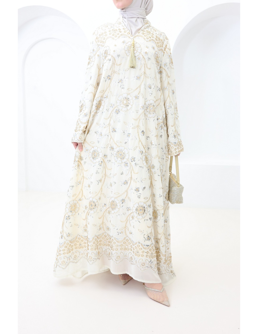 - Beaded caftan: floral embroidery and rhinestones delicately applied for a luxurious look.