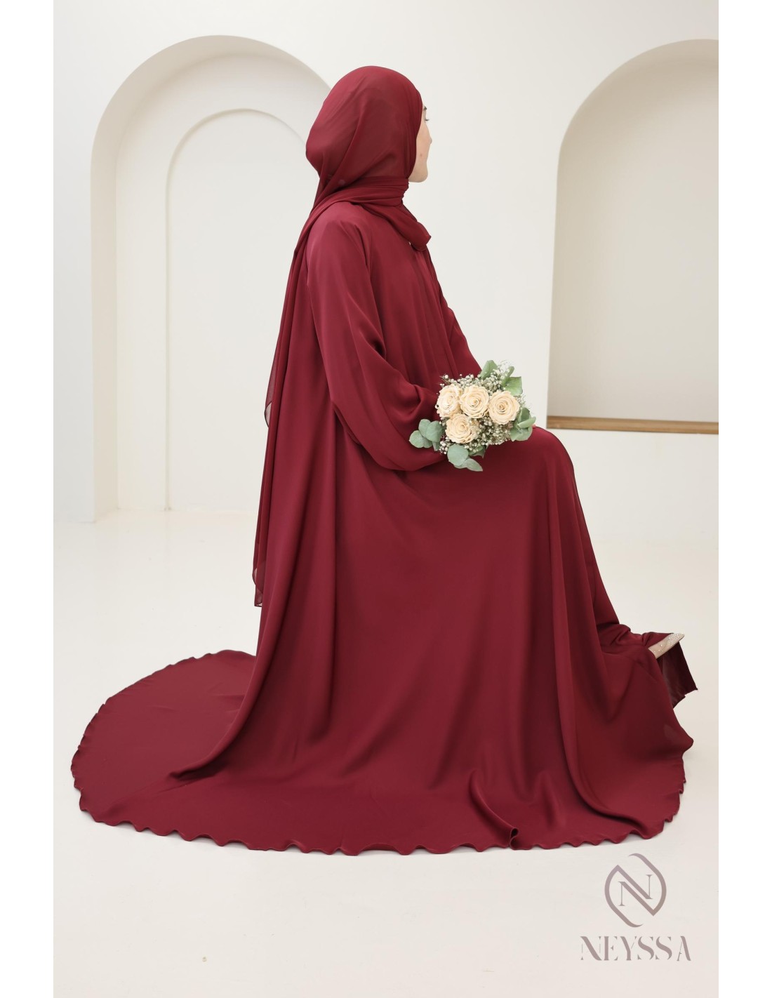 • Perfect personalized finishes: A golden Neyssa plaque is hand-sewn onto the sleeve of the abaya.