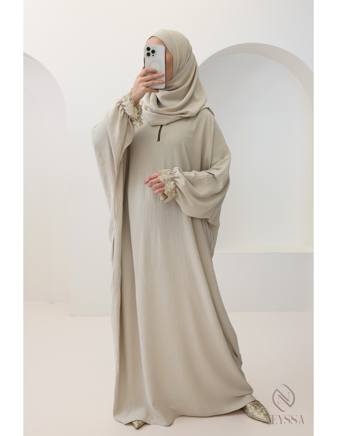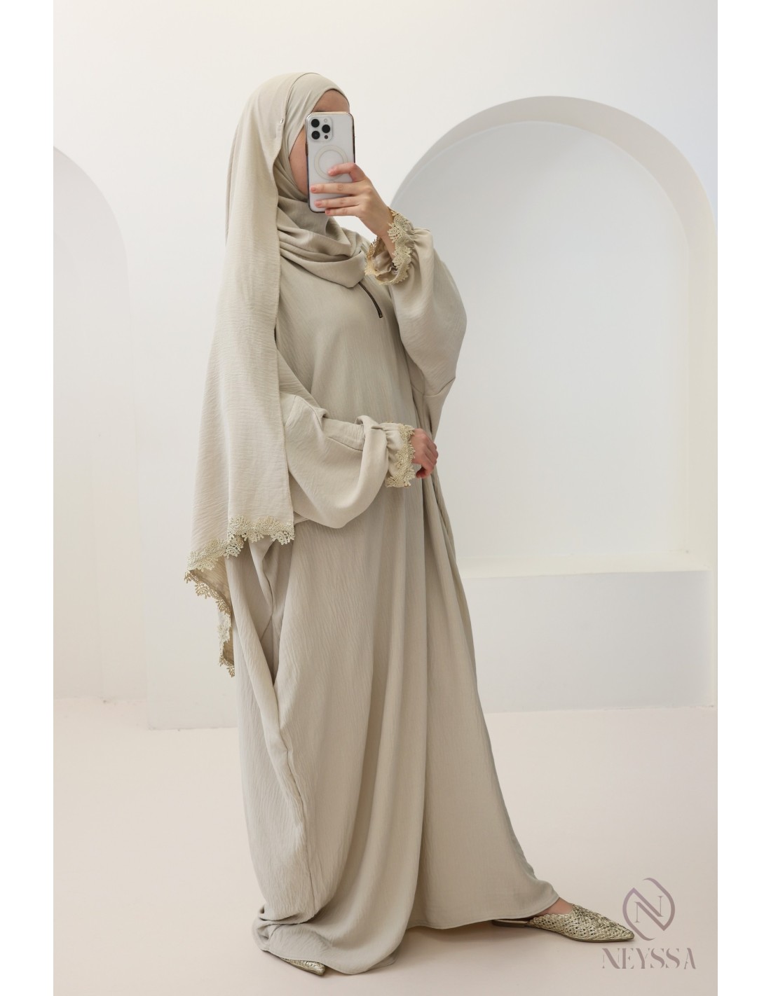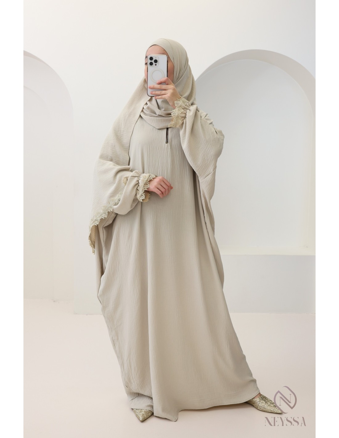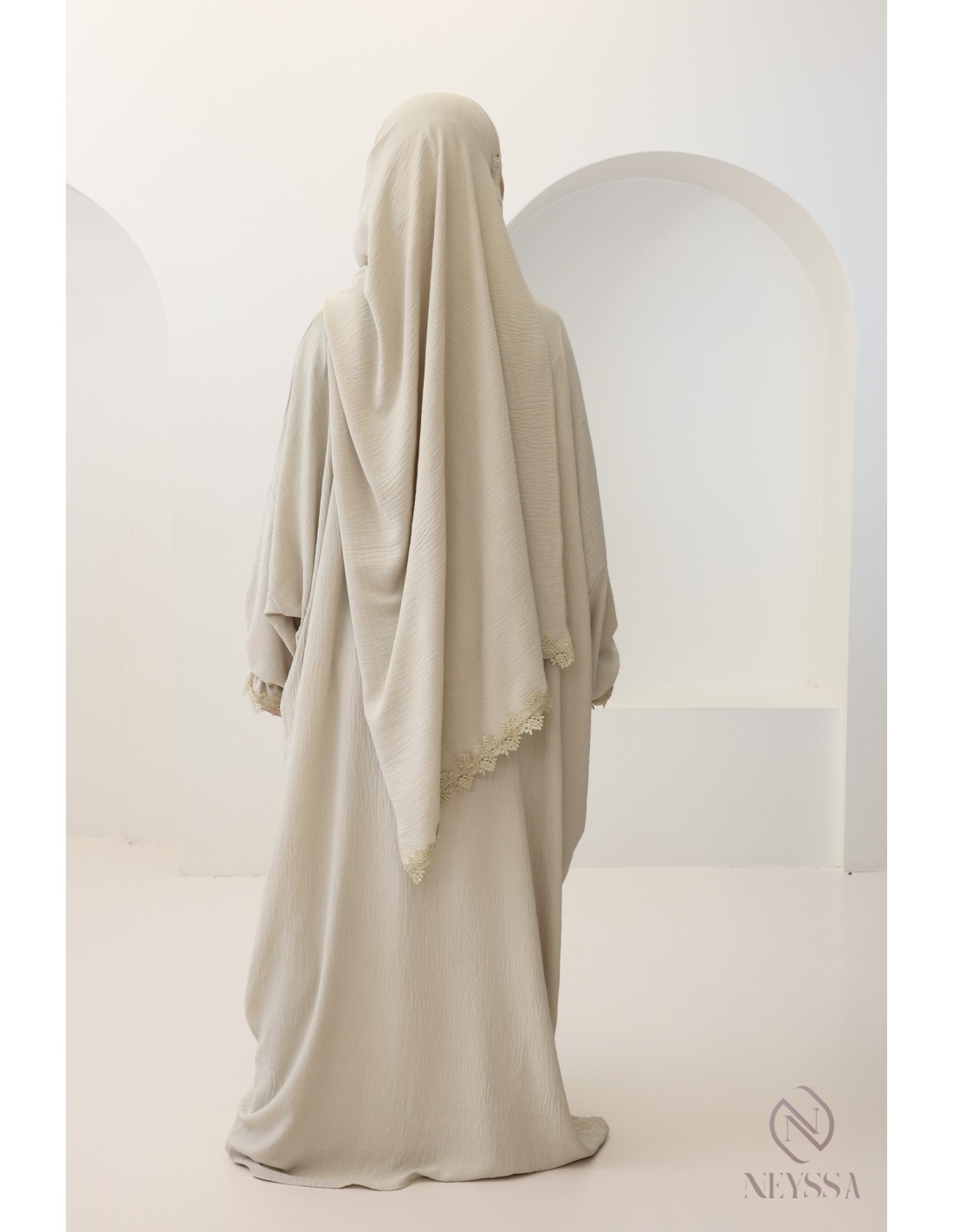• Oriental-style embroidery: pretty lace motifs adorn the cuffs of the dress and the end of the hijab, adding a touch of elegance and originality to the piece.