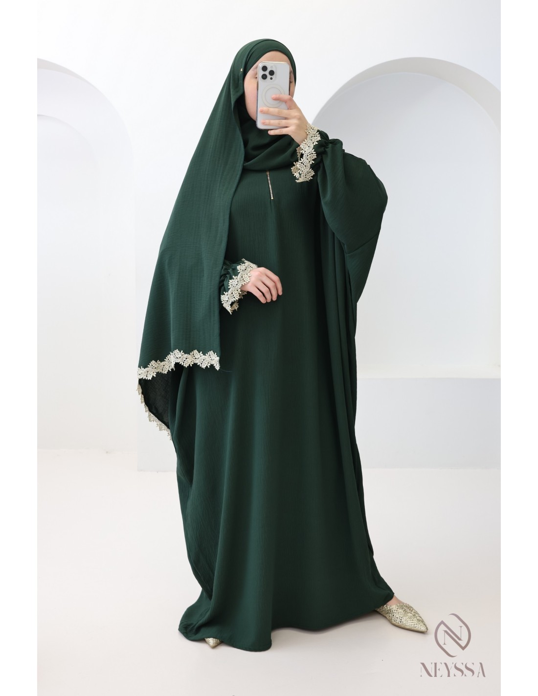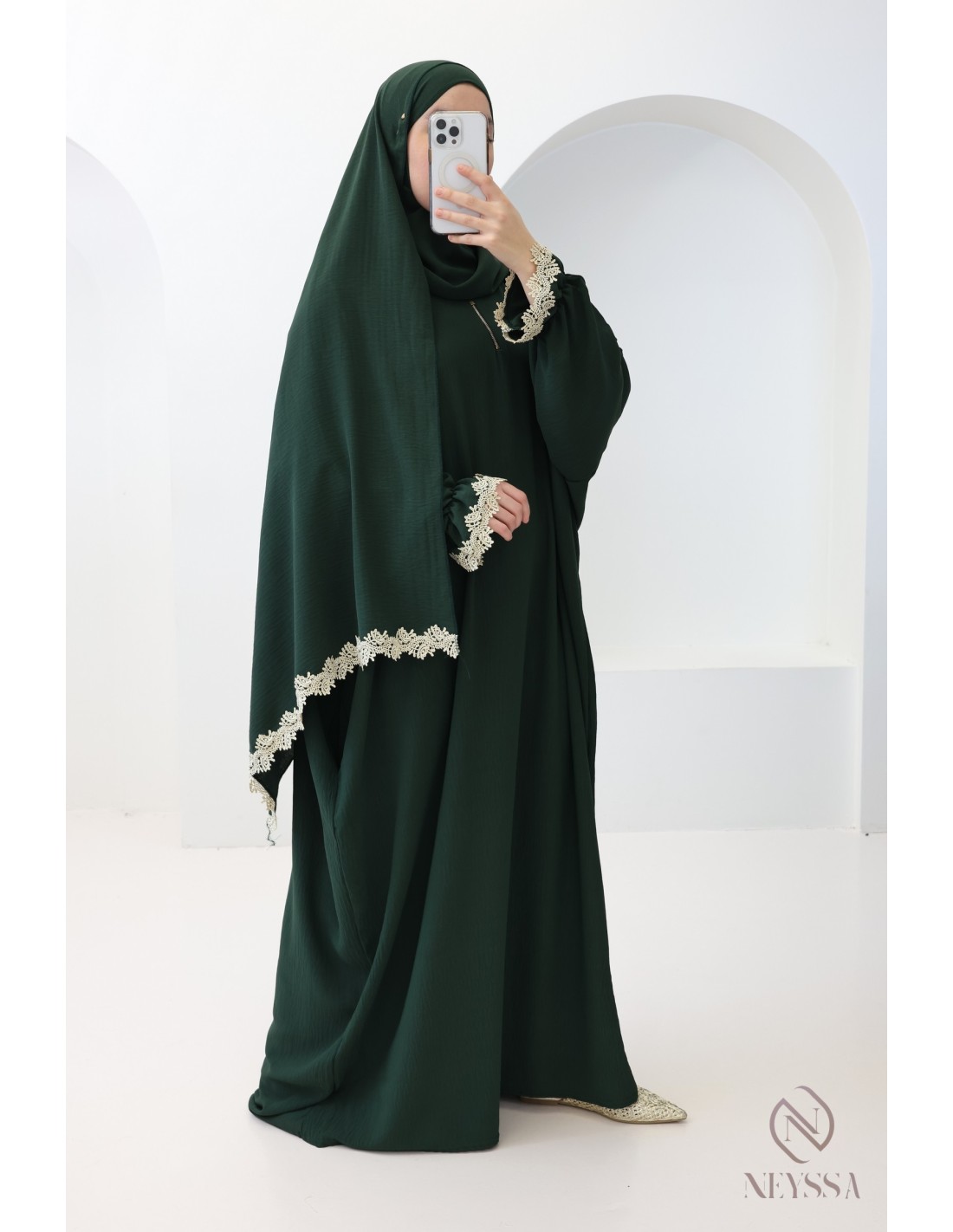 • Oriental-style embroidery: pretty lace motifs adorn the cuffs of the dress and the end of the hijab, adding a touch of elegance and originality to the piece.