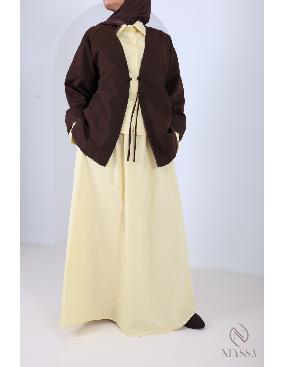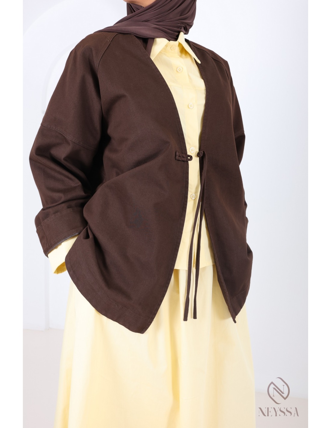 - Kimono-style jacket: Discreet button fastening at the front.