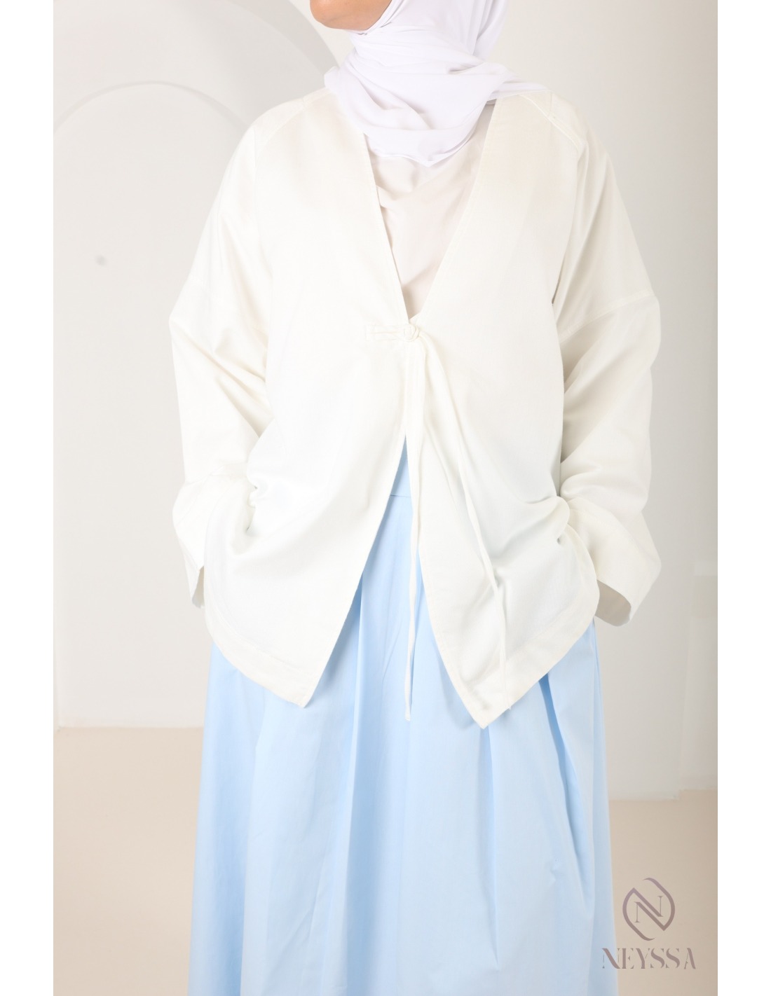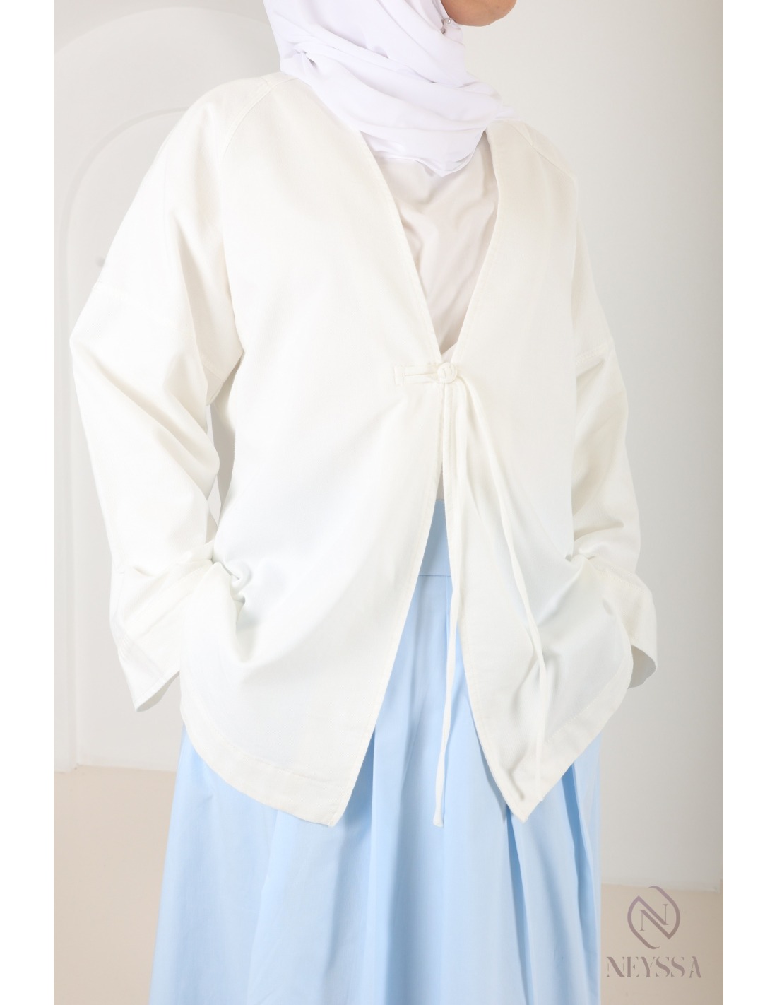 - Kimono-style jacket: Discreet button fastening at the front.
