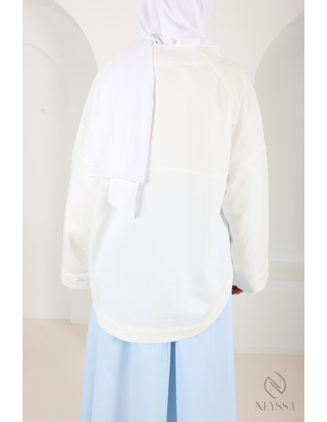 - Oversized fit: Its loose, lightweight cut offers a natural drape, ideal for an elegant and comfortable look.