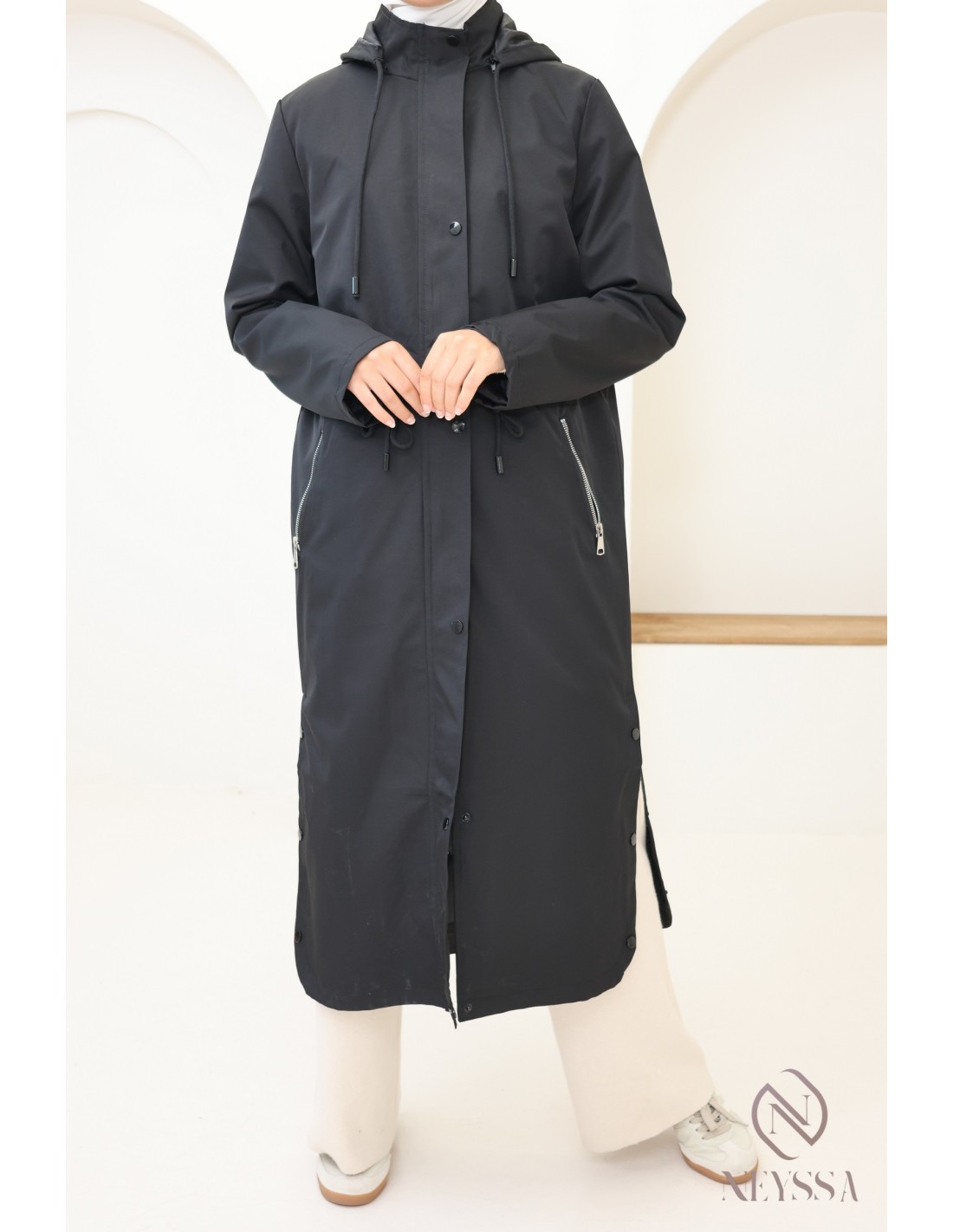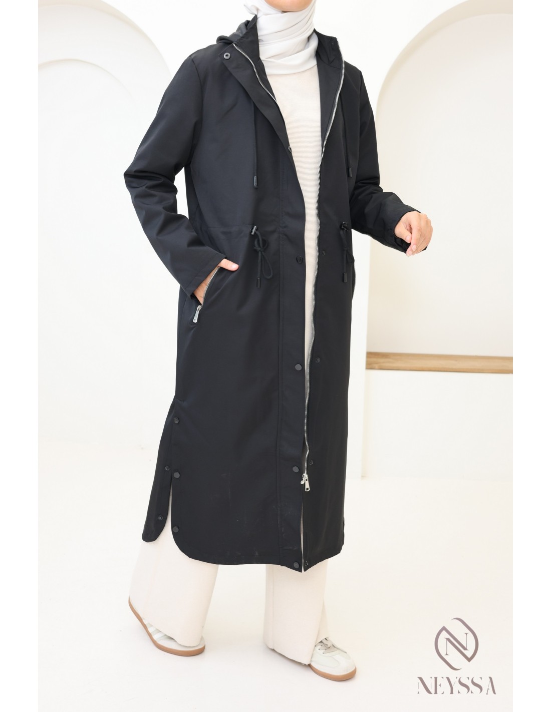 Trendy straight-cut long jacket for hijabi women: ideal for rainy weather