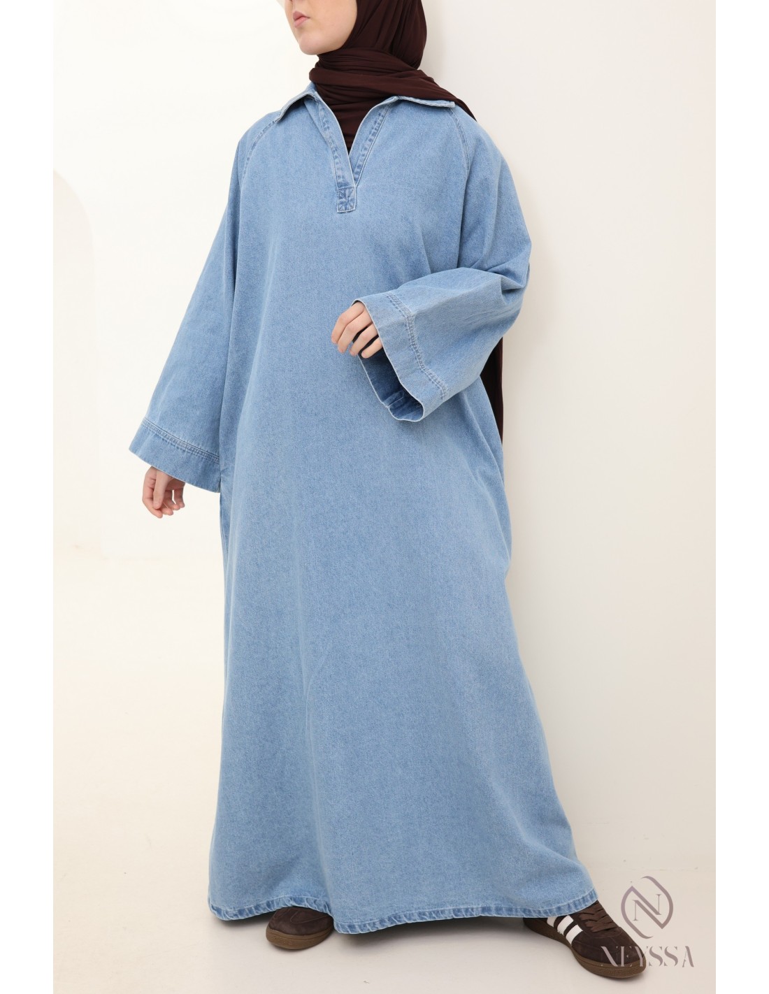 • Casual chic look: Denim dress worn with a flowing beige hijab, white trainers and a structured tote bag for a comfortable and elegant everyday style.